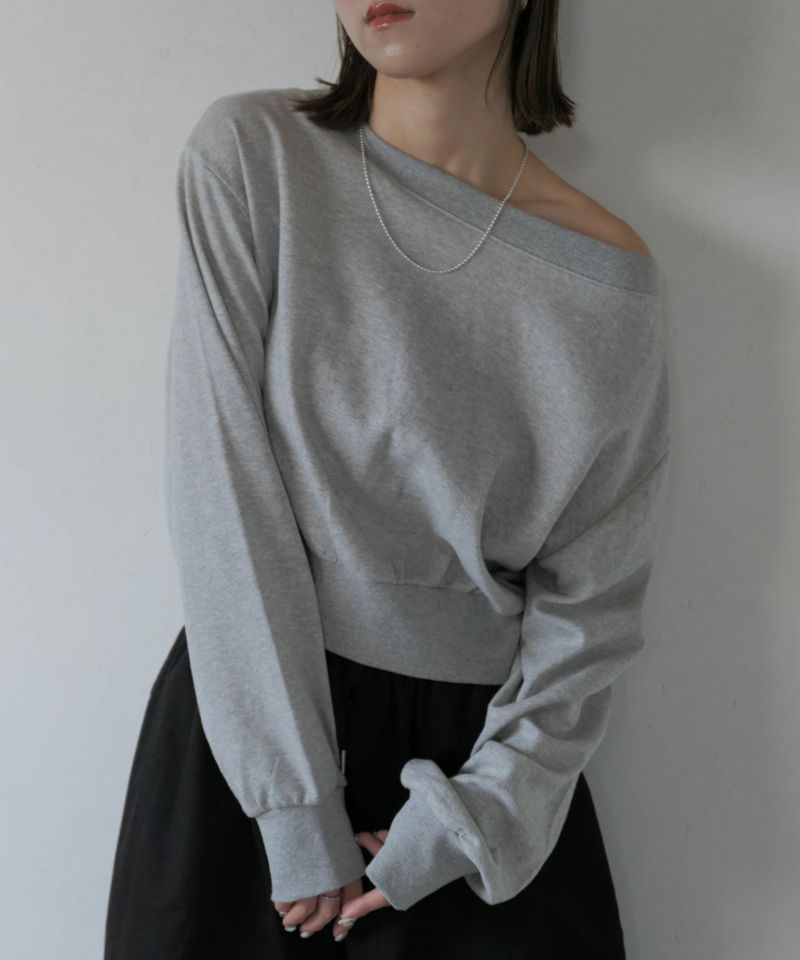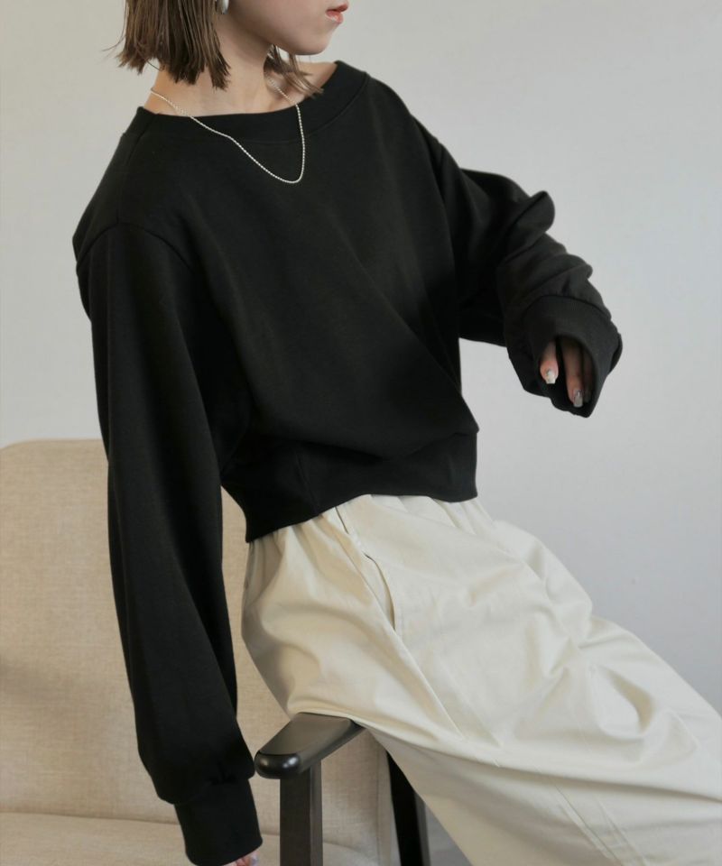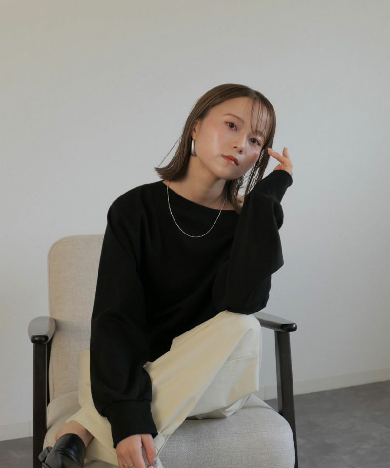 広めに開いた襟元がデコルテを美しく見せてくれる 大人のきれいめスウェット。 裾と袖口部分は広めなリブにし、 丈は短すぎず身幅はゆったりとしたサイズ感で 仕立てられたスウェットは絶妙なバランスが 美シルエットの優秀スウェット。