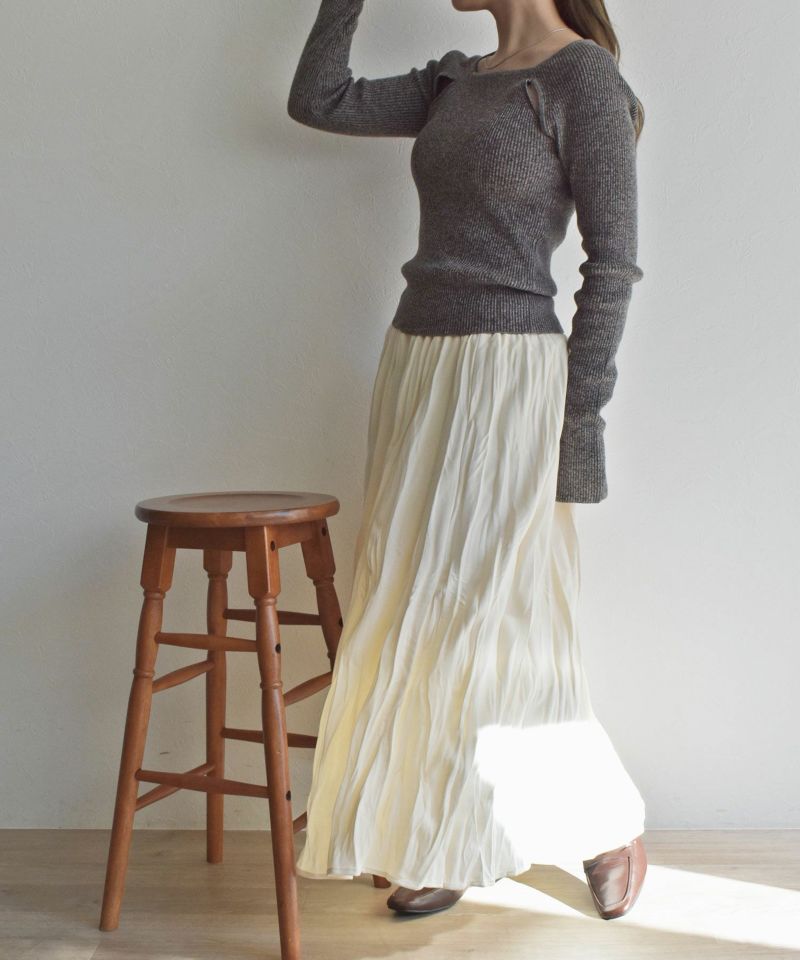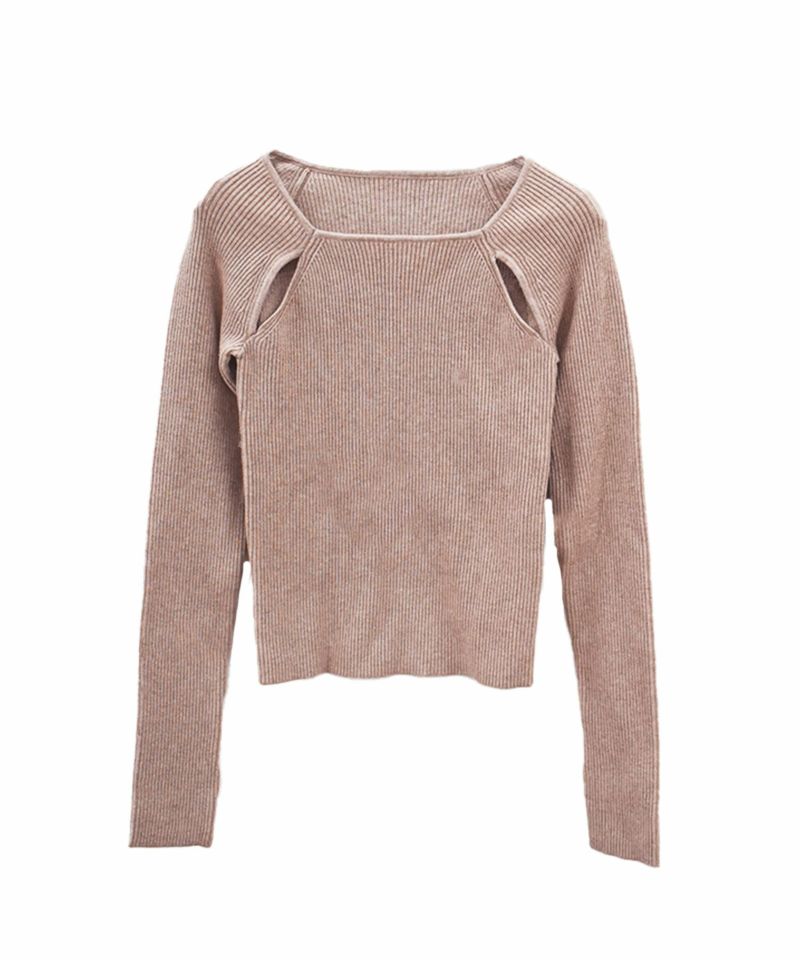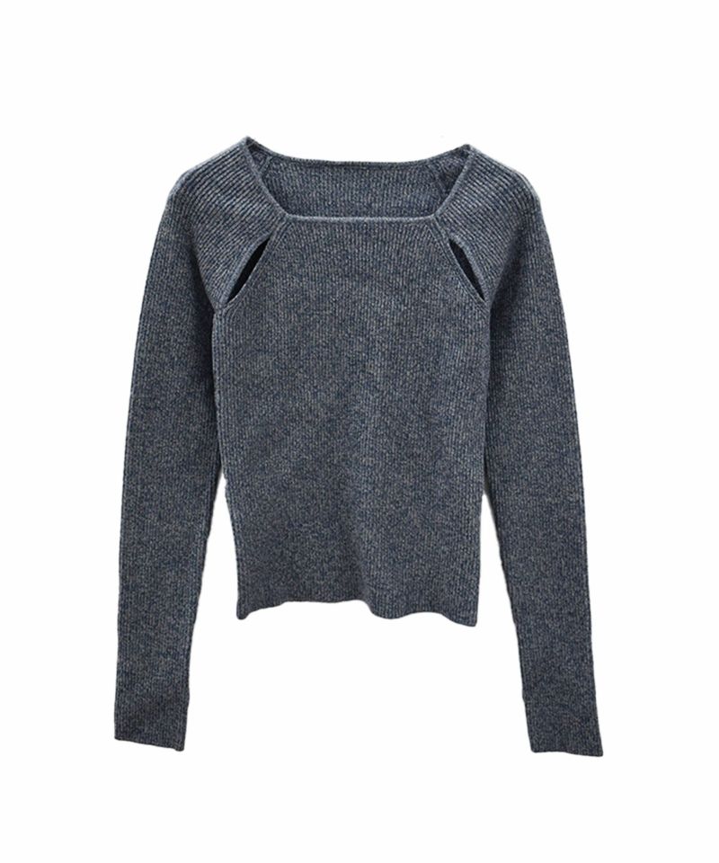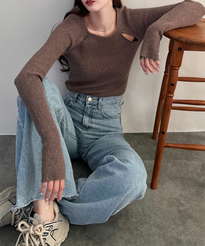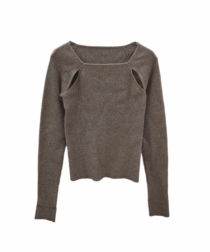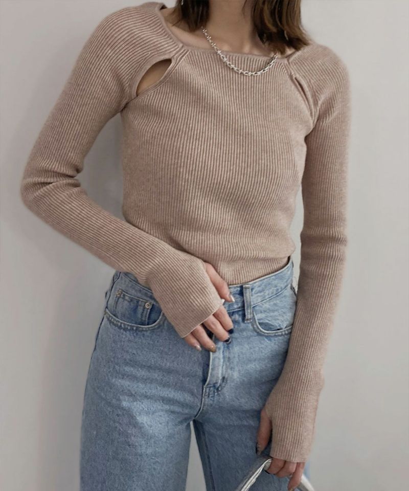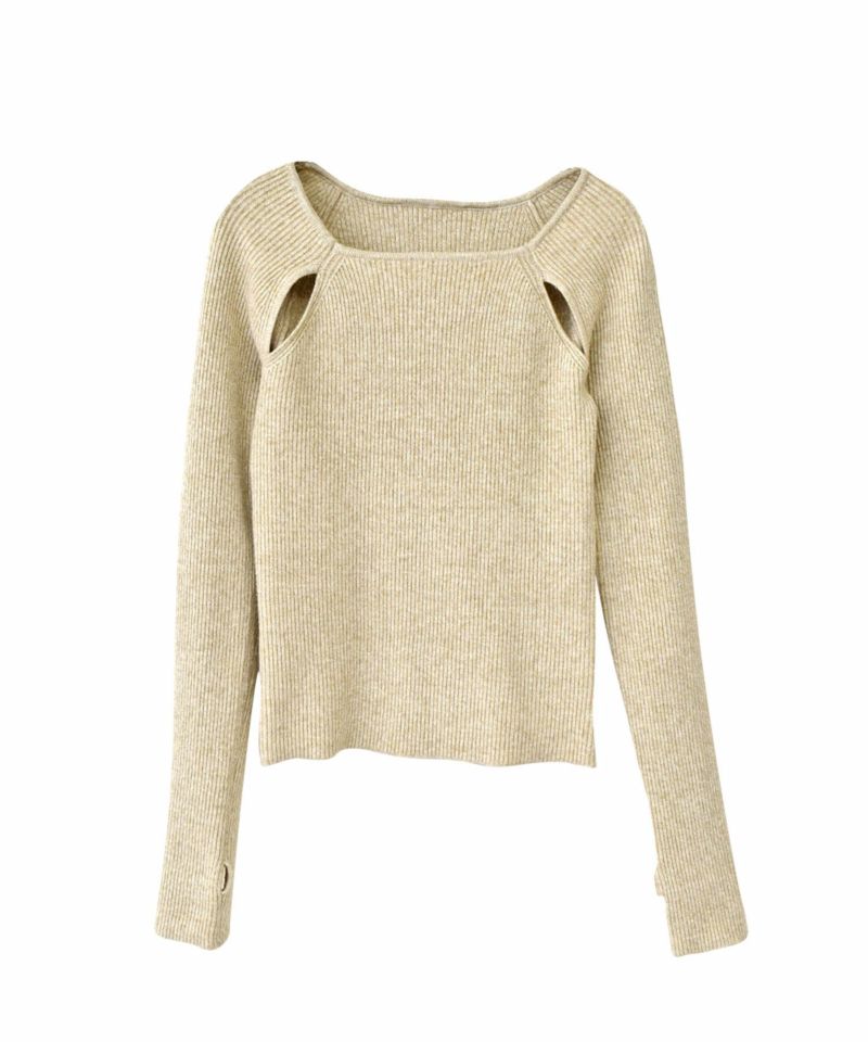 ちらっと肌がのぞくトレンドの カットオフデザインがアクセントのニット。 ヘルシーな肌見せがかないます♡