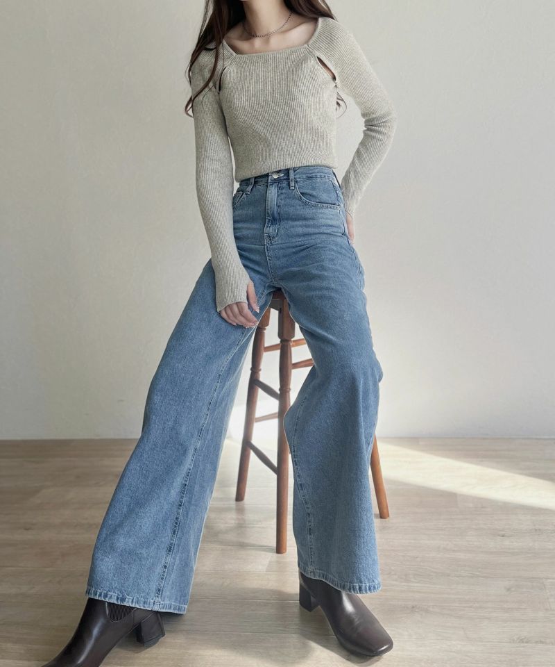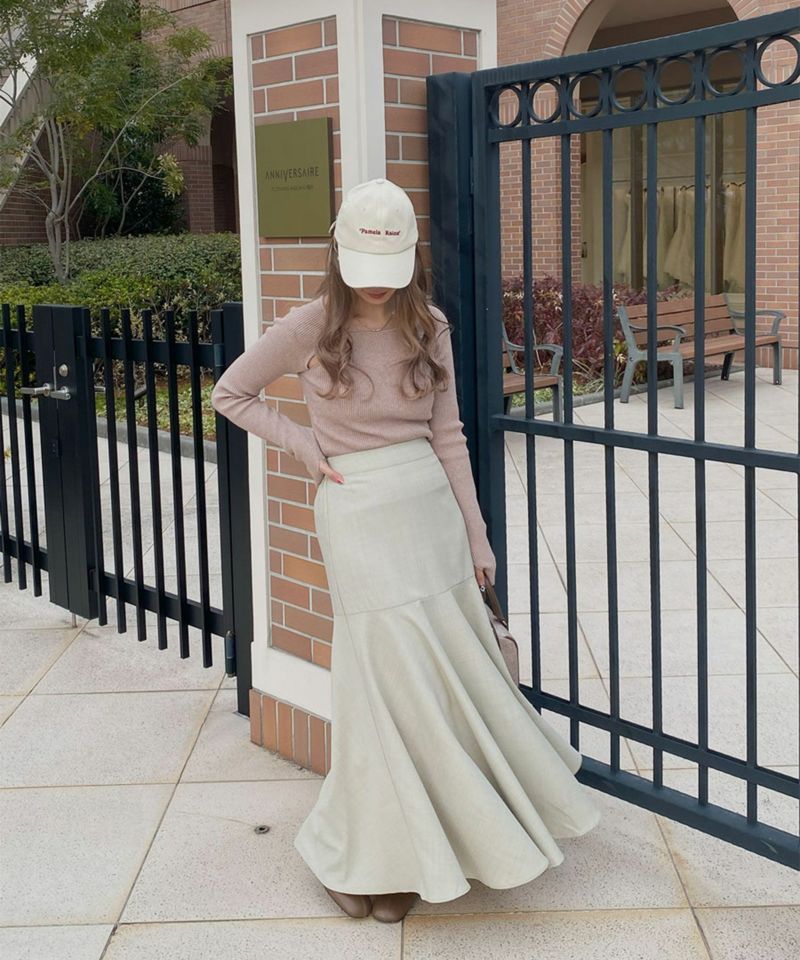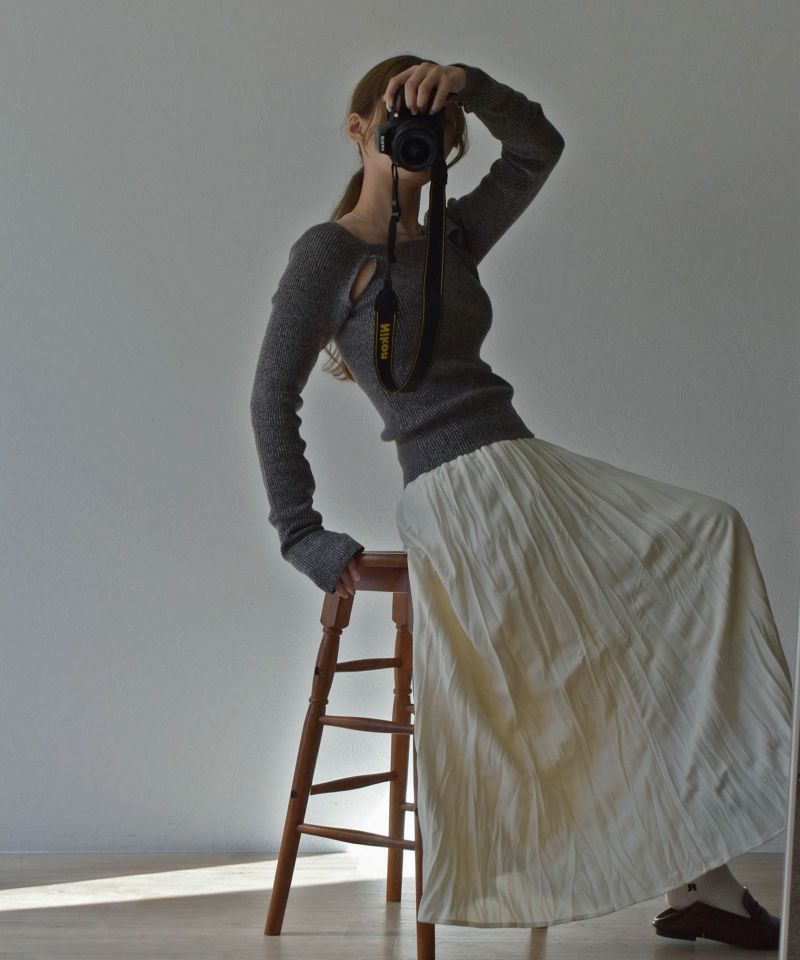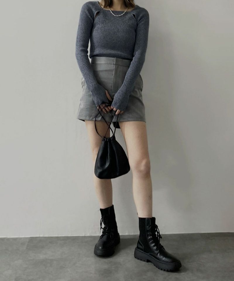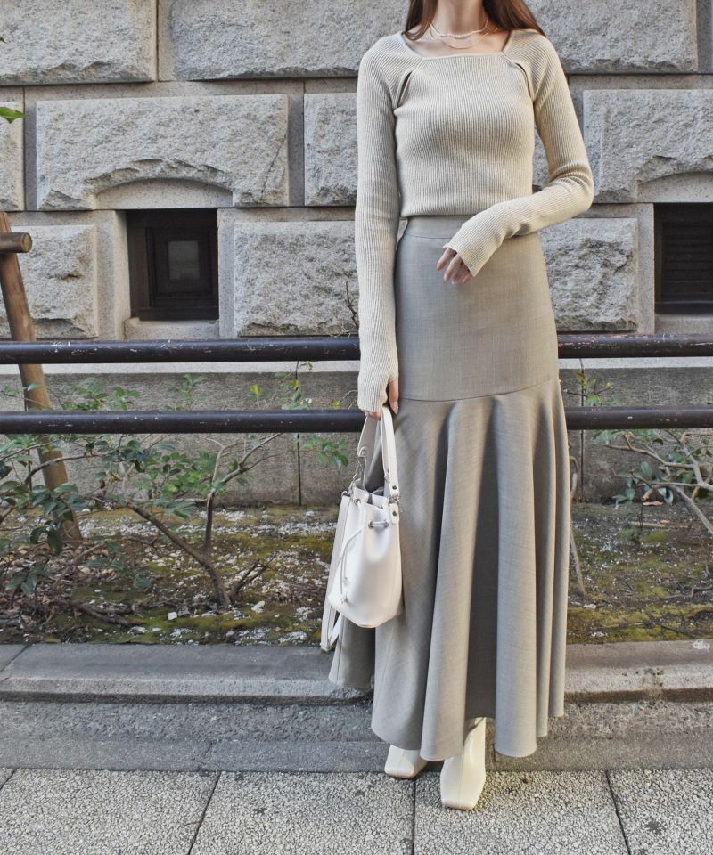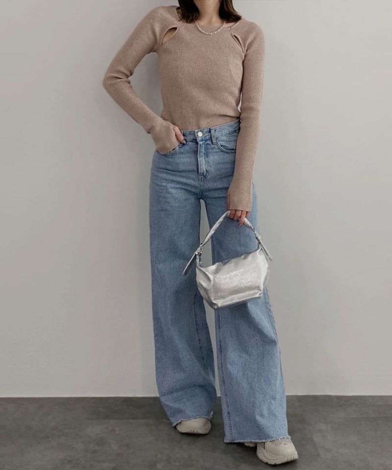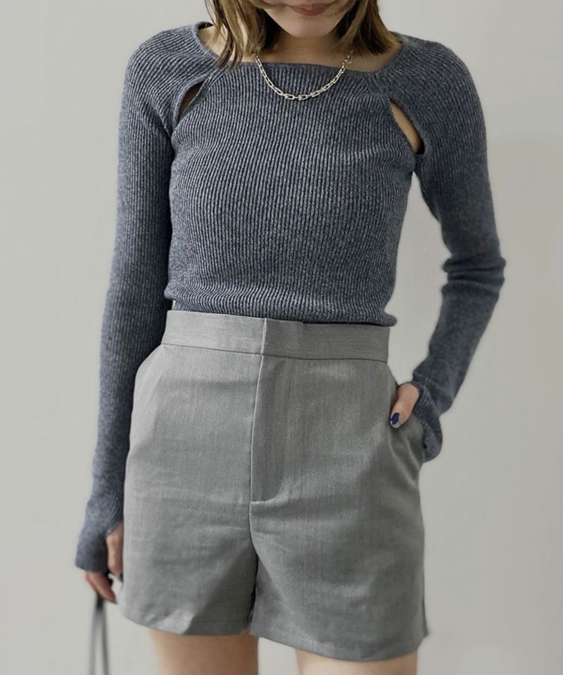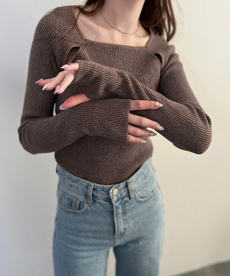ちらっと肌がのぞくトレンドの カットオフデザインがアクセントのニット。 ヘルシーな肌見せがかないます♡