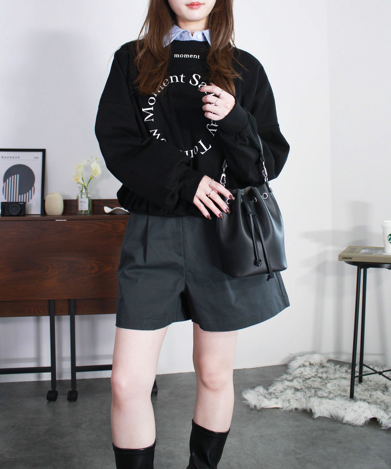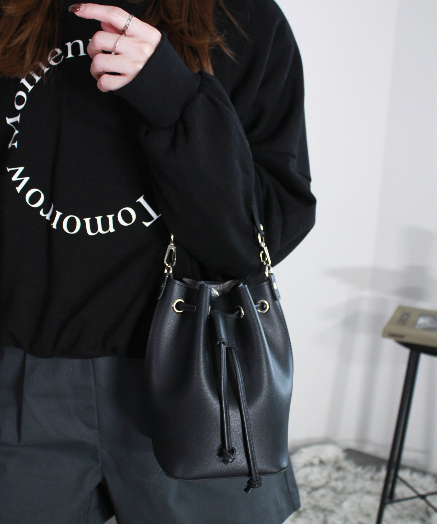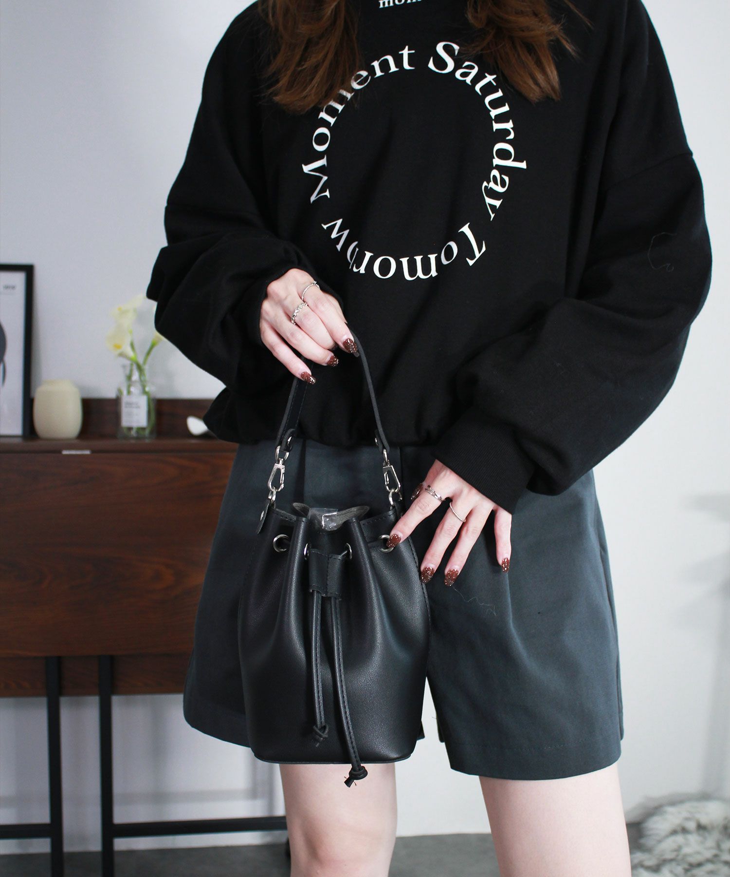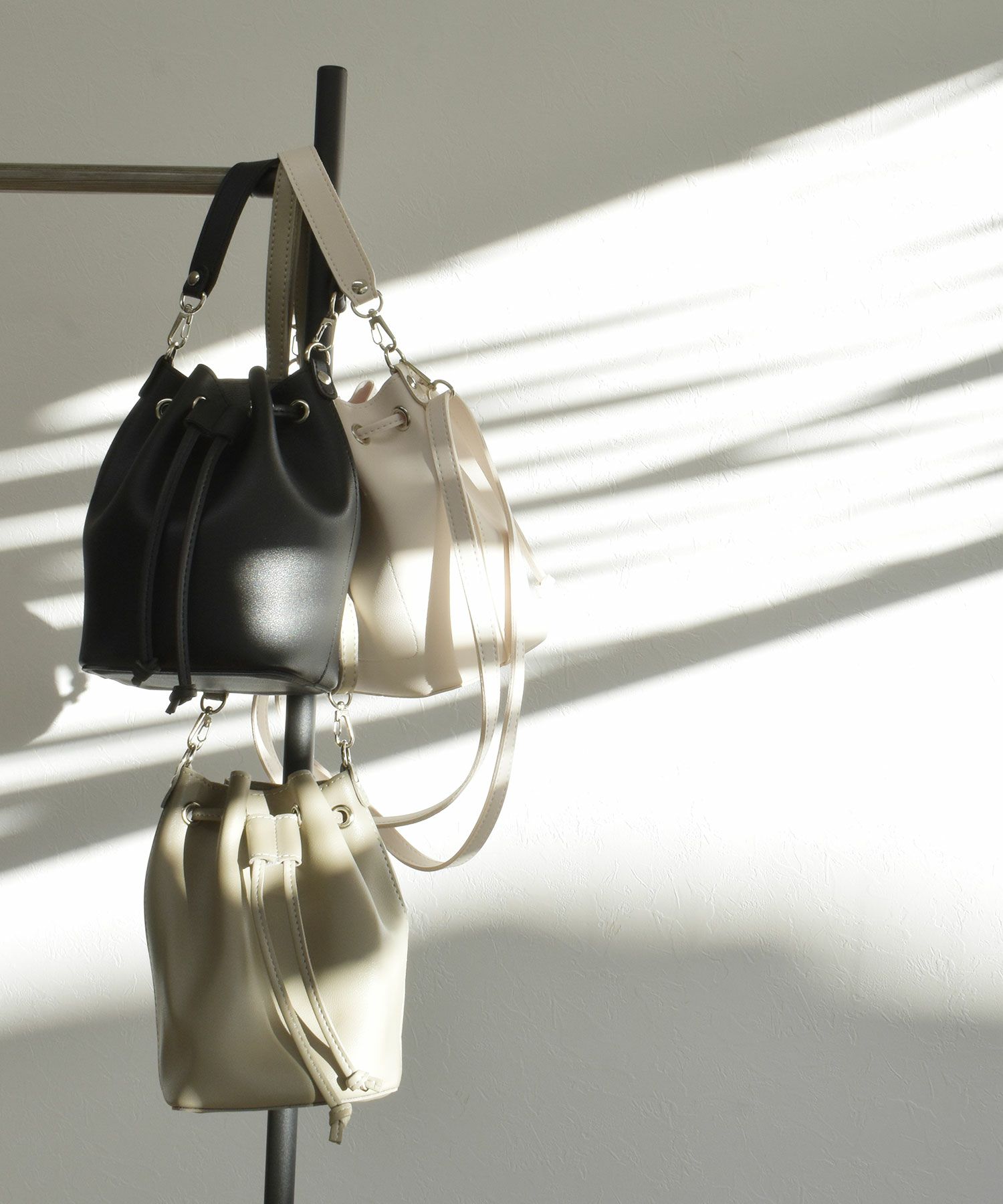 コロンとしたサイズ感がかわいい♡ 開閉しやすい巾着バッグ 使いやすい定番のブラックとブラウンに、 グレイッシュなカーキをプラスしたカラーバリエーション。