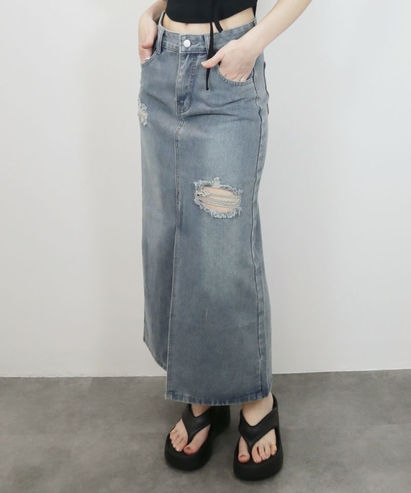 ヴィンテージ感溢れるダメージ加工が魅力。 程よい色落ちとラフなクラッシュディテールが、 こなれ感を演出してくれます◎ ややハイウエストな作りなので脚長効果も抜群。 fabric 厚地すぎないデニム素材。 暑い時期にも抵抗感なくご着用いただけます。 style カジュアルなアイテムとの相性抜群◎ 旬なクロップドTや、ロゴTと合わせるだけで 簡単にトレンドライクなコーディネートに◎ SOLD OUTの場合もぜひ「入荷お知らせメール」をご利用ください。 再販売の際にメールでご連絡させていただきます。 ※商品によっては再入荷しない場合もございます。 スタッフレビュー 152cmFREEサイズ着用: 夏のマストアイテムのデニムスカート!Sサイズはペタンコ靴でもローライズで問題なく着れます◎ 低身長さんにもぜひおすすめしたいアイテムです!