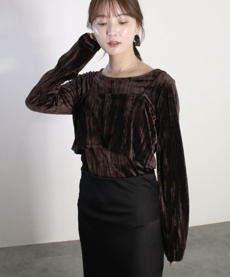 落ち着いた色味が印象的な、ベロアの長袖トップスとビスチェセット。