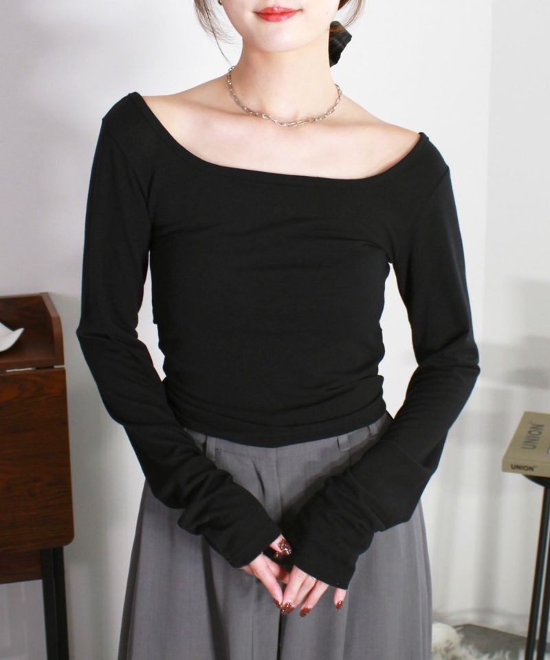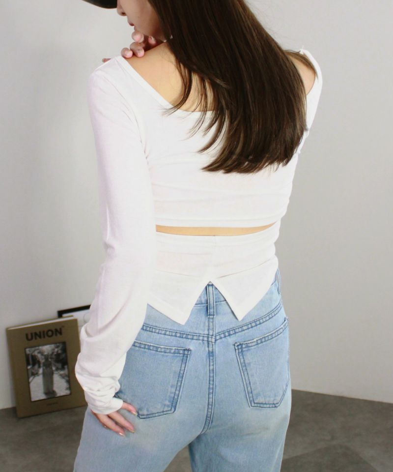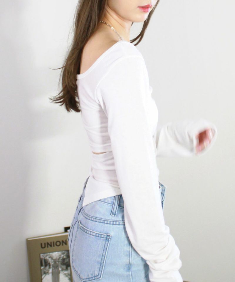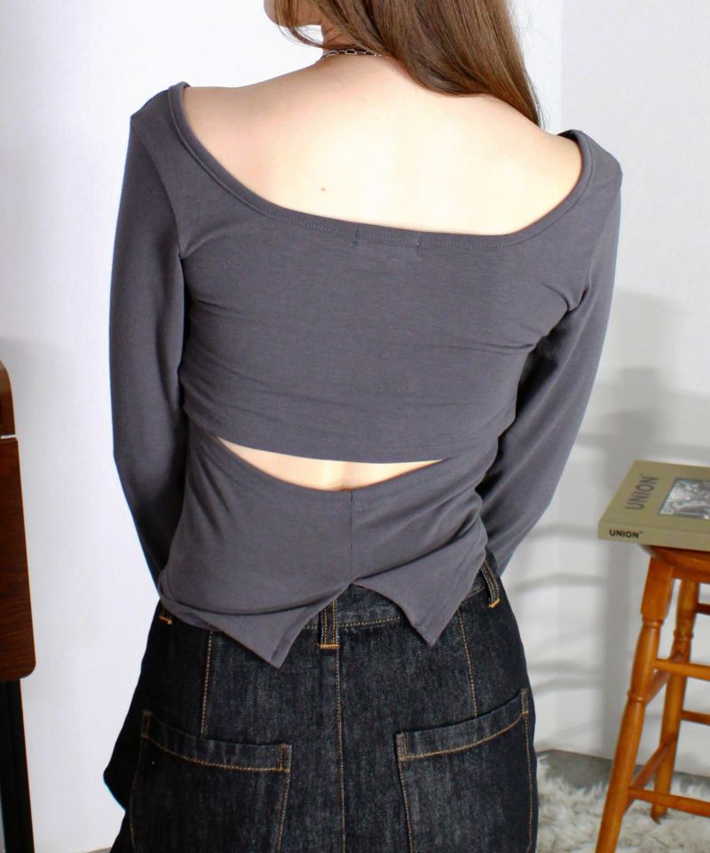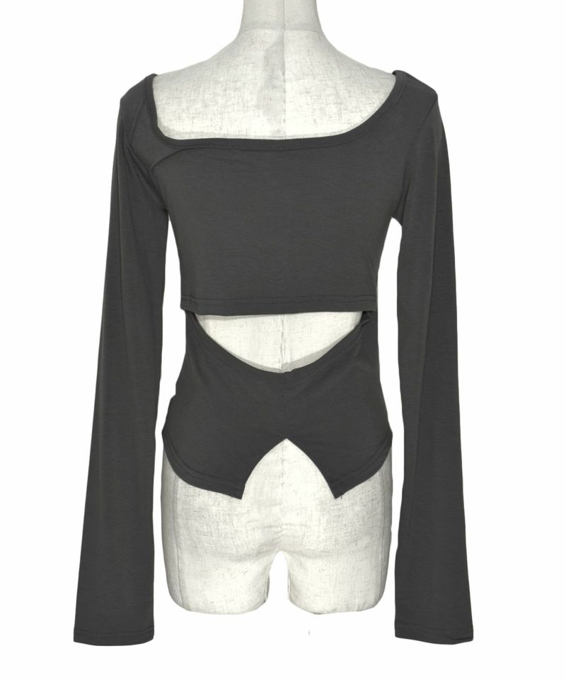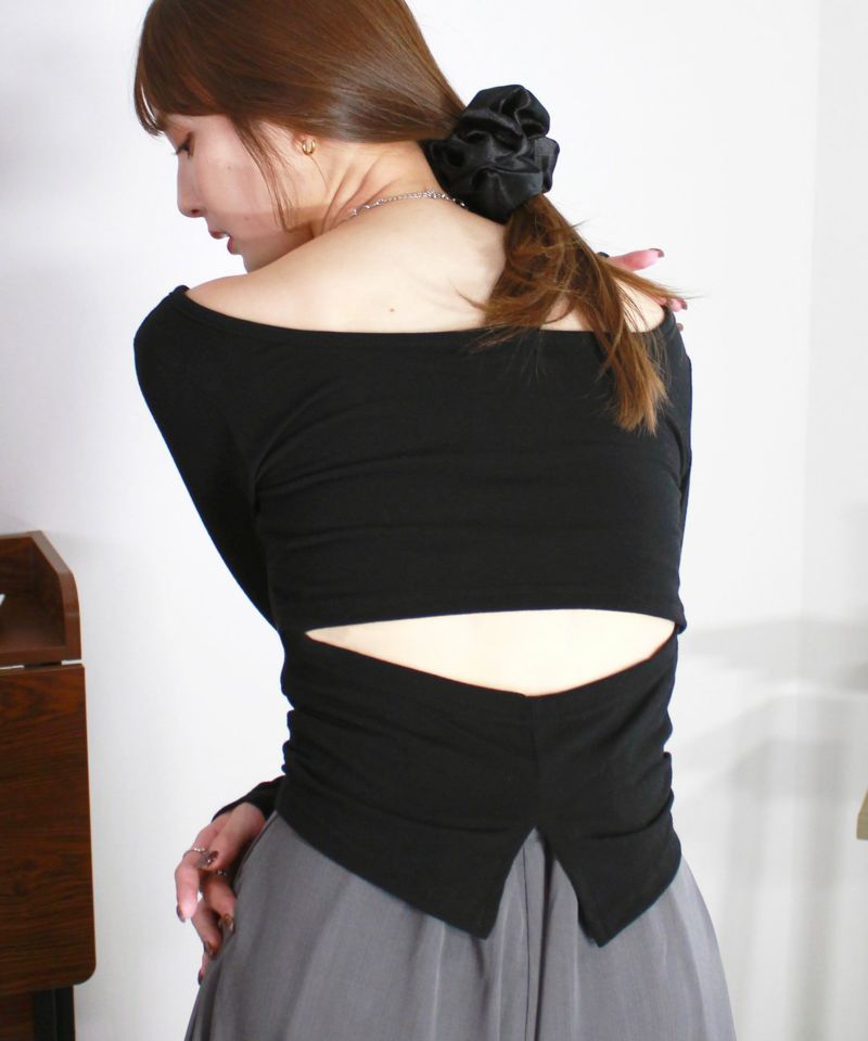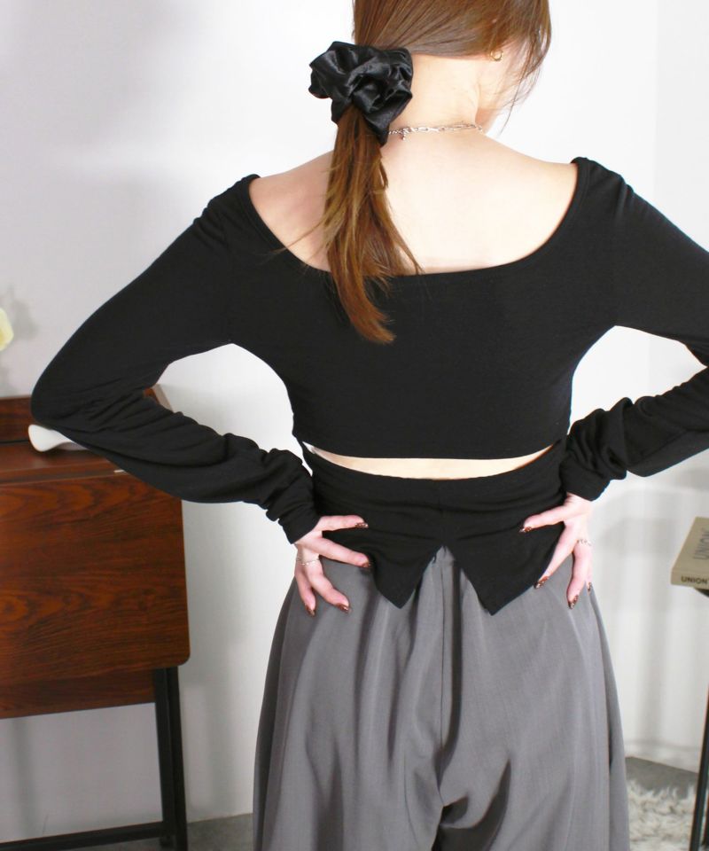 フロントはシンプルかつ洗練されたスクエアネックで、デコルテラインを美しく見せる長袖トップス。 バックスタイルは大胆なカッティングが特徴で、腰元にかけて曲線を描くように開いたデザインが印象的。 前後で表情がガラリと変わるため、一枚で主役級の存在感を放ちます。