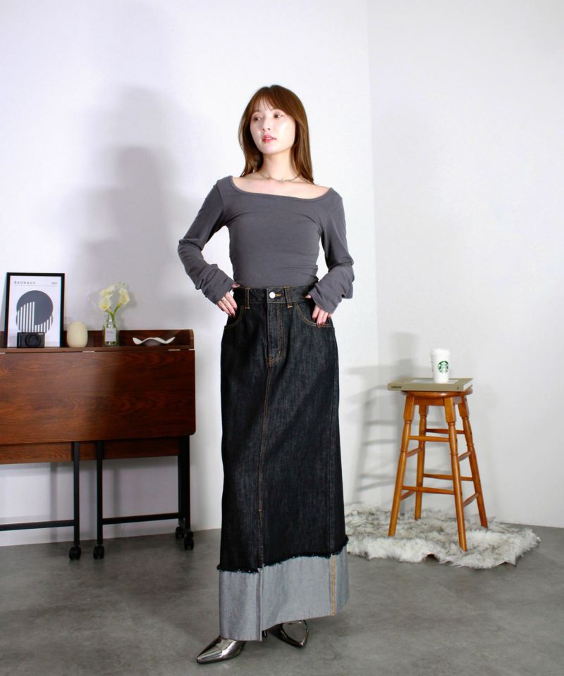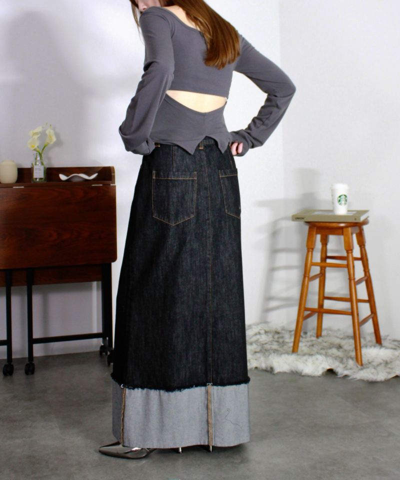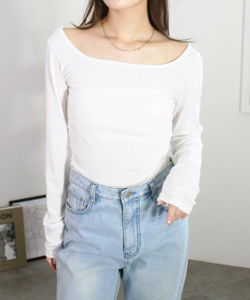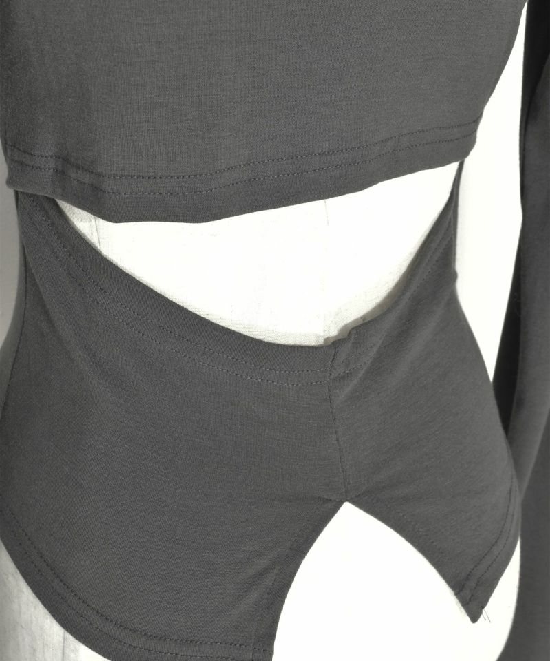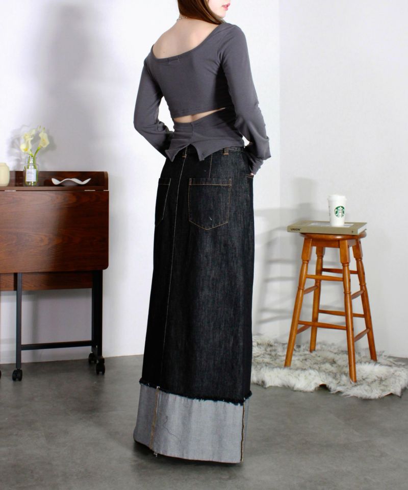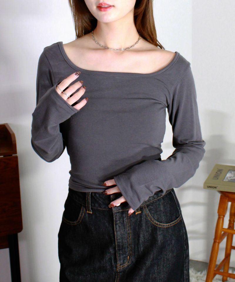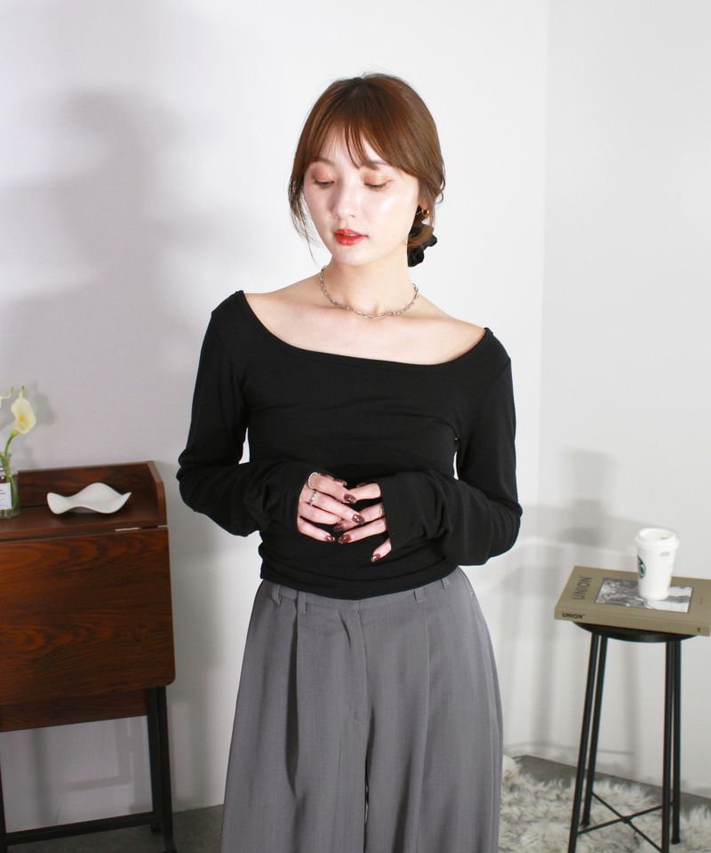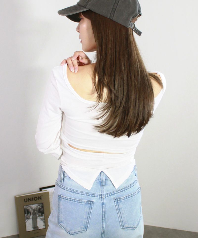 フロントはシンプルかつ洗練されたスクエアネックで、デコルテラインを美しく見せる長袖トップス。 バックスタイルは大胆なカッティングが特徴で、腰元にかけて曲線を描くように開いたデザインが印象的。 前後で表情がガラリと変わるため、一枚で主役級の存在感を放ちます。