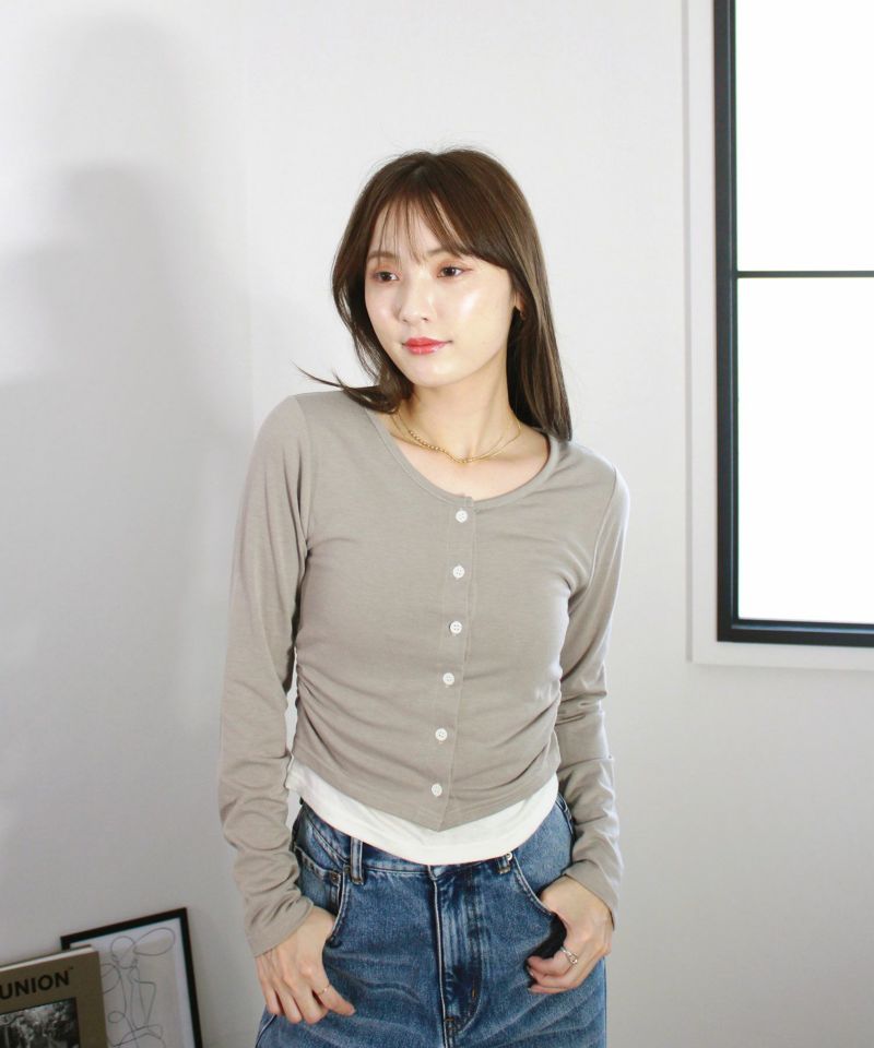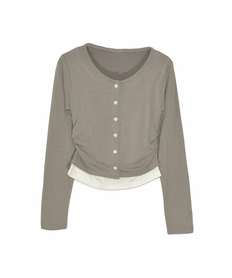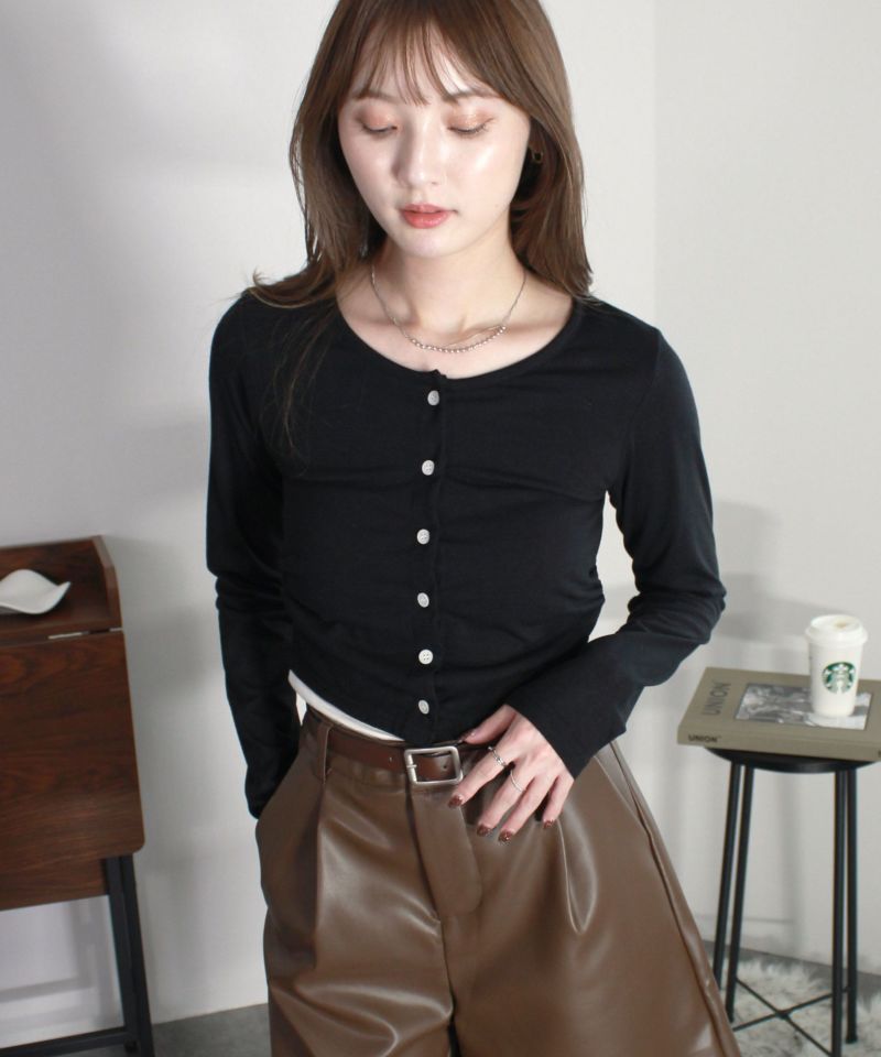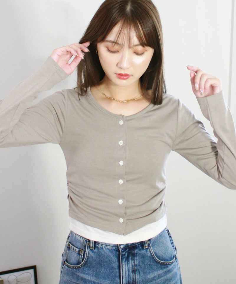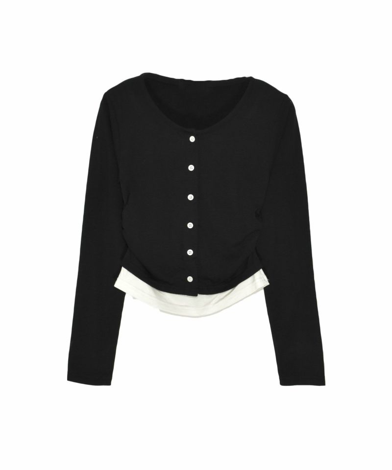 シンプルながらもモード感を感じさせるカーディガン風トップス。 フロントに並ぶ小ぶりなホワイトボタンがクラシカルな印象を与えます。 裾からのぞくホワイトのレイヤードデザインが、まるでシャツを重ね着しているような洒落感をプラス。 ベーシックなシルエットの中に、抜け感と遊び心を取り入れた一枚です。