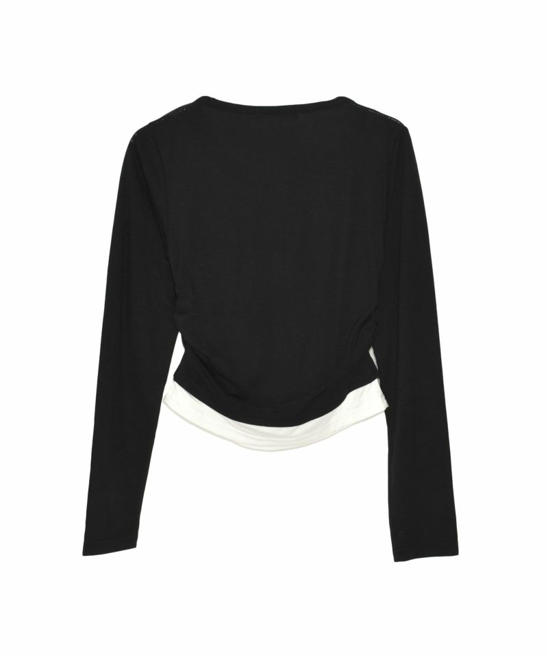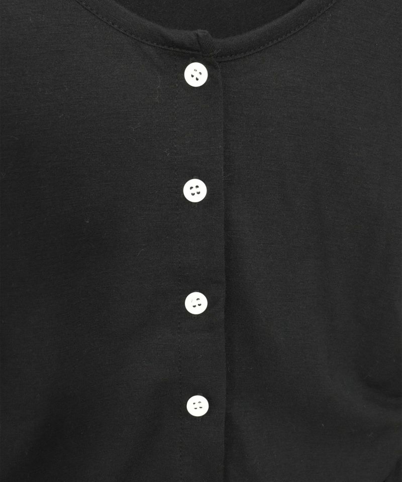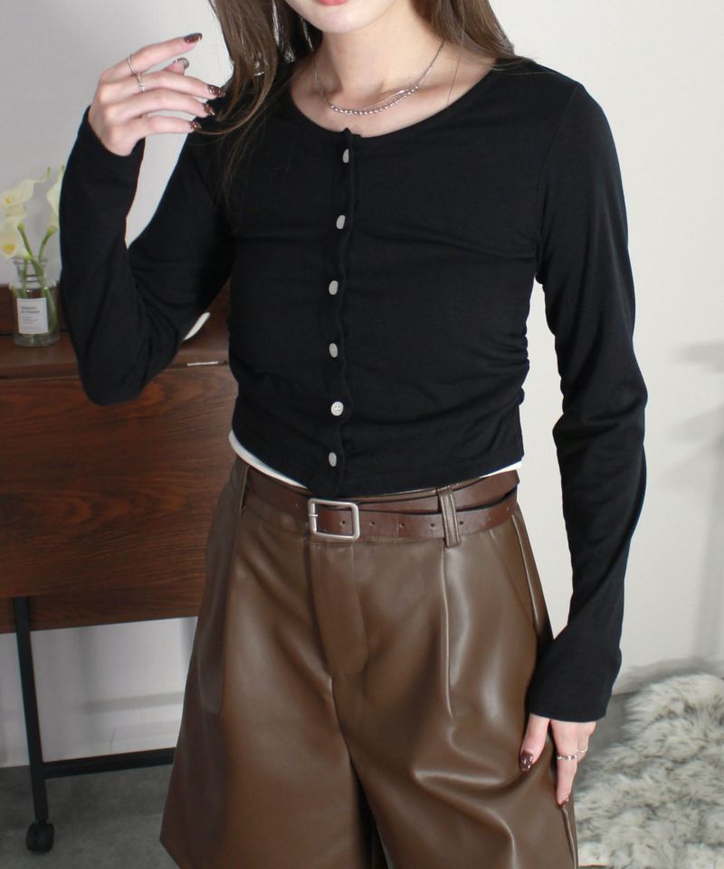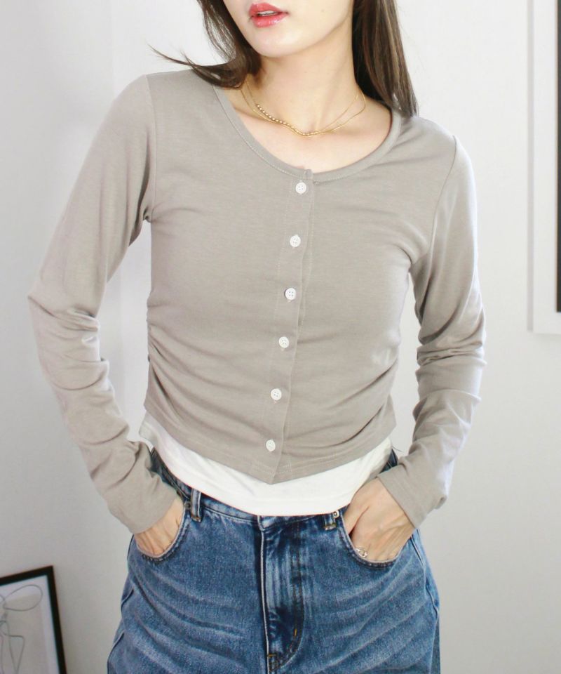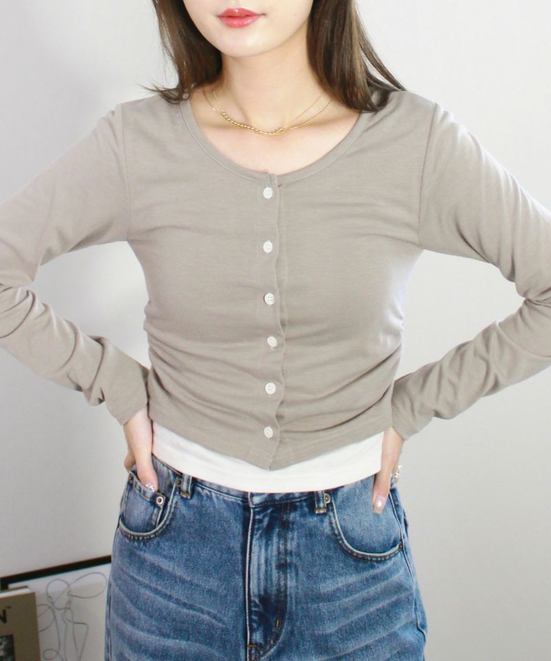 シンプルながらもモード感を感じさせるカーディガン風トップス。 フロントに並ぶ小ぶりなホワイトボタンがクラシカルな印象を与えます。 裾からのぞくホワイトのレイヤードデザインが、まるでシャツを重ね着しているような洒落感をプラス。 ベーシックなシルエットの中に、抜け感と遊び心を取り入れた一枚です。