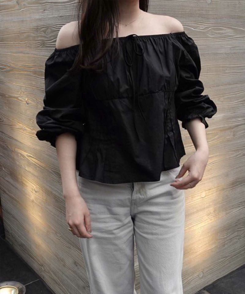 さりげない肌見せが叶う、オフショルダー仕様のブラウス。