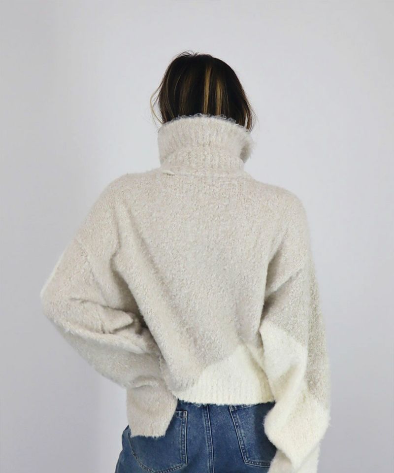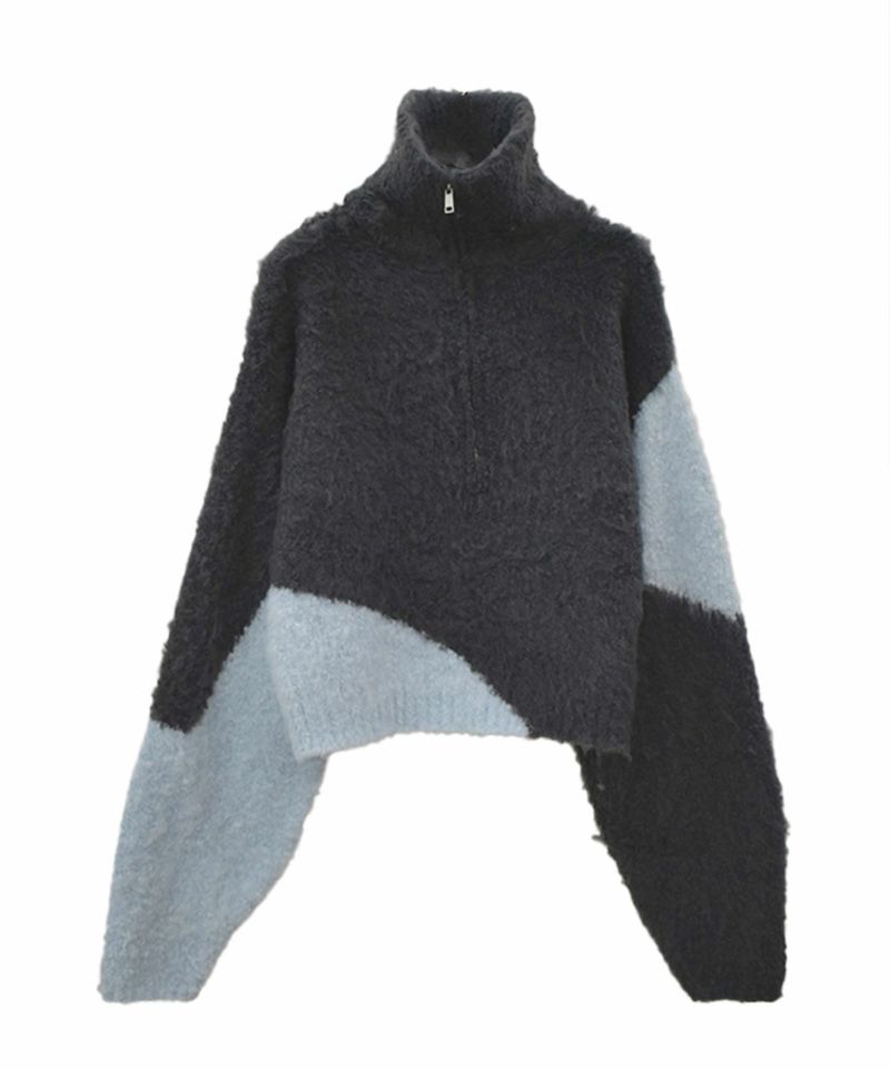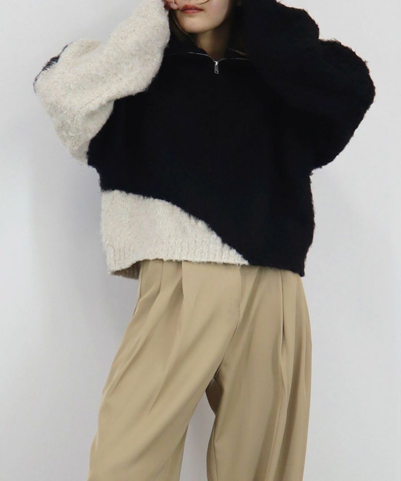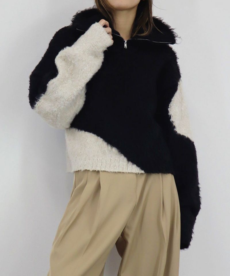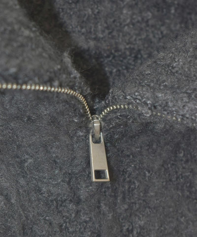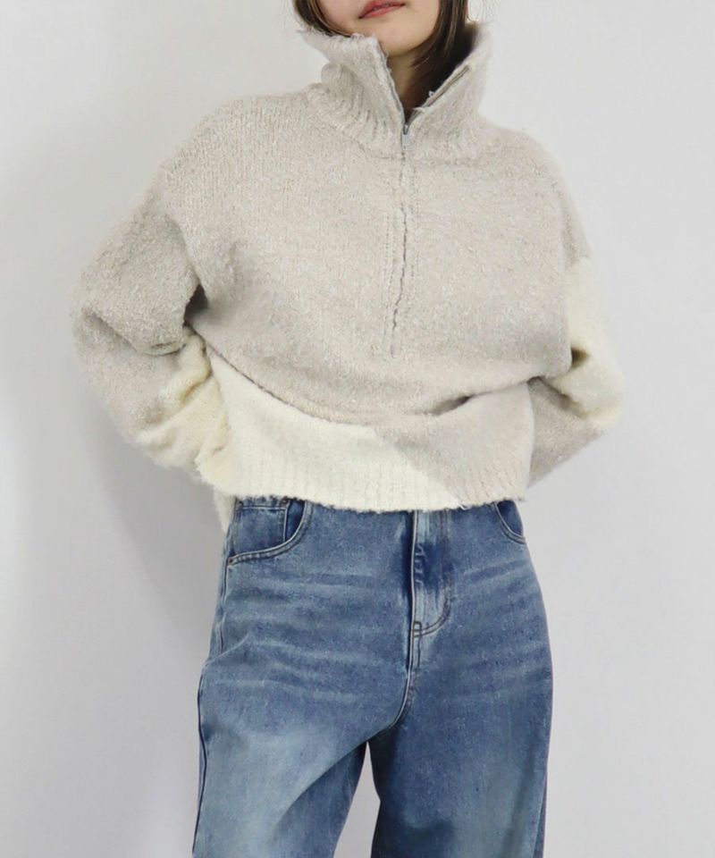 柔らかなブークレ素材を使用したハイネックプルオーバー。 ニュアンスパターン柄がシンプルながらも存在感のあるアイテム。 1枚でコーディネートの主役になってくれます◎ 首元はハーフジップになっているので、 合わせるアイテムやシーンに合わせて 違った着こなしを楽しめるのも魅力のひとつ。