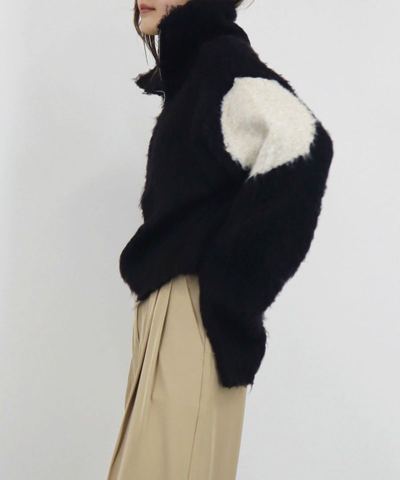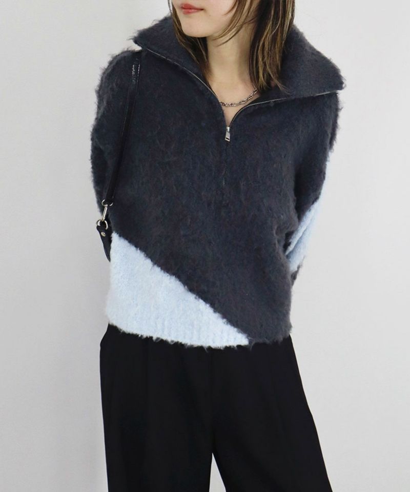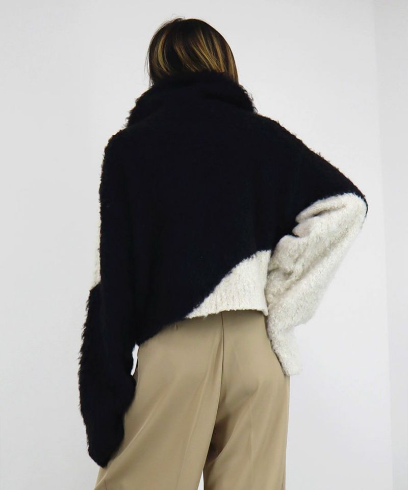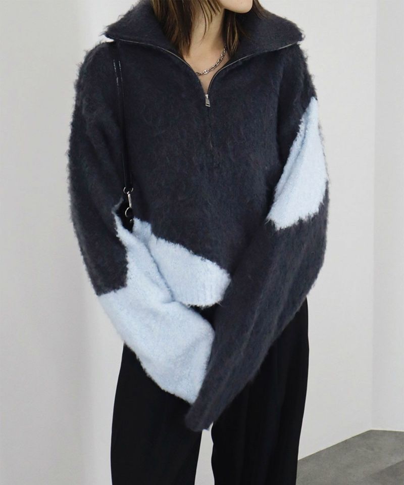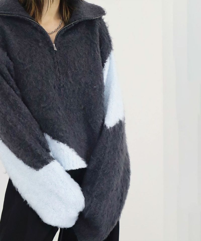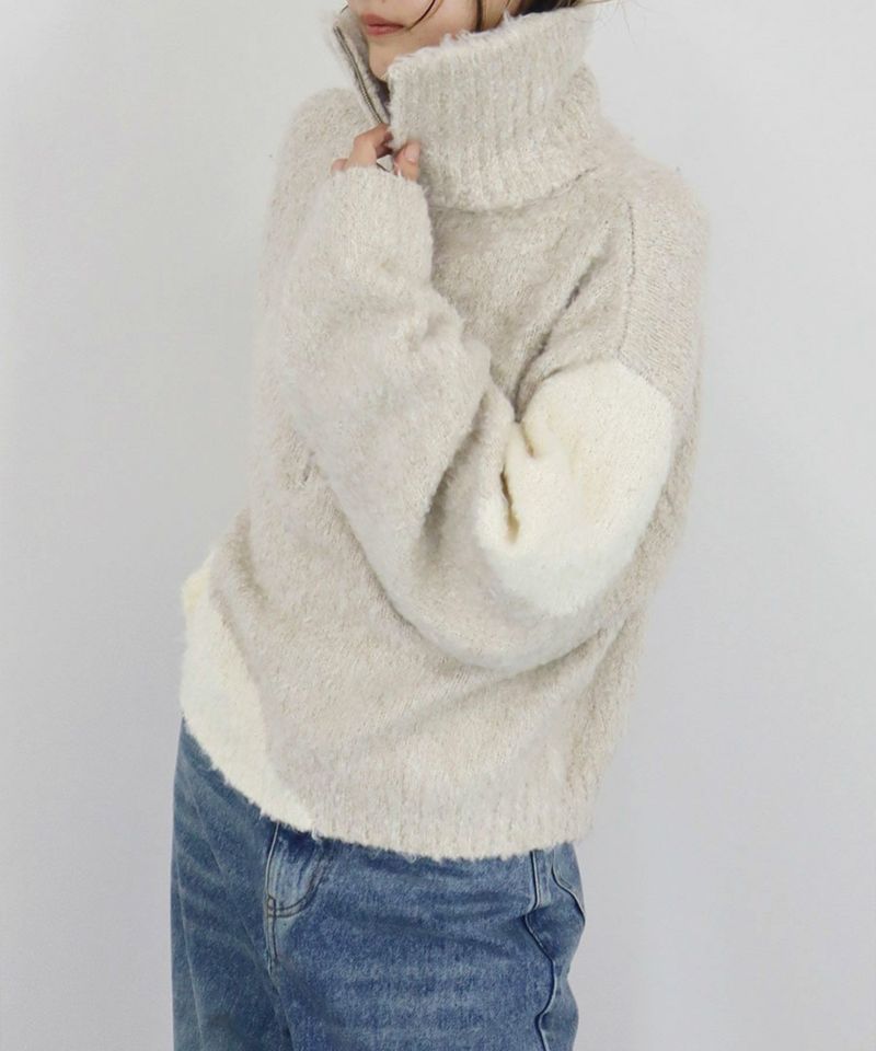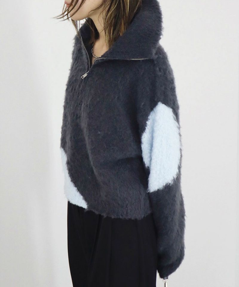 柔らかなブークレ素材を使用したハイネックプルオーバー。 ニュアンスパターン柄がシンプルながらも存在感のあるアイテム。 1枚でコーディネートの主役になってくれます◎ 首元はハーフジップになっているので、 合わせるアイテムやシーンに合わせて 違った着こなしを楽しめるのも魅力のひとつ。