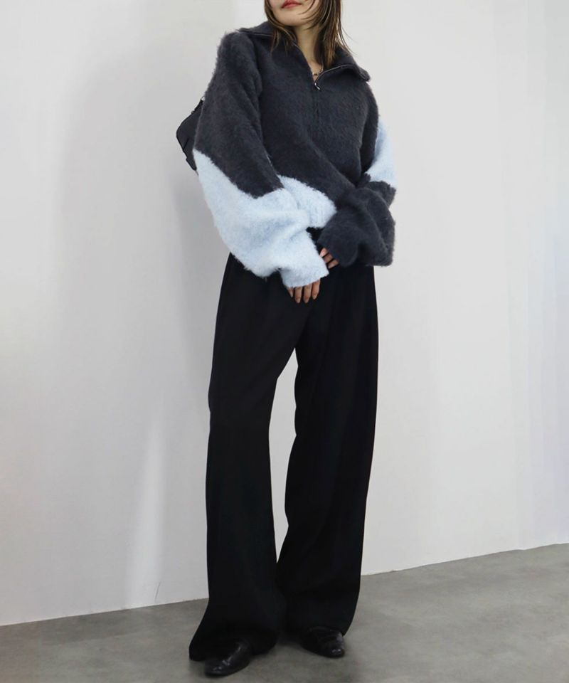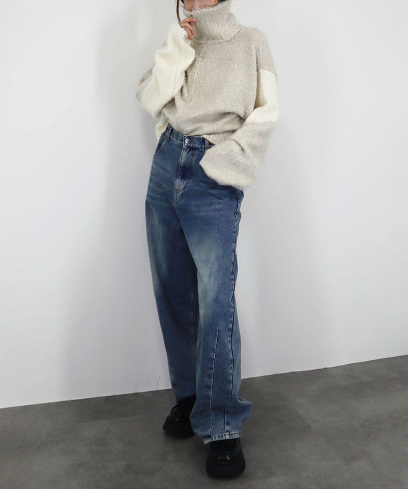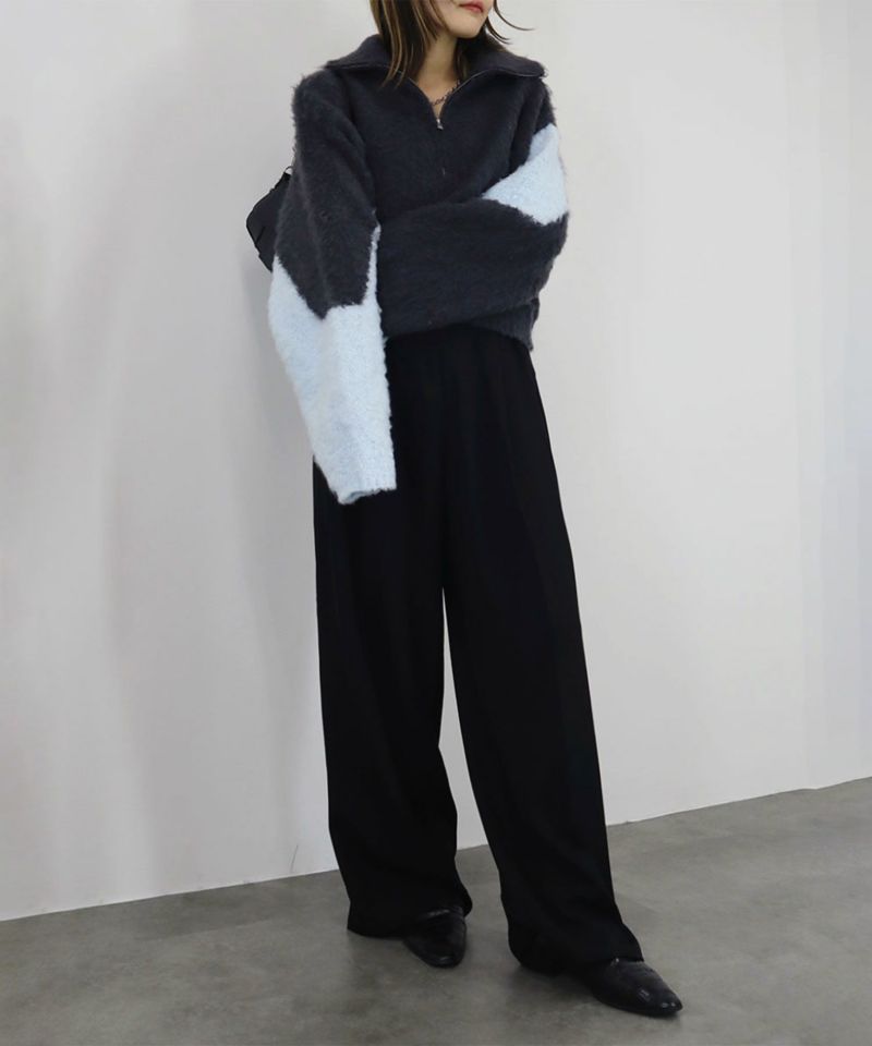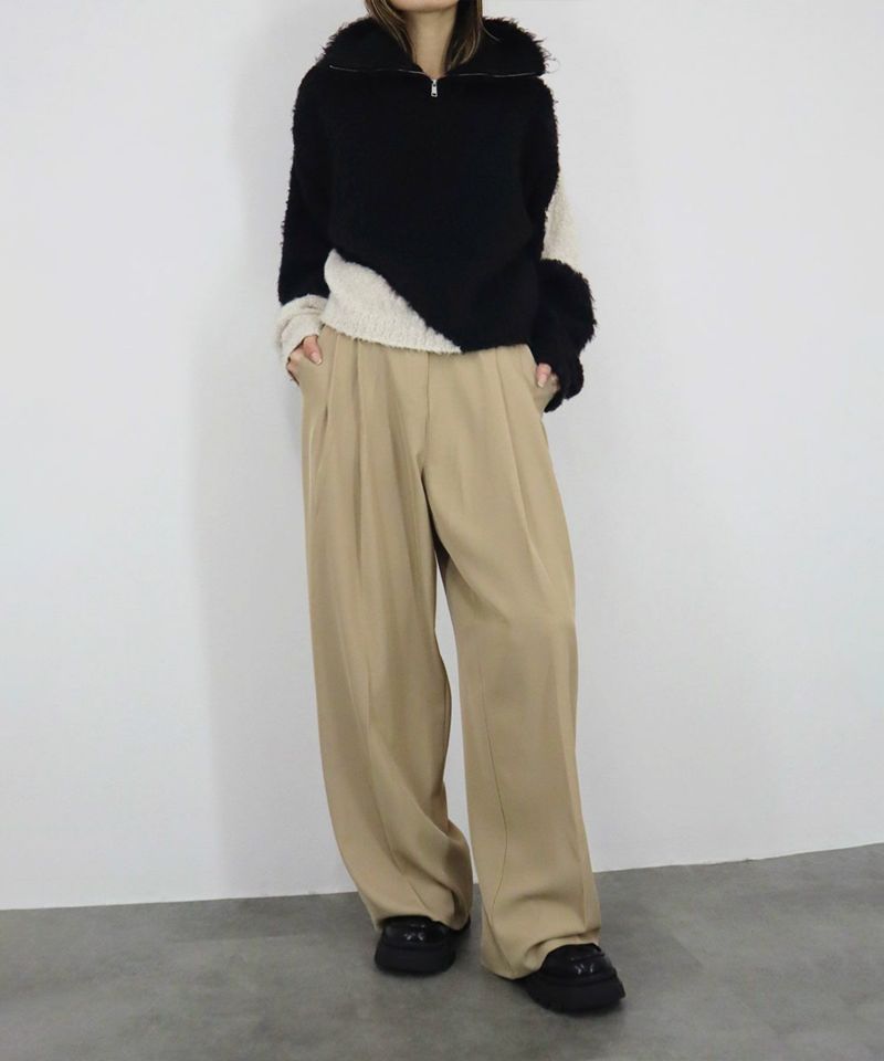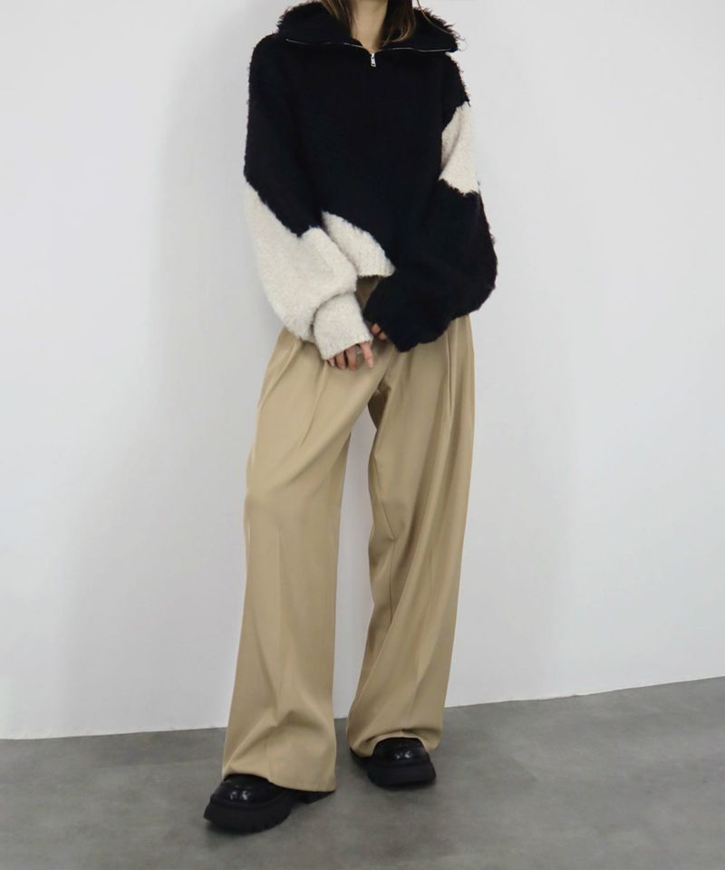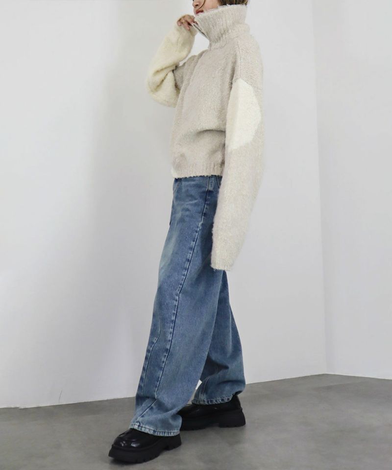 柔らかなブークレ素材を使用したハイネックプルオーバー。 ニュアンスパターン柄がシンプルながらも存在感のあるアイテム。 1枚でコーディネートの主役になってくれます◎ 首元はハーフジップになっているので、 合わせるアイテムやシーンに合わせて 違った着こなしを楽しめるのも魅力のひとつ。