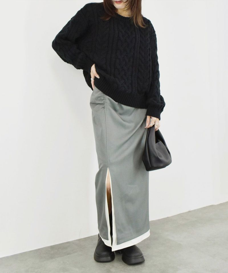 ひとクセデザインが魅力のスカートを合わせて今年らしい着こなしも。