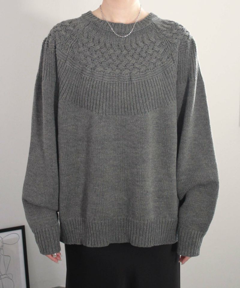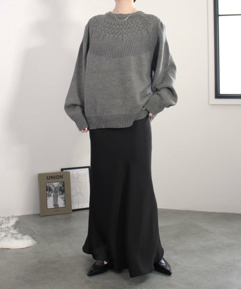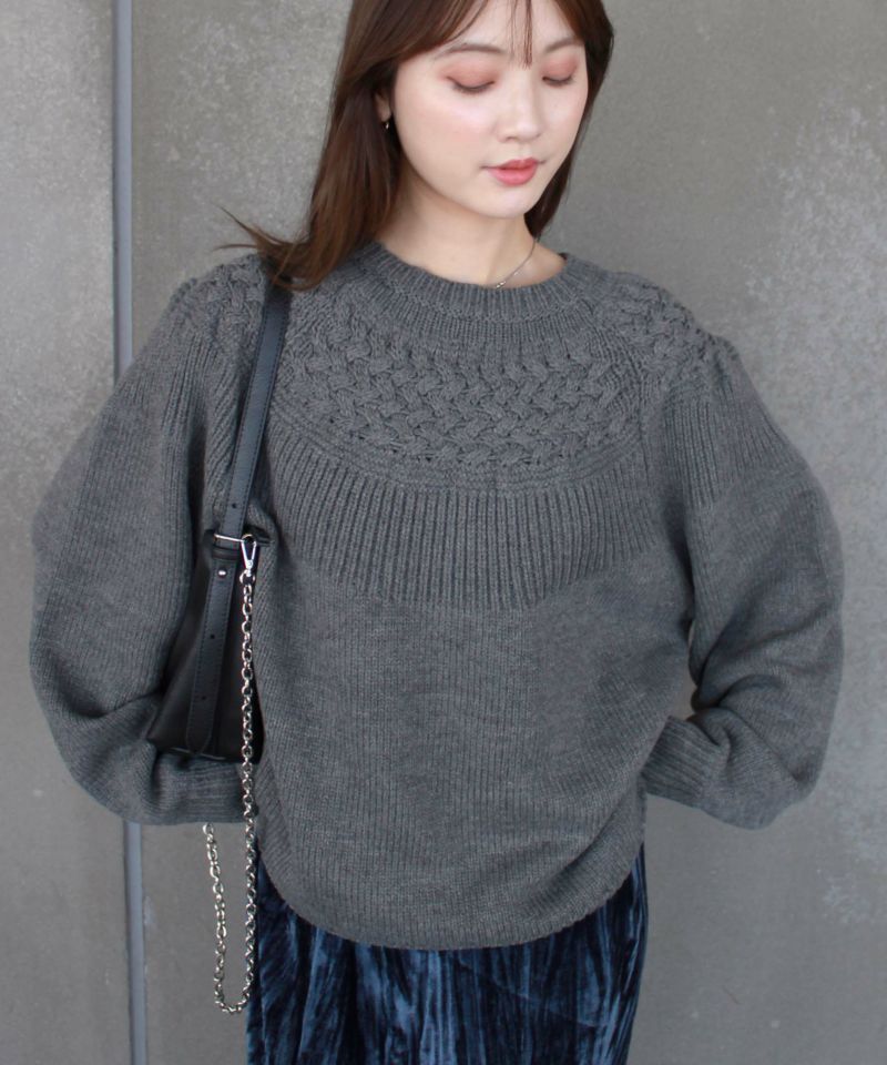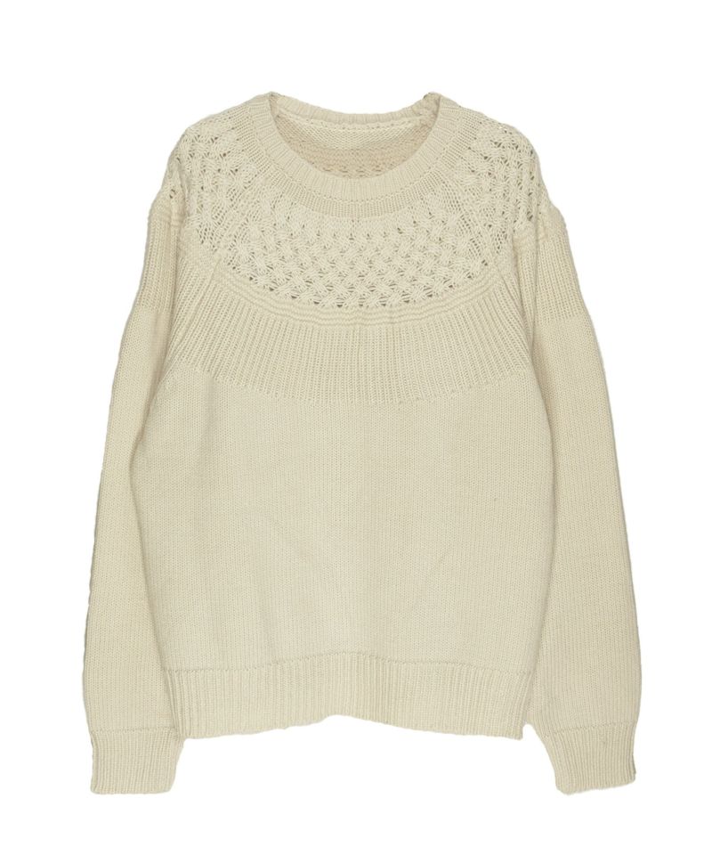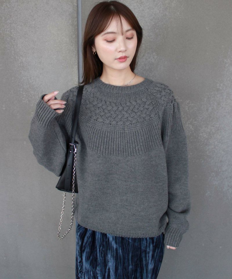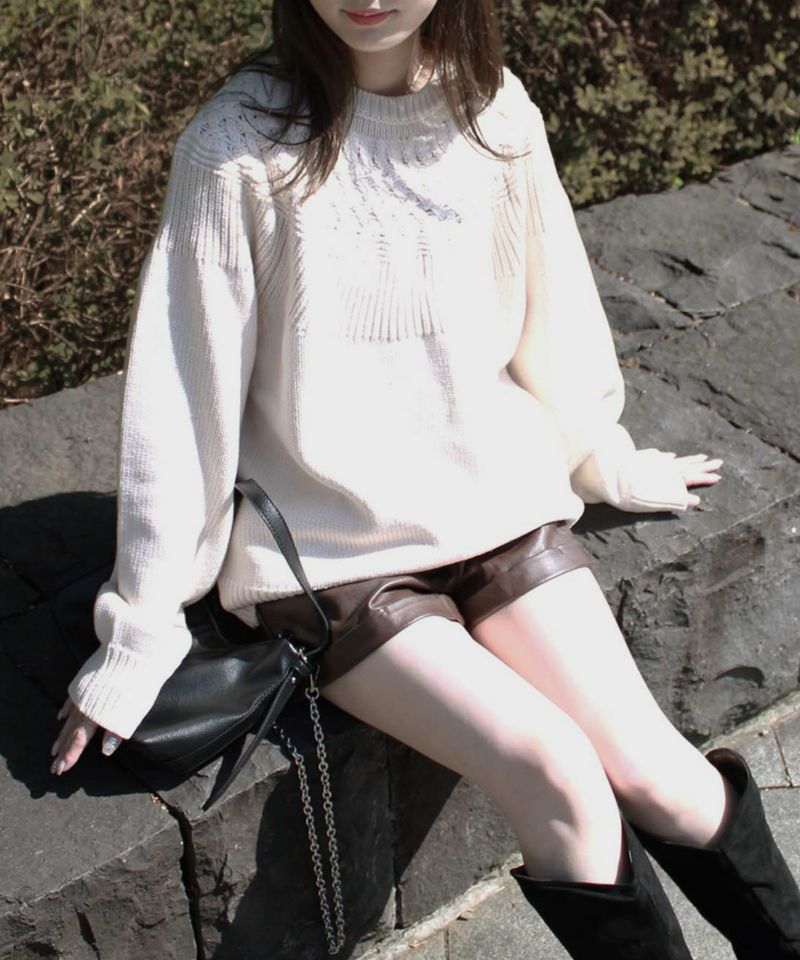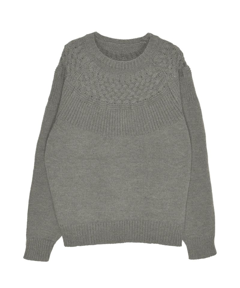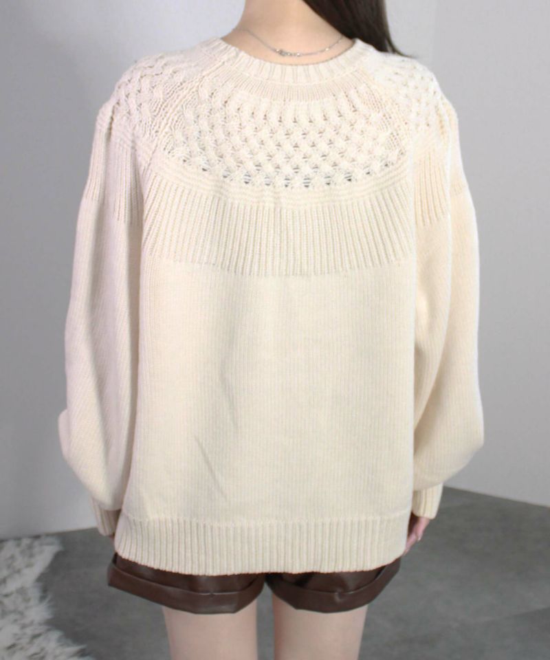 ヨーク部分に施された透かし編みが女性らしさを引き立てるニットプルオーバー。