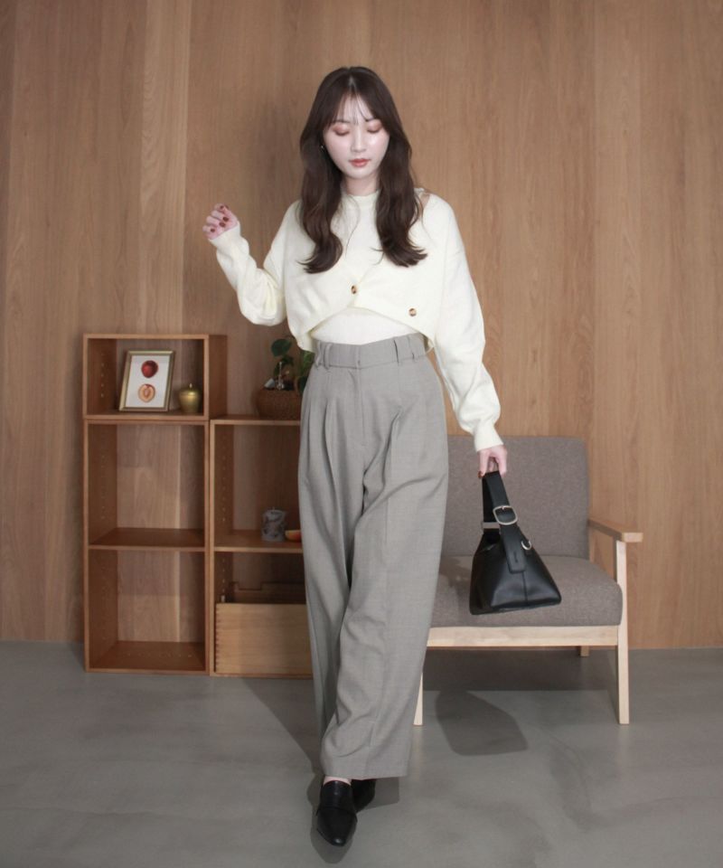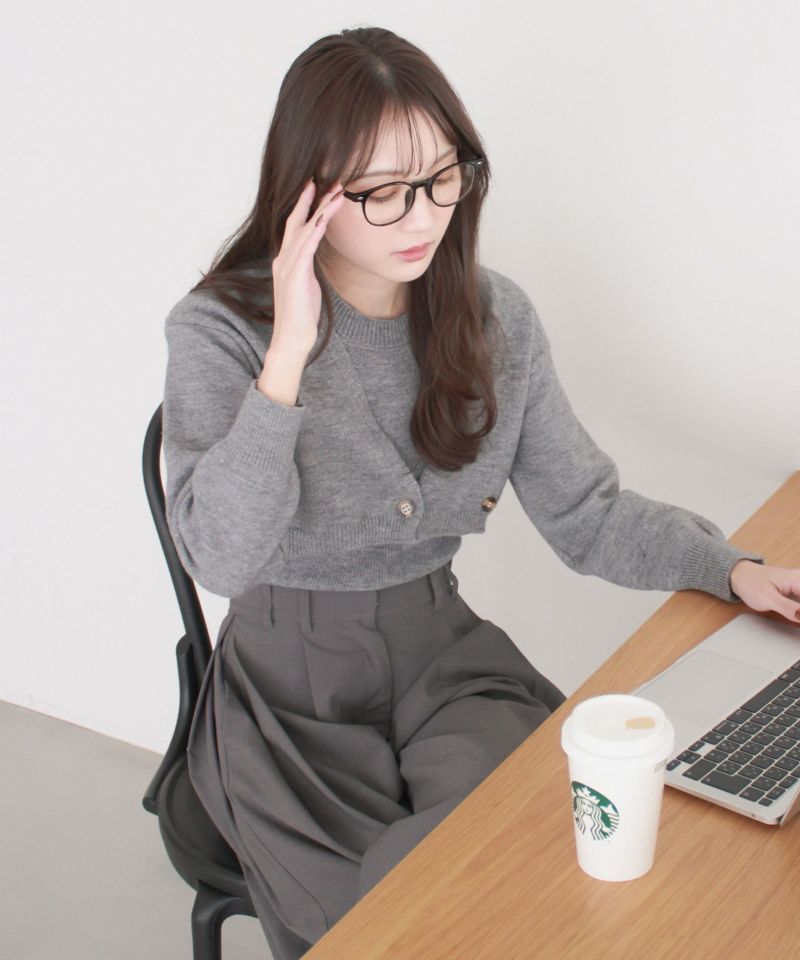 カーディガンのボタン位置が高めでスタイルアップ効果抜群◎