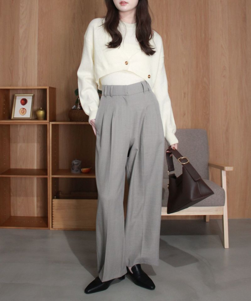 カーディガンはコンパクトなシルエットで、さりげなくウエスト位置を高く見せてくれるのも嬉しいポイント。