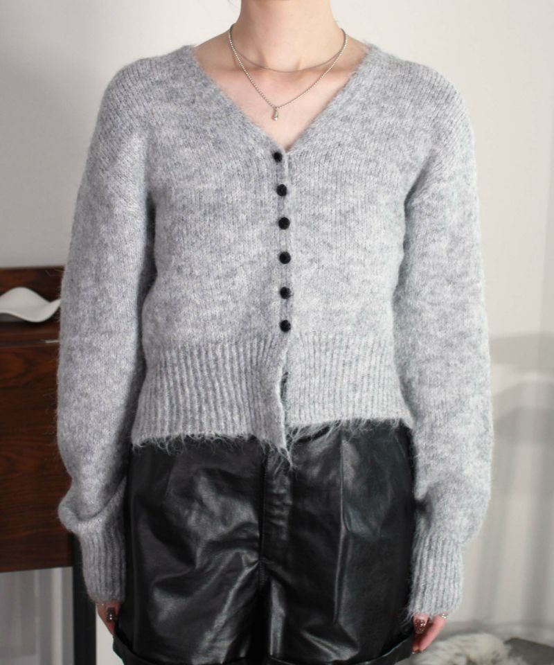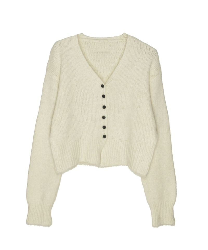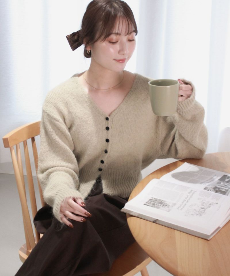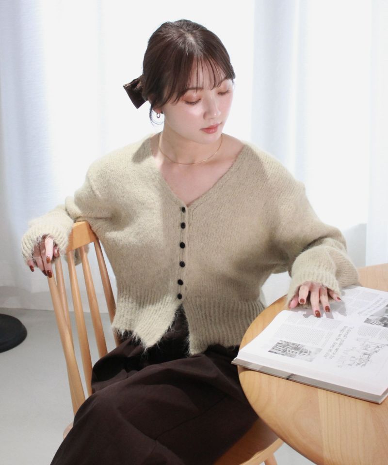 ふんわりとしたシルエットと深めのVネックが女性らしい印象のショートカーディガン。 コンパクトな丈感で、自然とスタイルアップが叶います。 フロントに並んだ小さめのボタンが上品なアクセントに。 シンプルながらも着るだけで抜け感のある着こなしを演出してくれます。