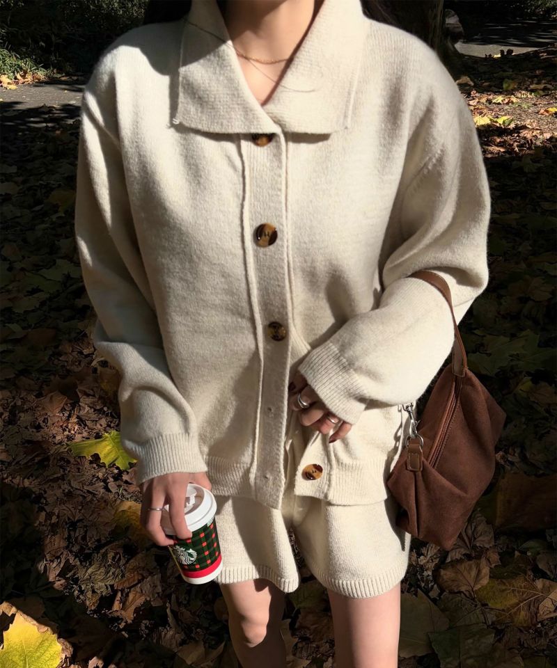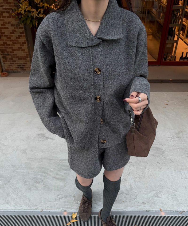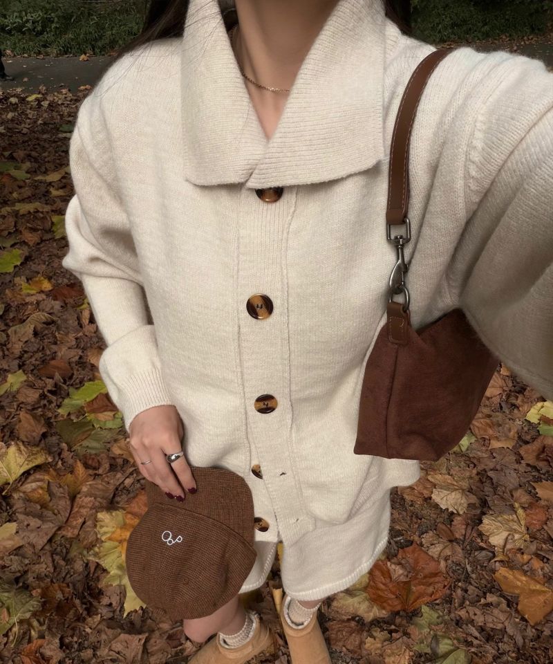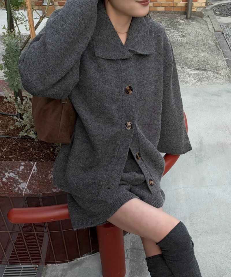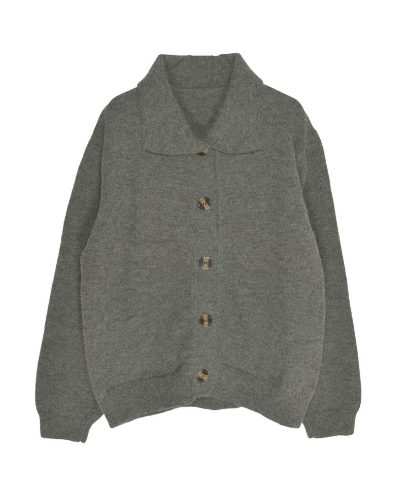 ゆったりとしたシルエットのカーディガンは、程よく抜け感のあるドロップショルダーと大きめの襟が特徴。