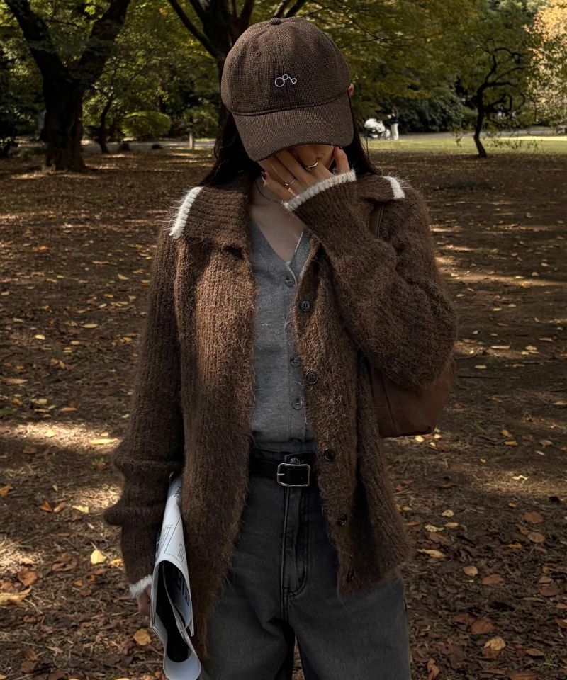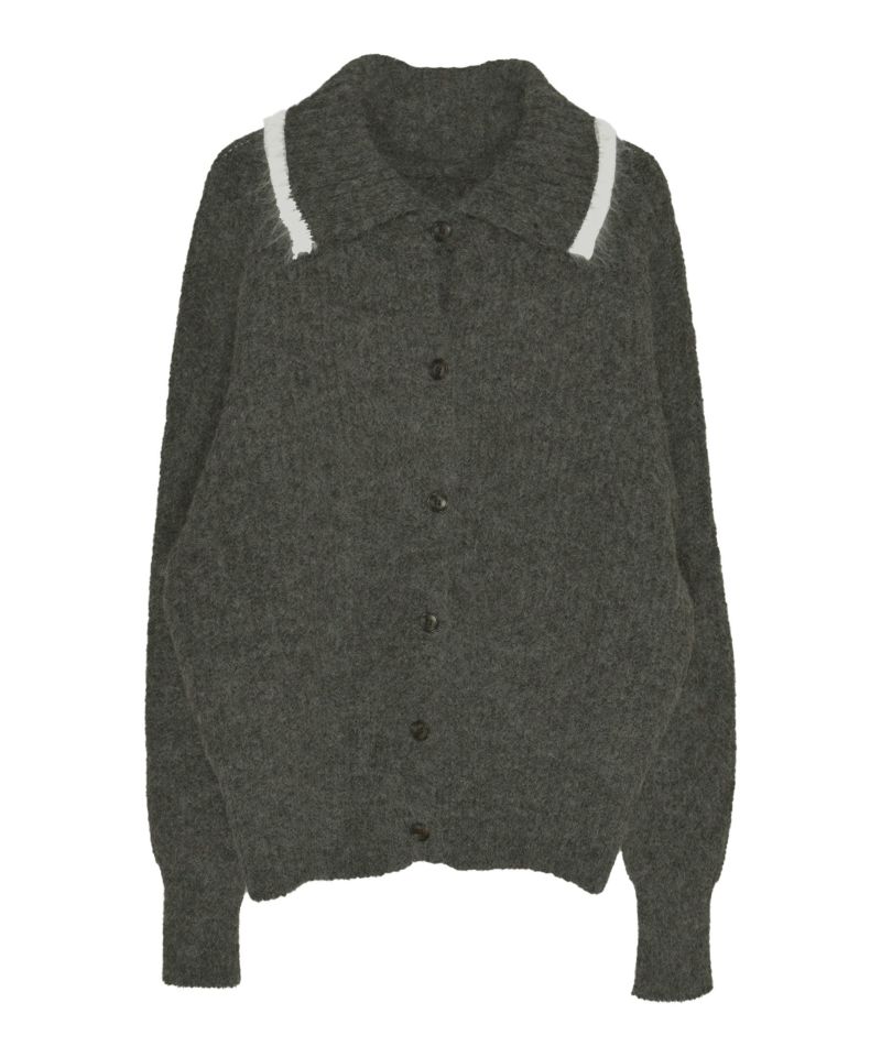 襟元と袖口にバイカラーラインをあしらったクラシカルなニットカーディガン。