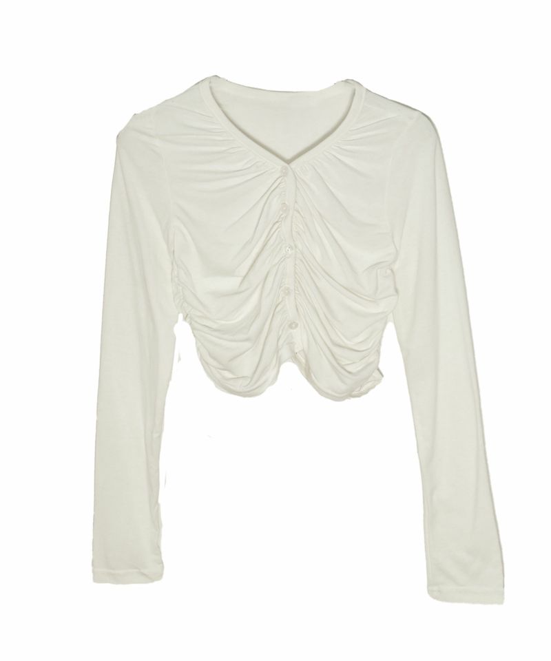 フロントにたっぷりとギャザーを寄せた、立体感のあるシルエットが魅力。 短めの丈感とシャープなVネックがバランス良く、コンパクトながら女性らしい印象に。 ボディラインをきれいに見せつつも、程よく抜け感のあるデザインに仕上げています。