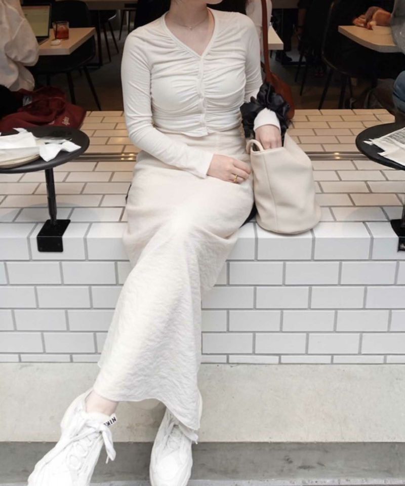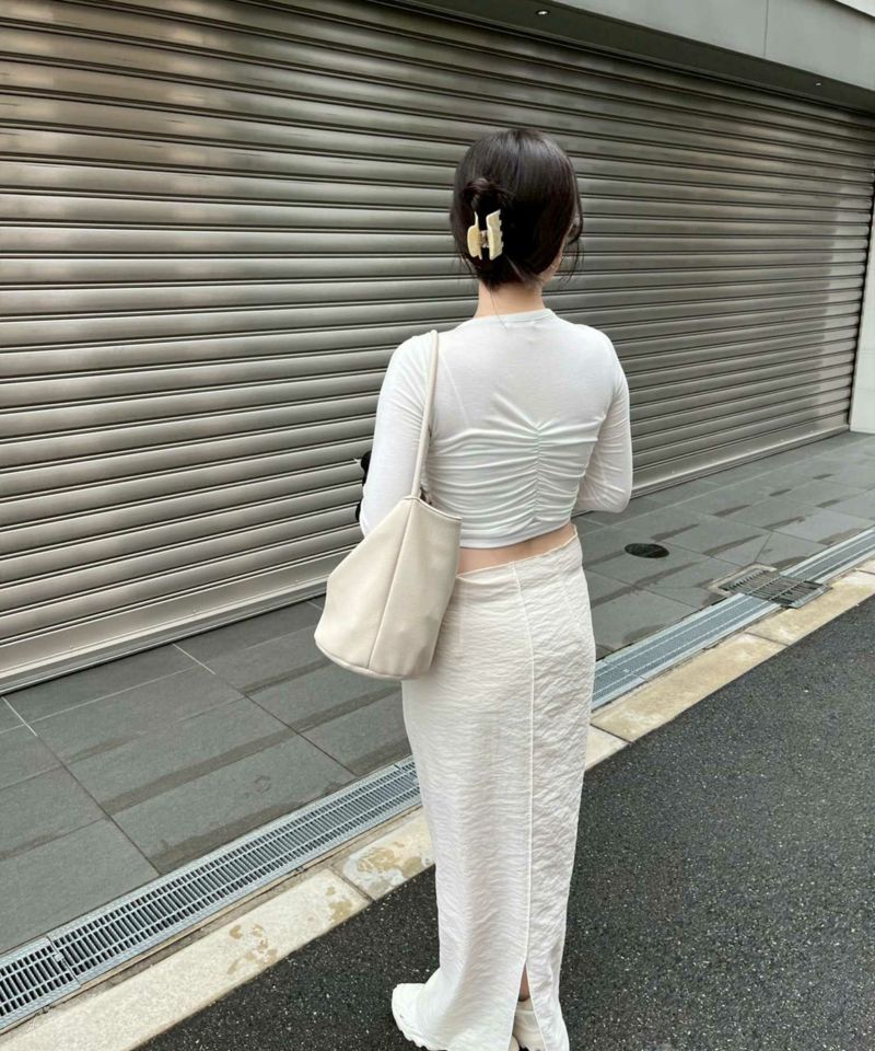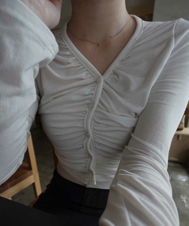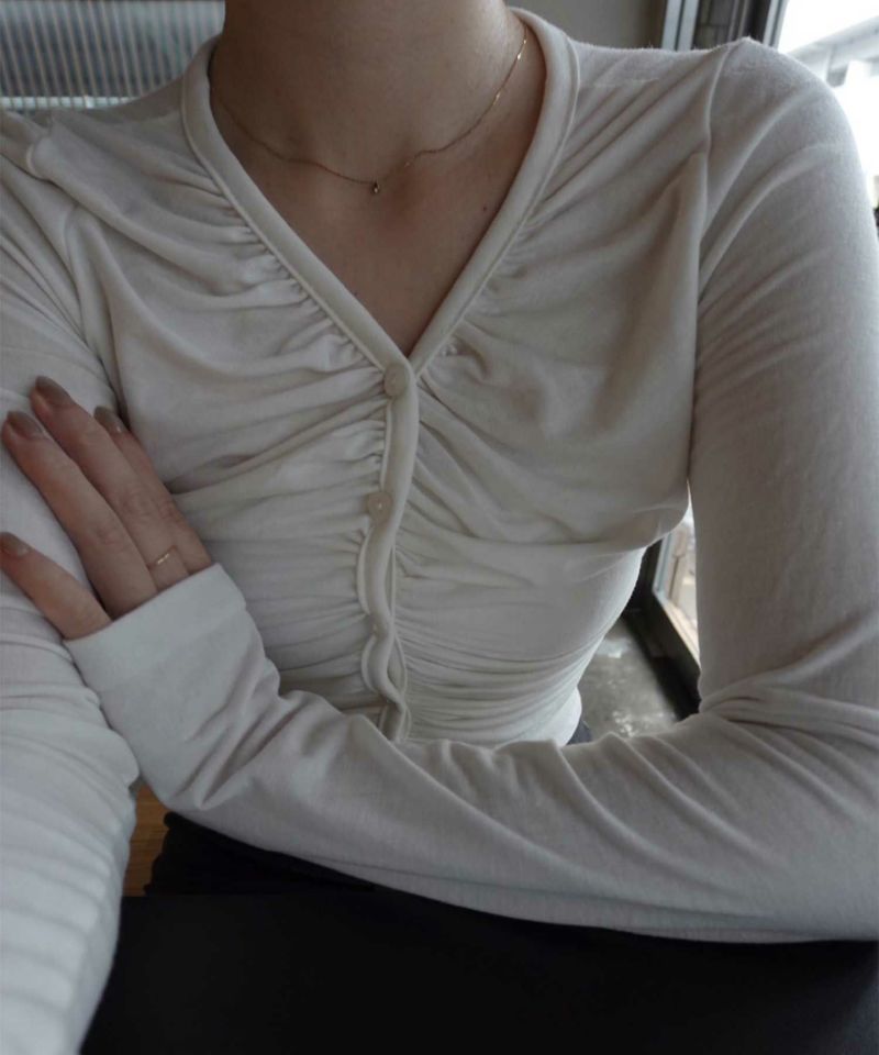 フロントにたっぷりとギャザーを寄せた、立体感のあるシルエットが魅力。 短めの丈感とシャープなVネックがバランス良く、コンパクトながら女性らしい印象に。 ボディラインをきれいに見せつつも、程よく抜け感のあるデザインに仕上げています。