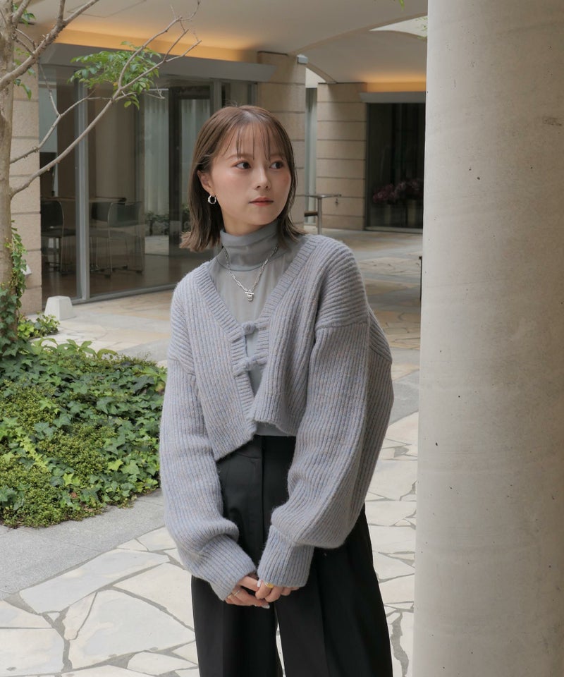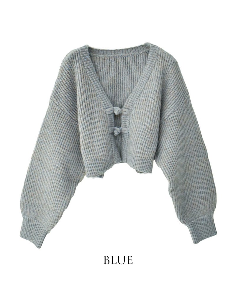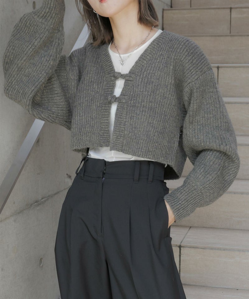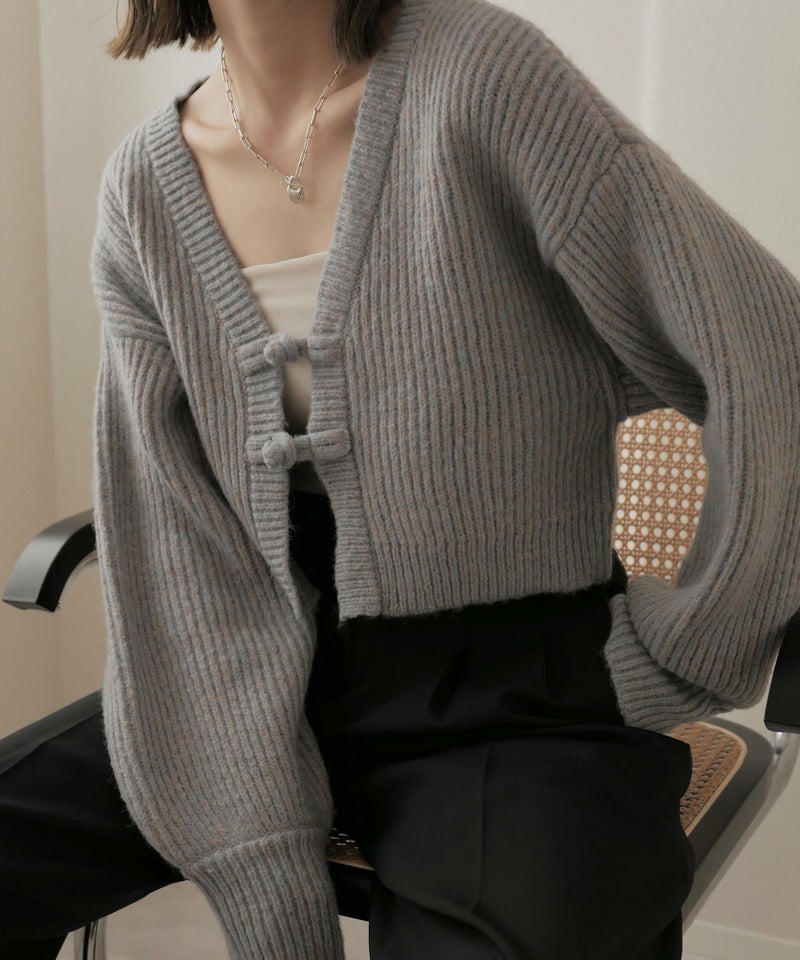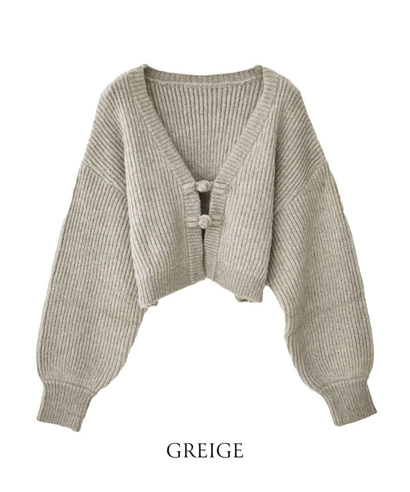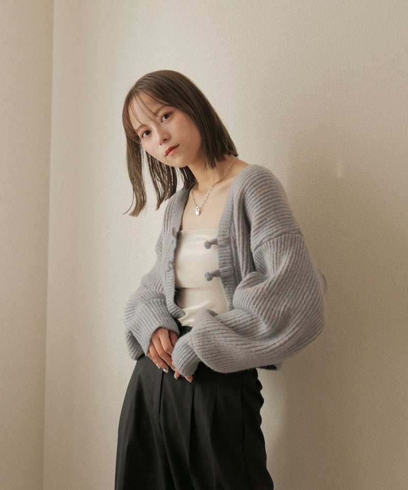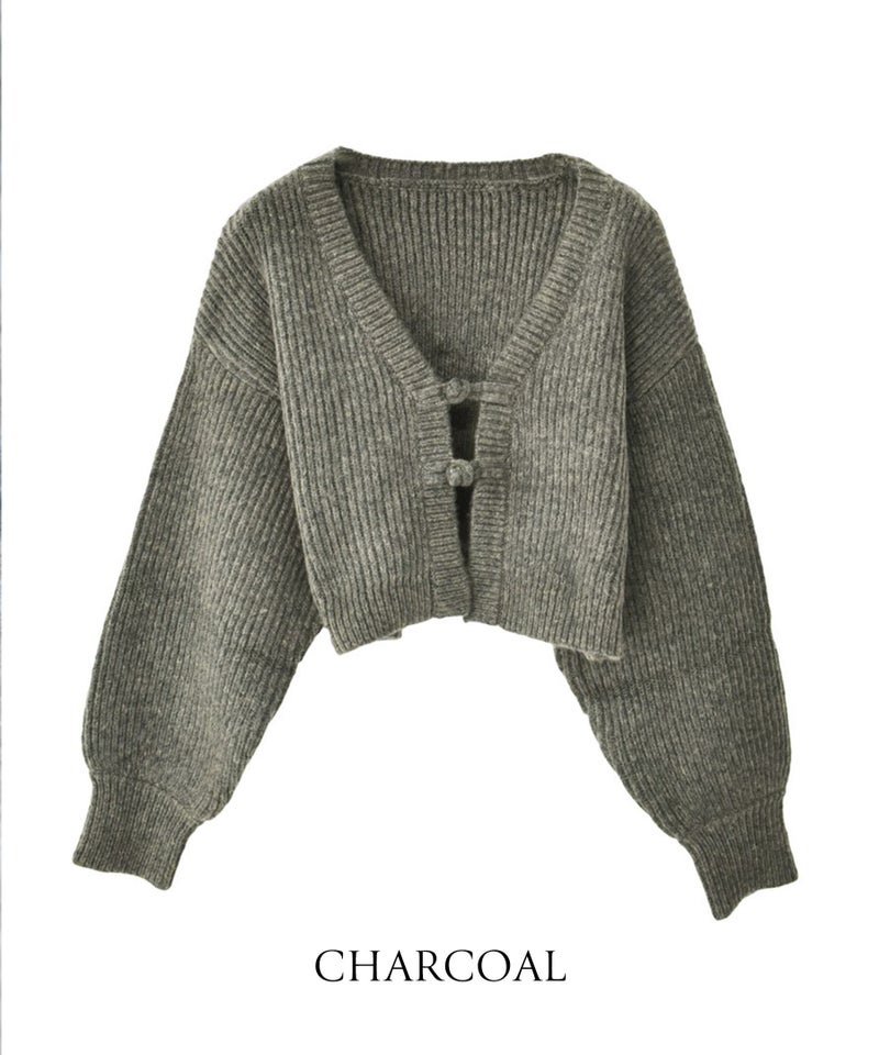 ディティールにこだわったニットボレロが登場♪ 大人気のメランジカラーのふんわり起毛糸を使用し クロップド丈×ボックスシルエットのトレンドシルエットに フロントにはチャイナボタンを2つ施しました。 たっぷりとしたボリューム袖も可愛さをUP◎