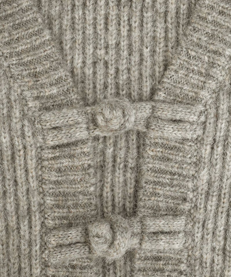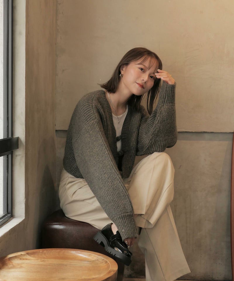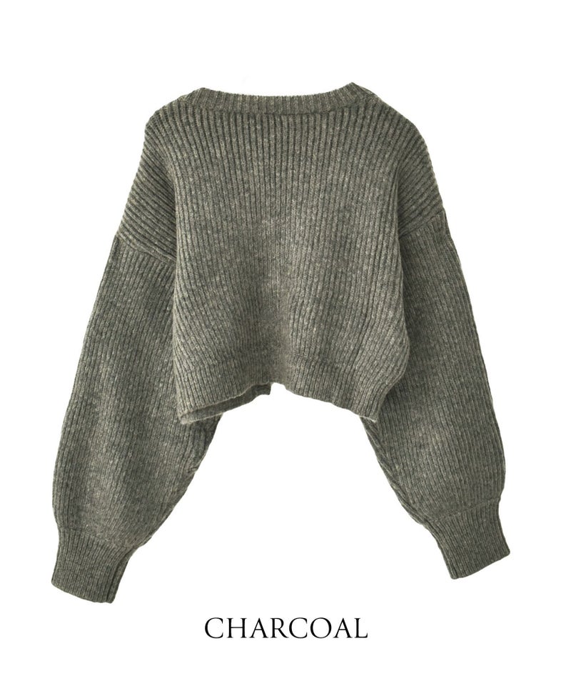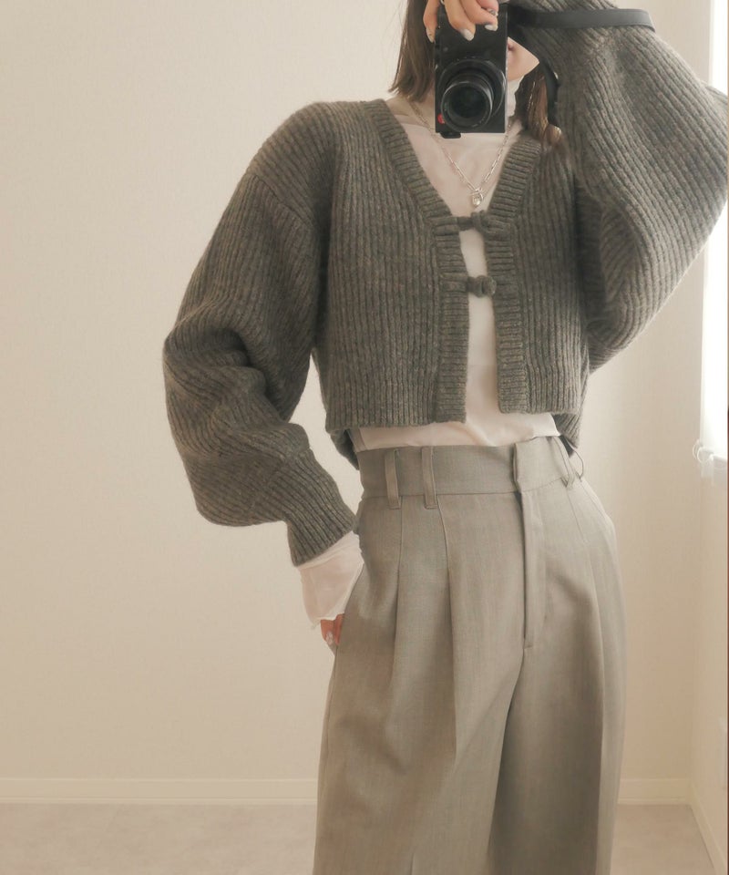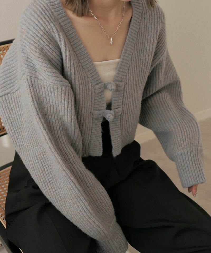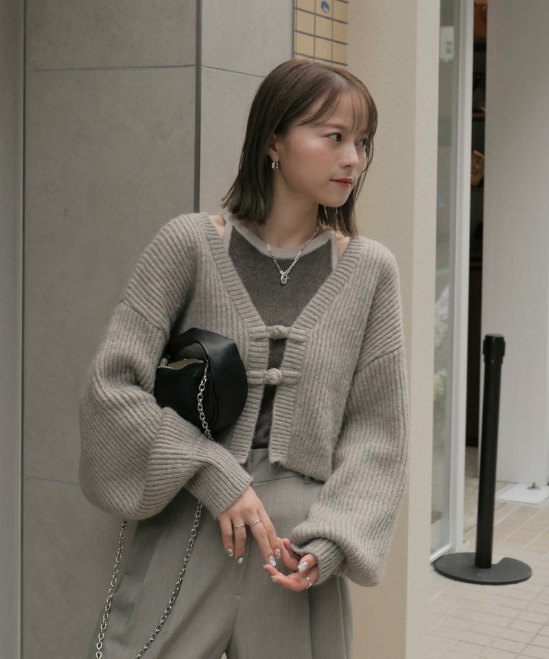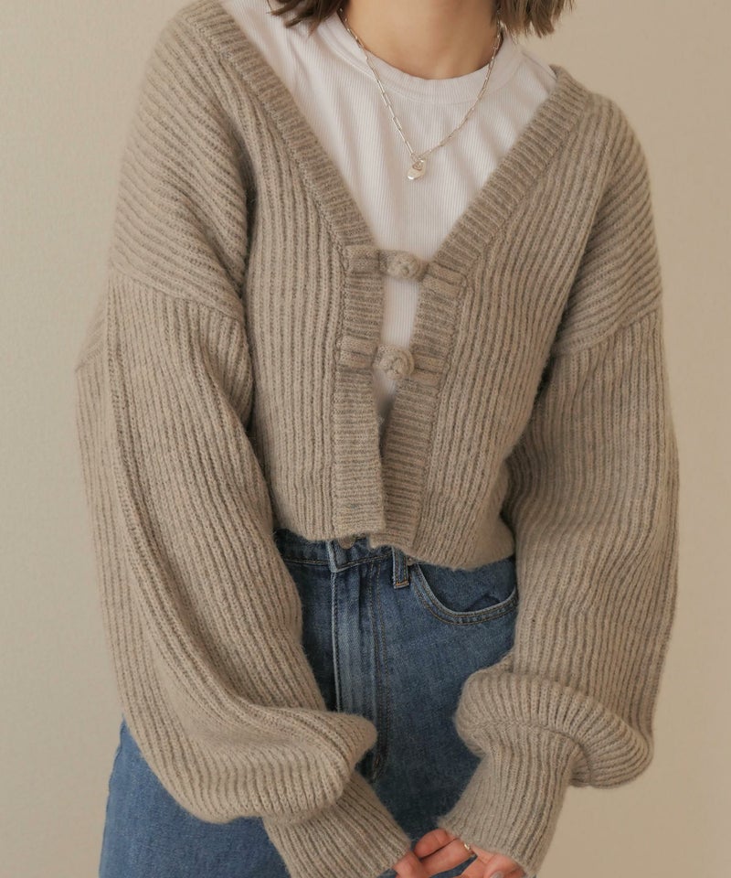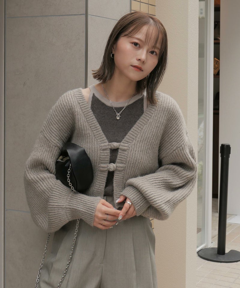 ディティールにこだわったニットボレロが登場♪ 大人気のメランジカラーのふんわり起毛糸を使用し クロップド丈×ボックスシルエットのトレンドシルエットに フロントにはチャイナボタンを2つ施しました。 たっぷりとしたボリューム袖も可愛さをUP◎