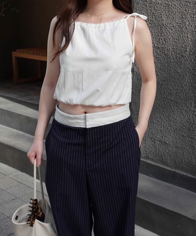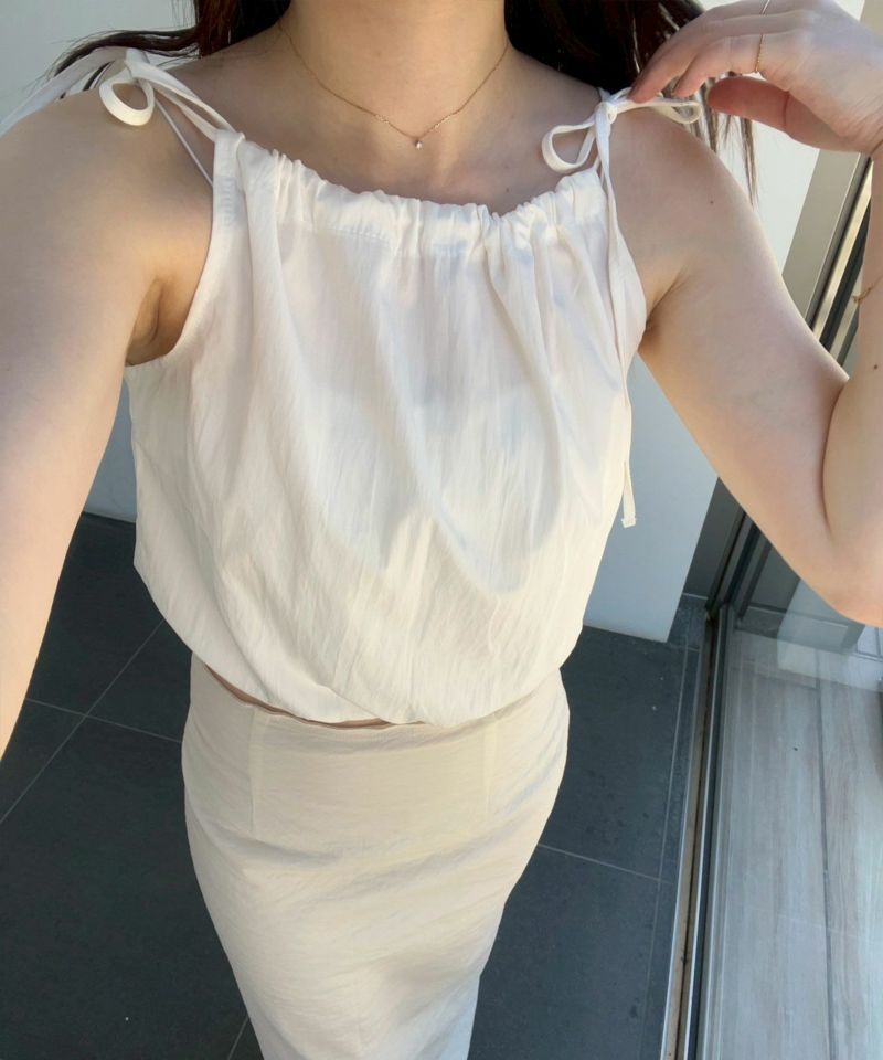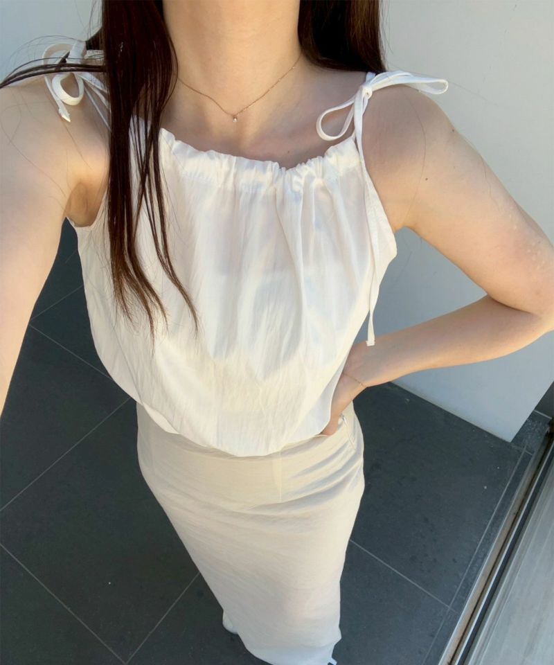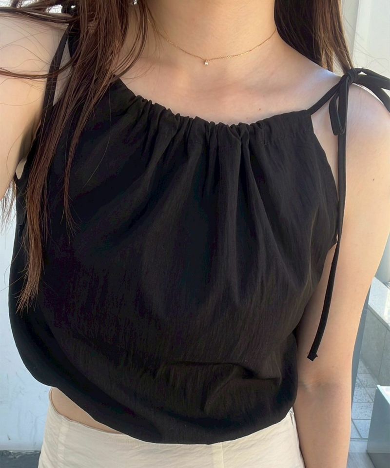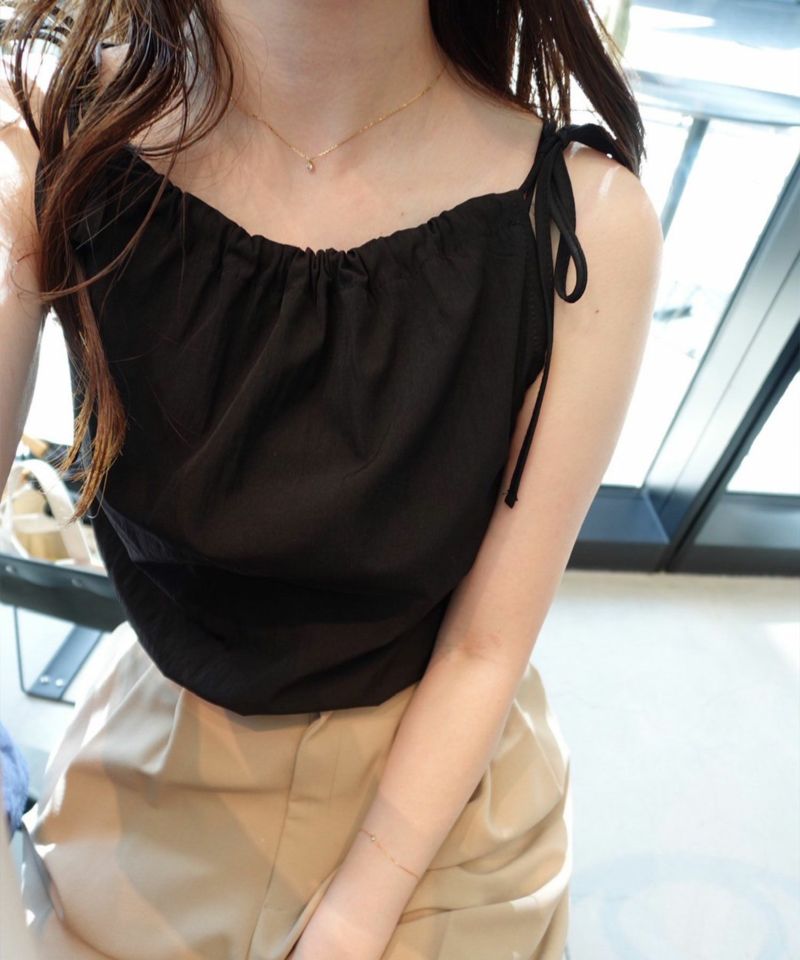 長めの細リボン肩紐がポイントのブラウス。 くしゅっとした胸元のギャザーは調節が可能です◎