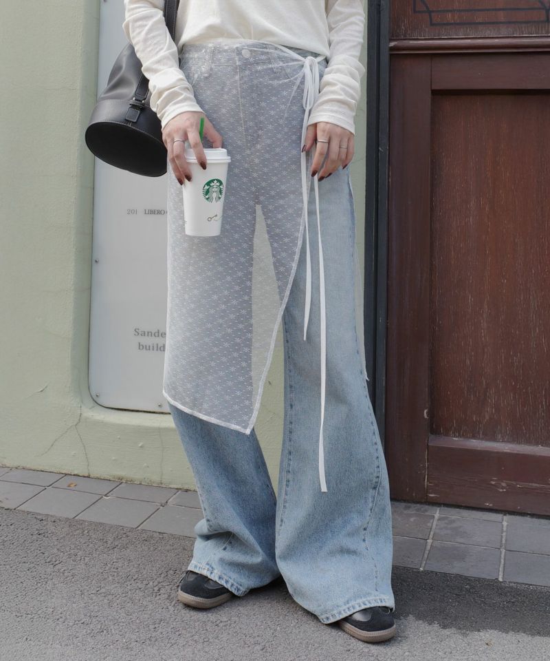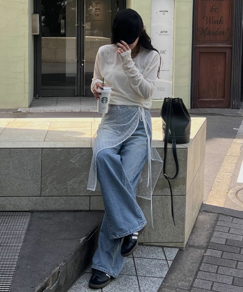 スリムパンツや、デニムとのレイヤードスタイルがおすすめ。