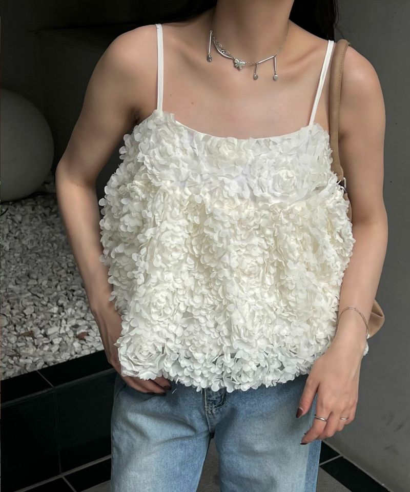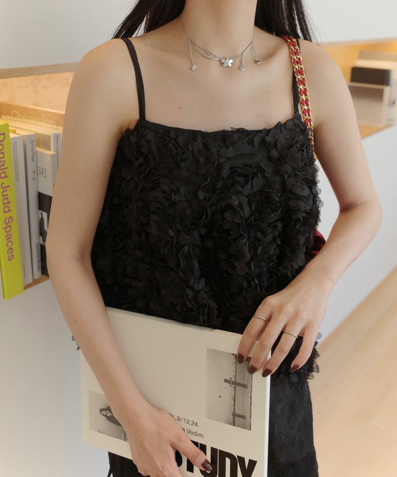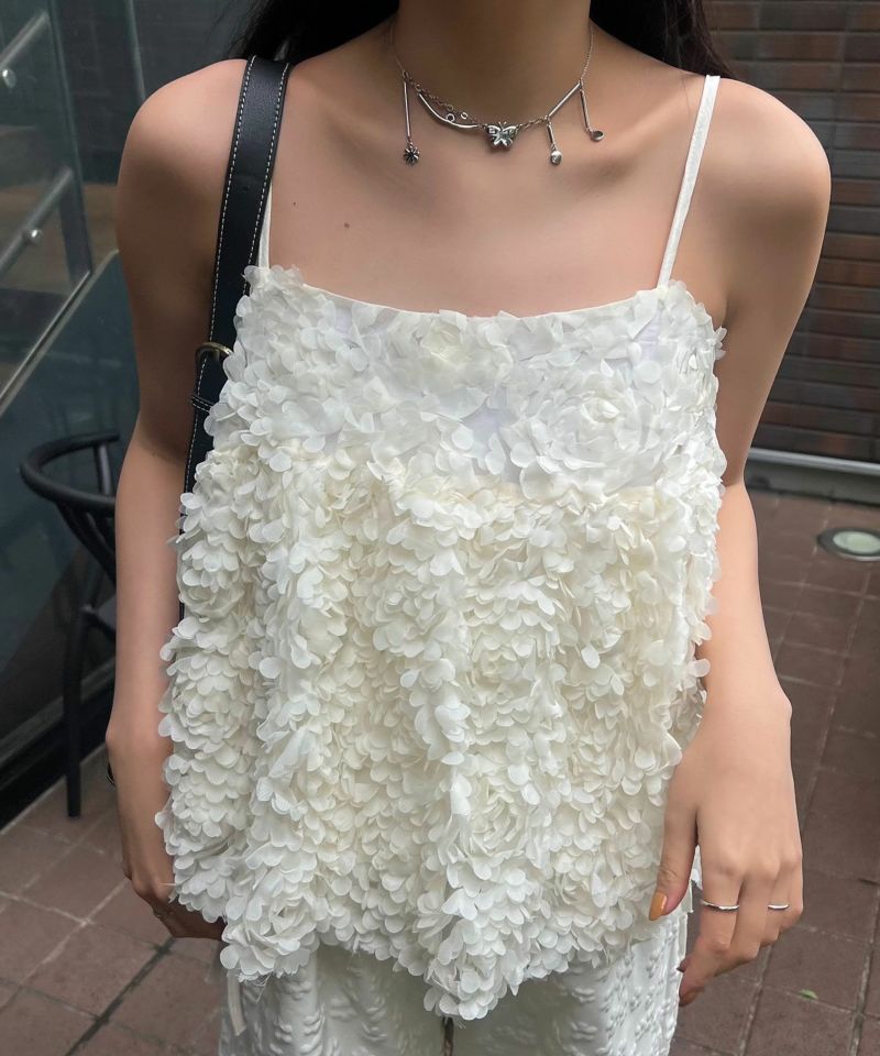 フラワーモチーフが全面にあしらわれた、華やかなキャミソールトップス。
