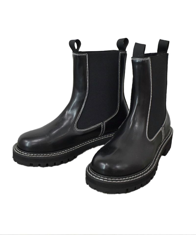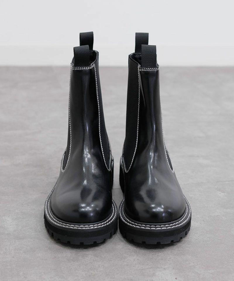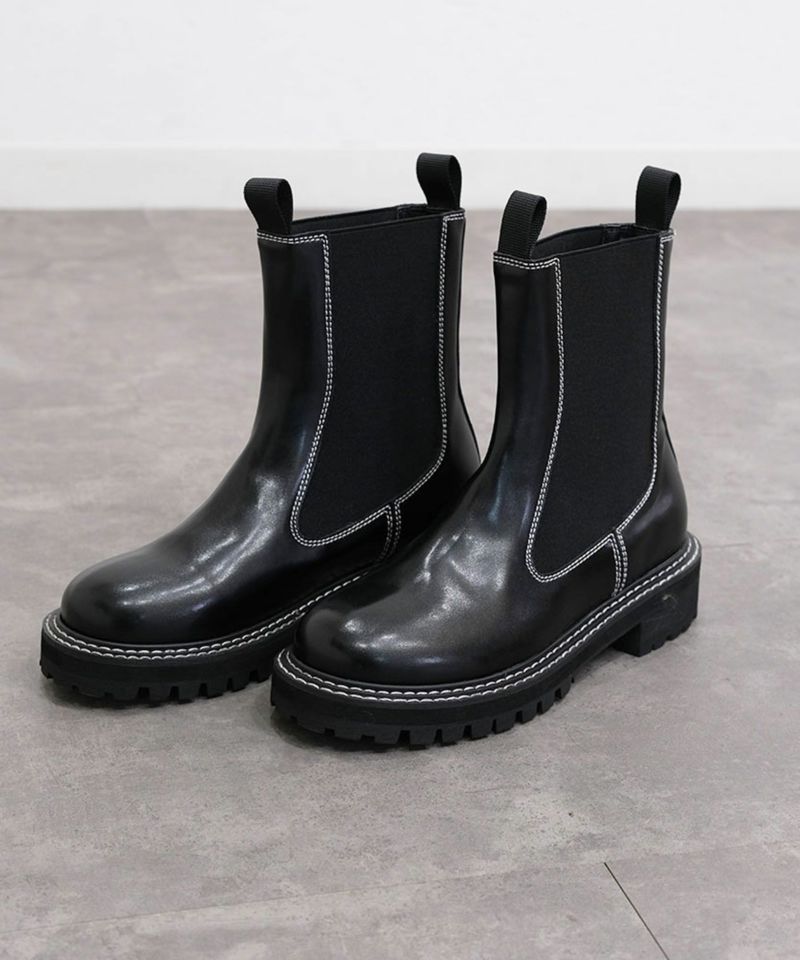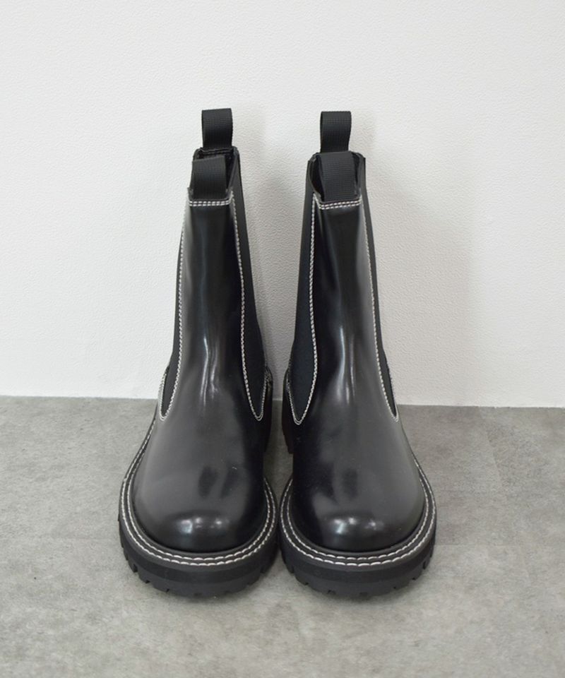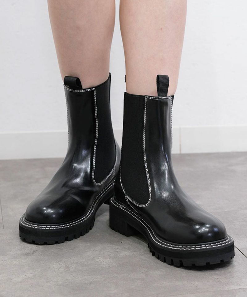 サイドゴアとバイカラーステッチがかわいいブーツ。 マット加工の施されたほんのり光沢感のある合皮のブーツ。 しっかり厚みのある生地なので形が崩れにくく 長く綺麗に履いていただけます。 さらにサイドは広い範囲でゴア仕様になっており、 着脱がしやすいのも嬉しいポイント♡