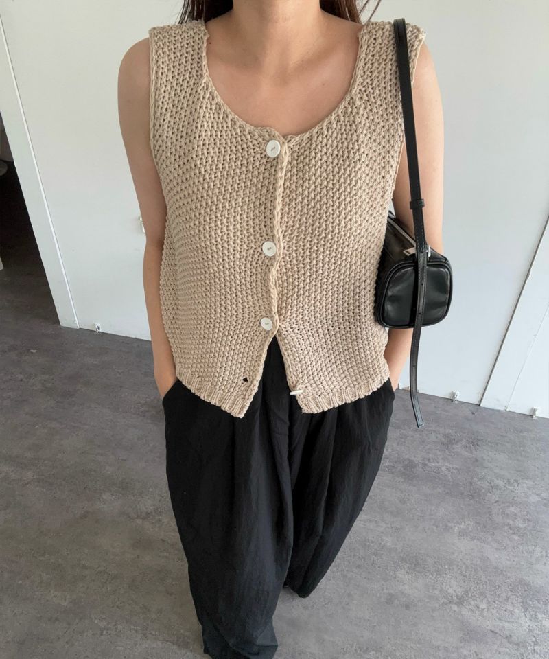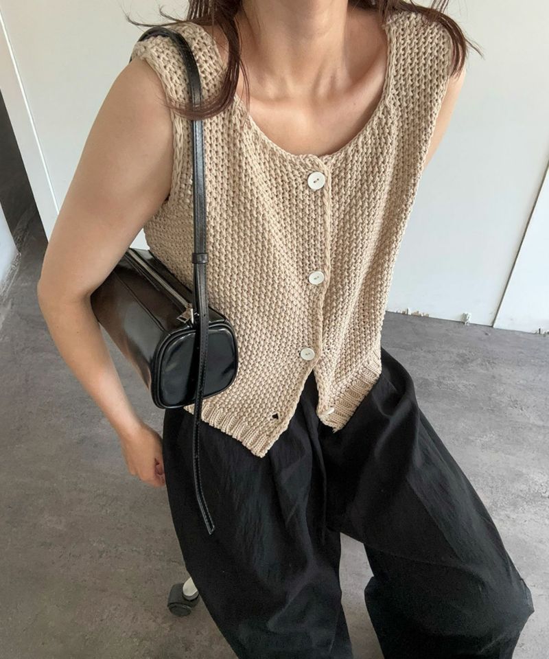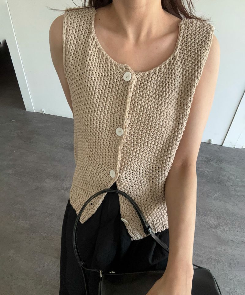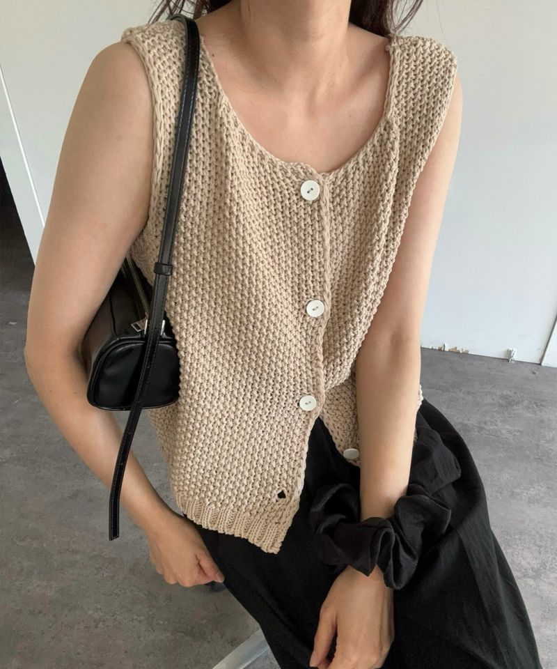 シンプルながらも温かみのあるデザインが魅力のニットベスト。