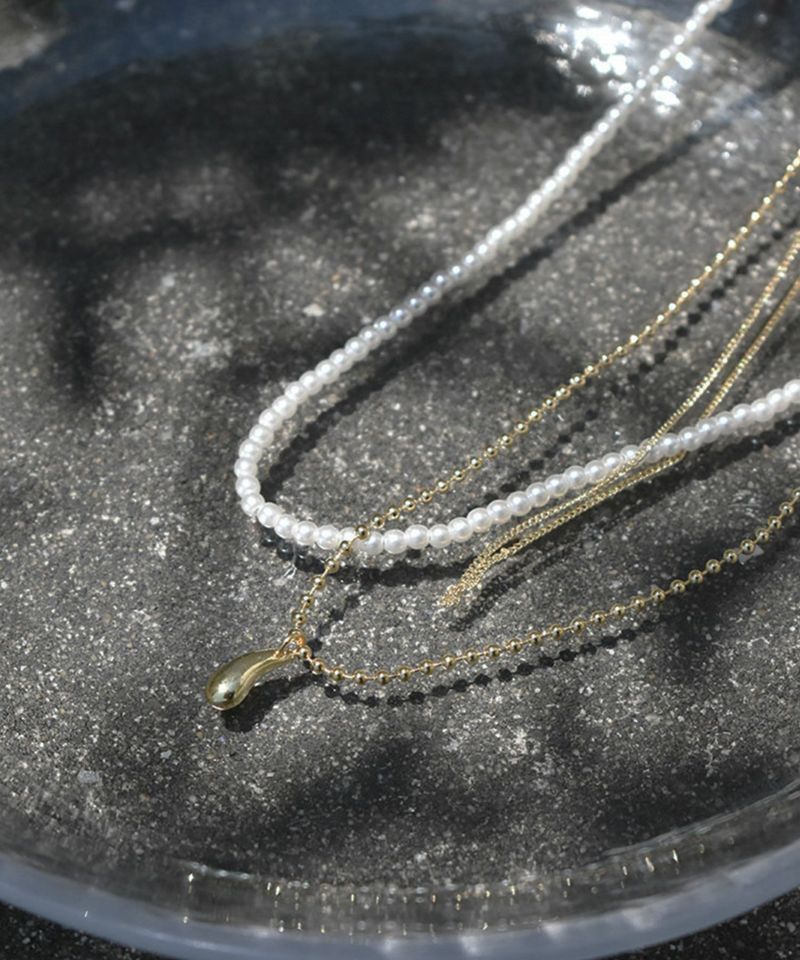 パールネックレスとモチーフ付のチェーンネックレスがレイヤードになったアイテム。
