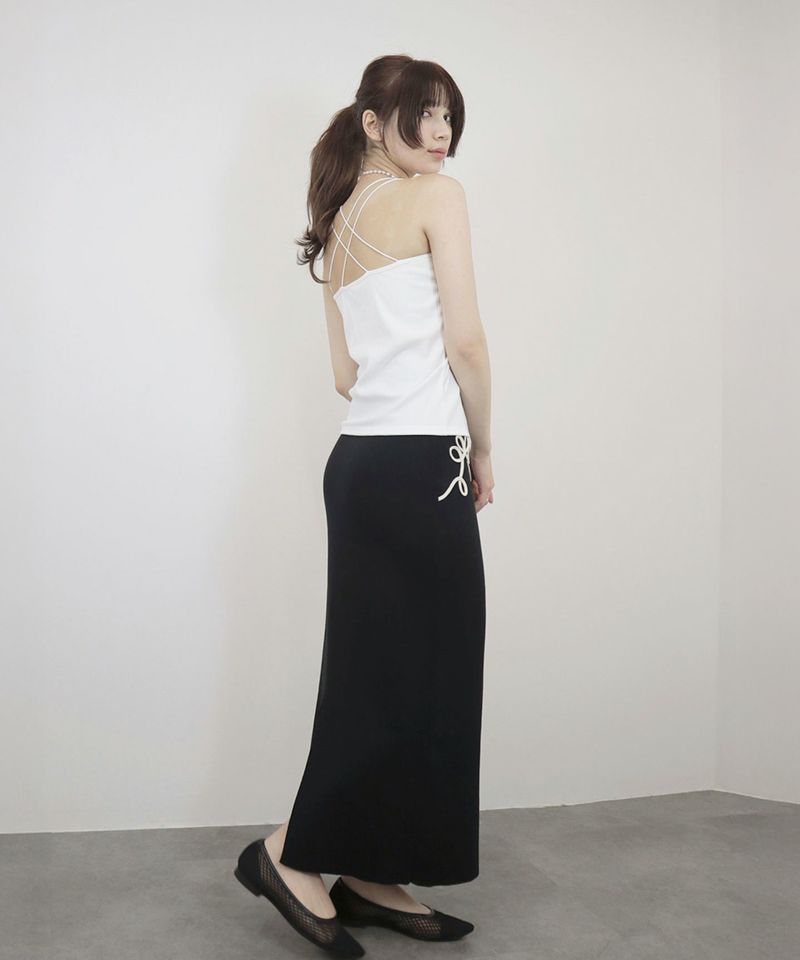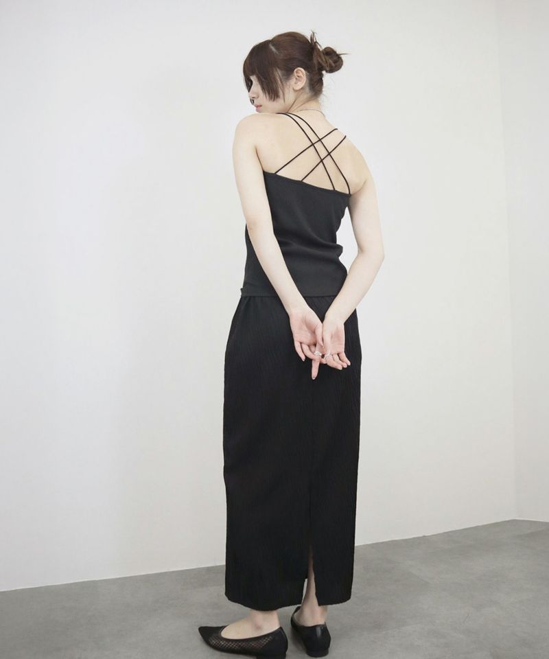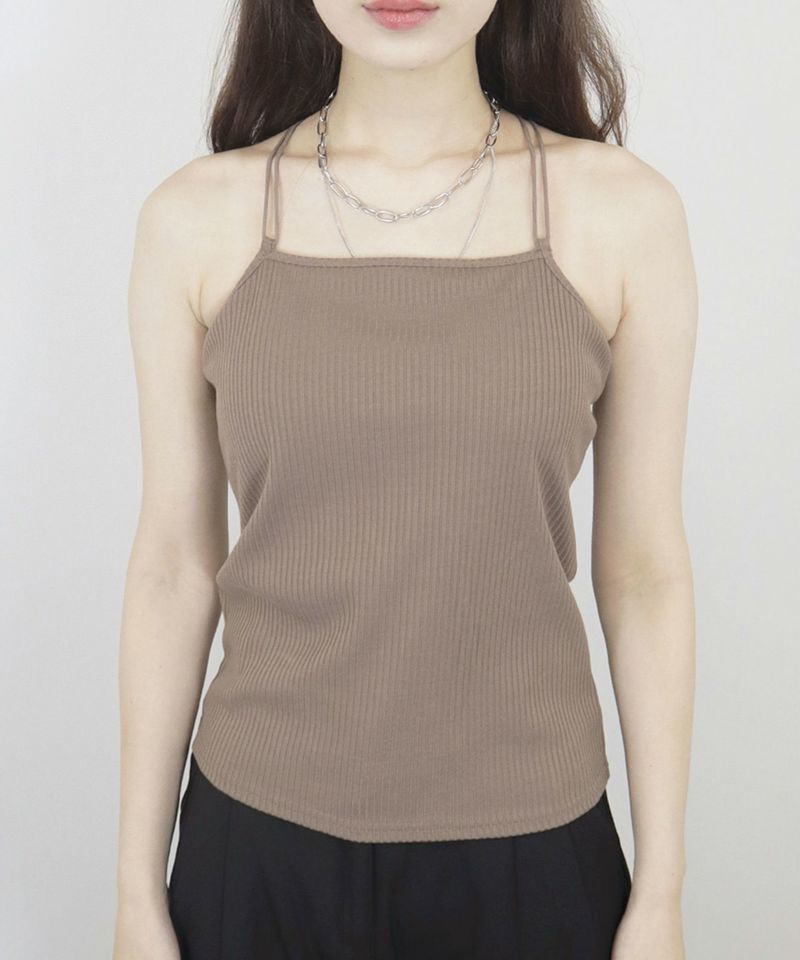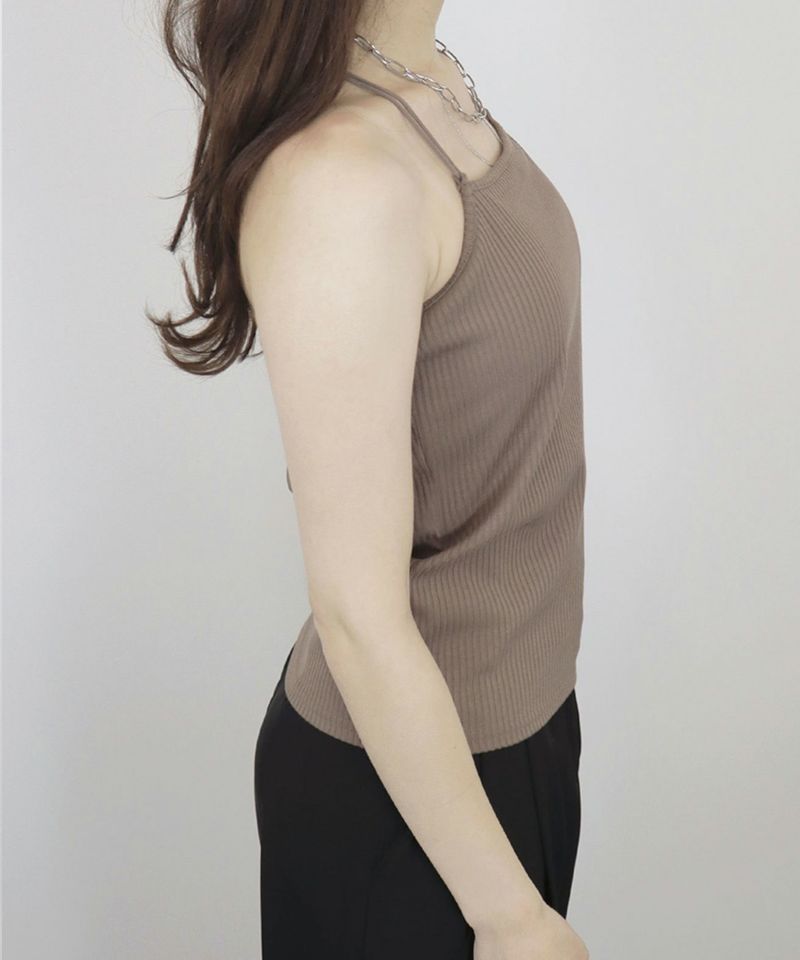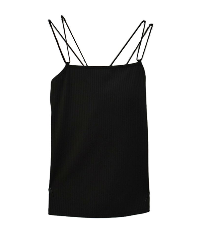 やわらかく肌触りの良いテレコリブ素材を使用し、 程よい厚みで、透けにくいのも魅力。 伸縮性があるので、体型を問わず程よく身体にフィットしてくれます。 カジュアルな素材と細めで華奢なデザインストラップが、 女性らしいヘルシーな肌見せを叶えます。