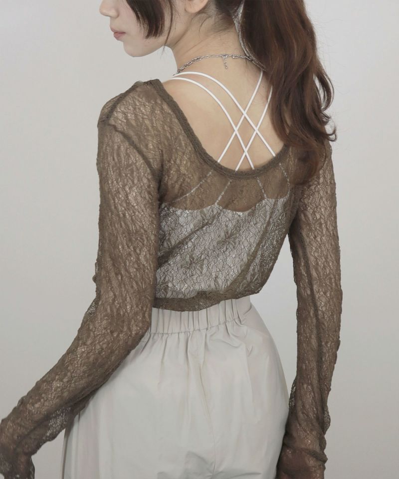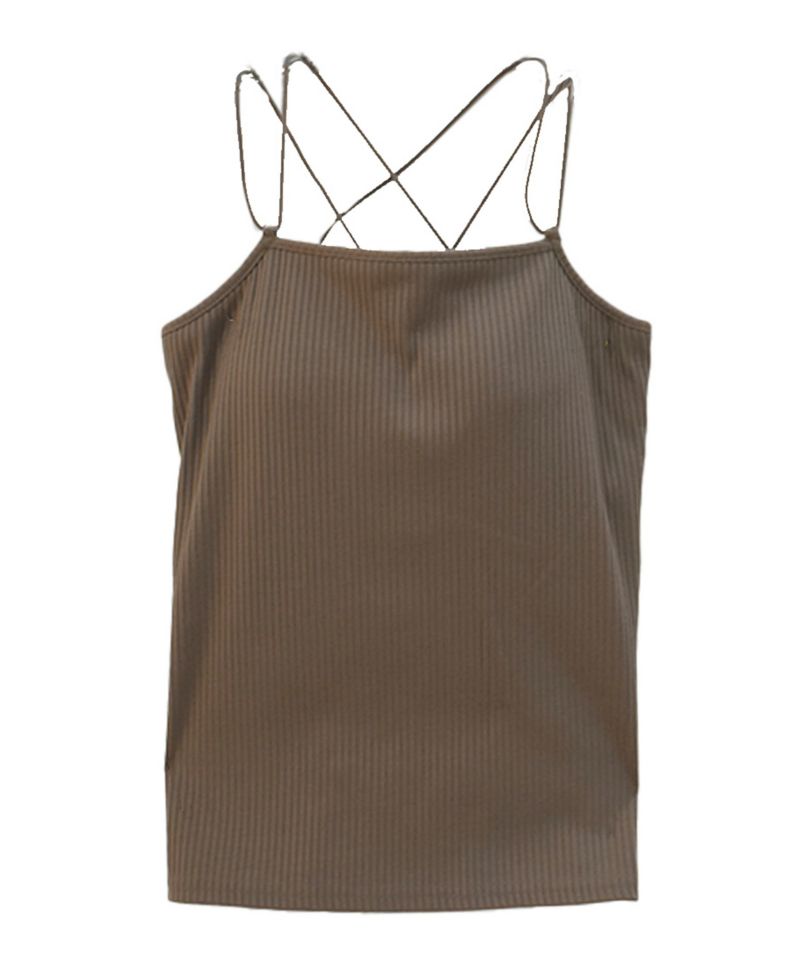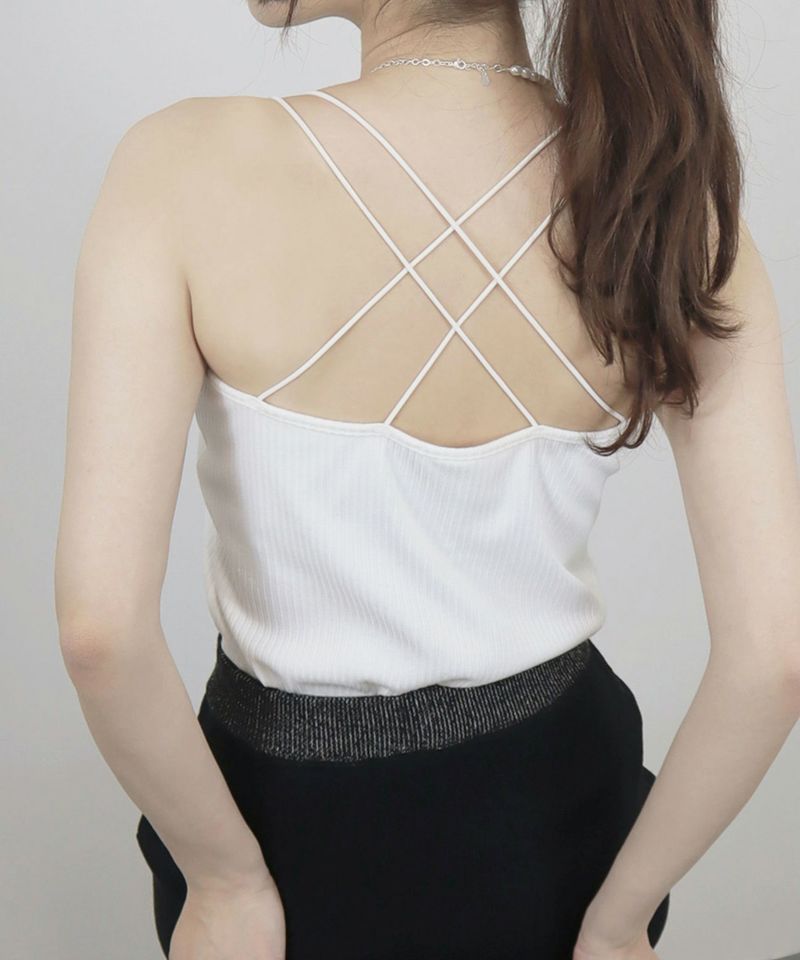 バックデザインが目を惹く、1枚持っておくと 大活躍するカップ付きキャミソール✔ クロスになったストラップが印象的な1枚。 カップ付きなので、インナーレスでお洒落を楽しめます◎