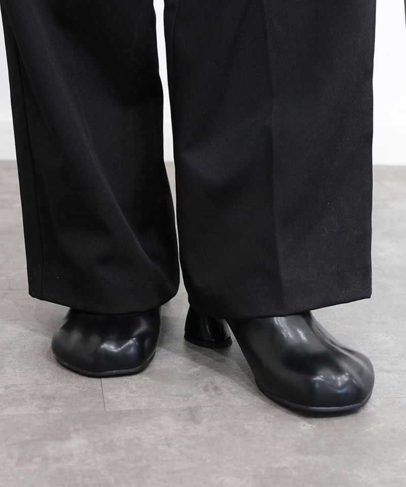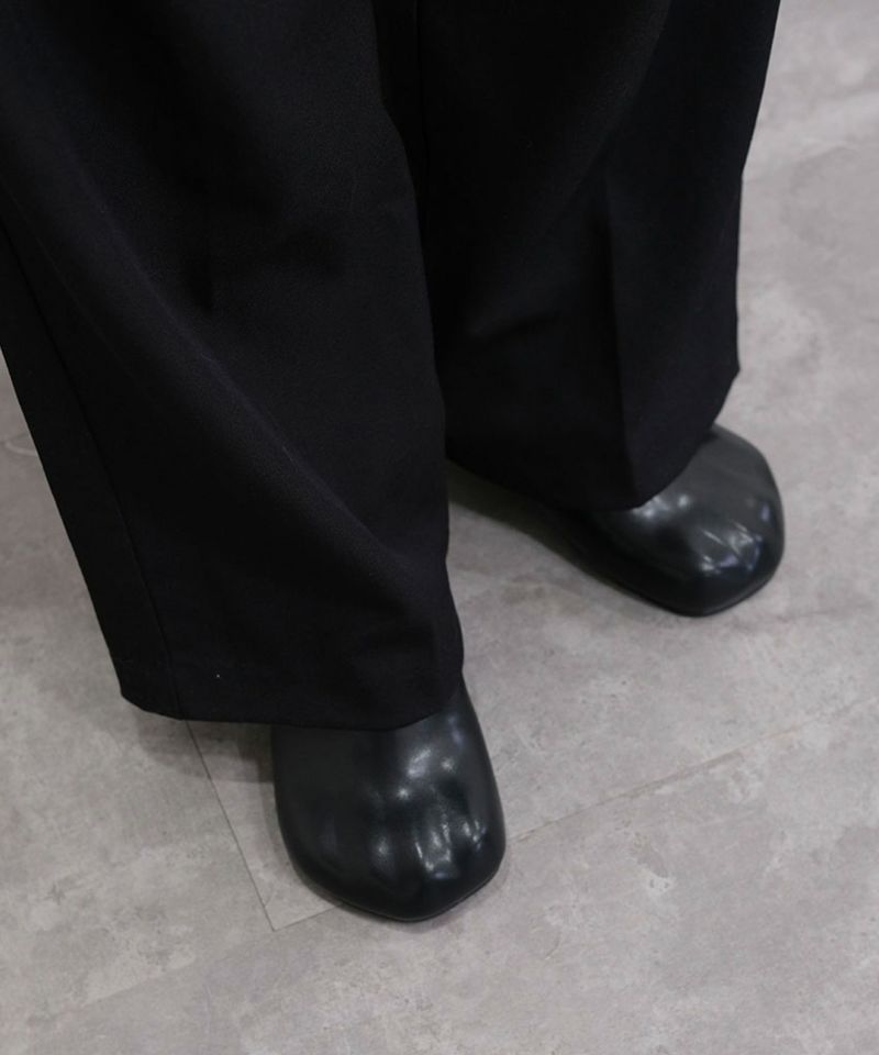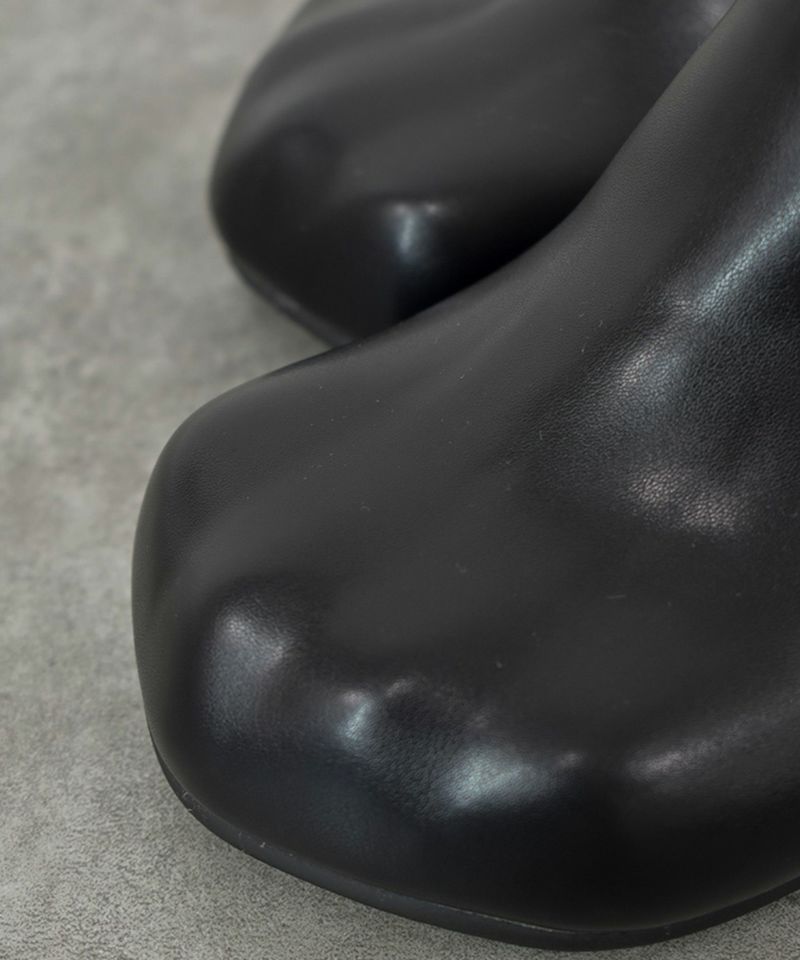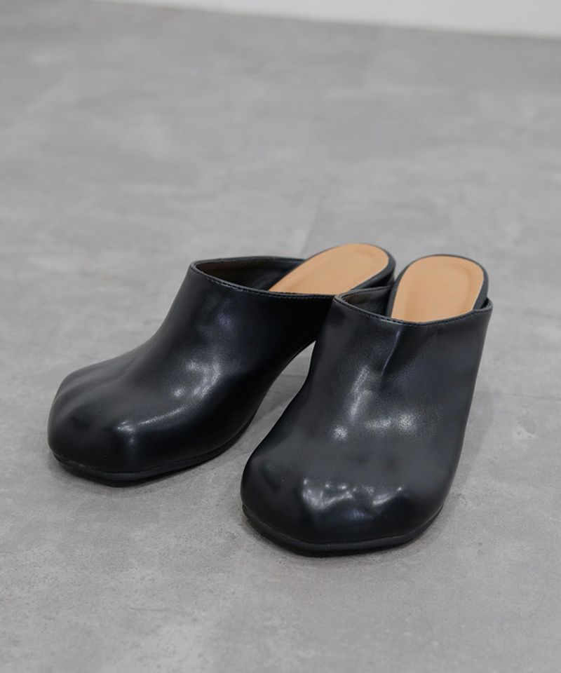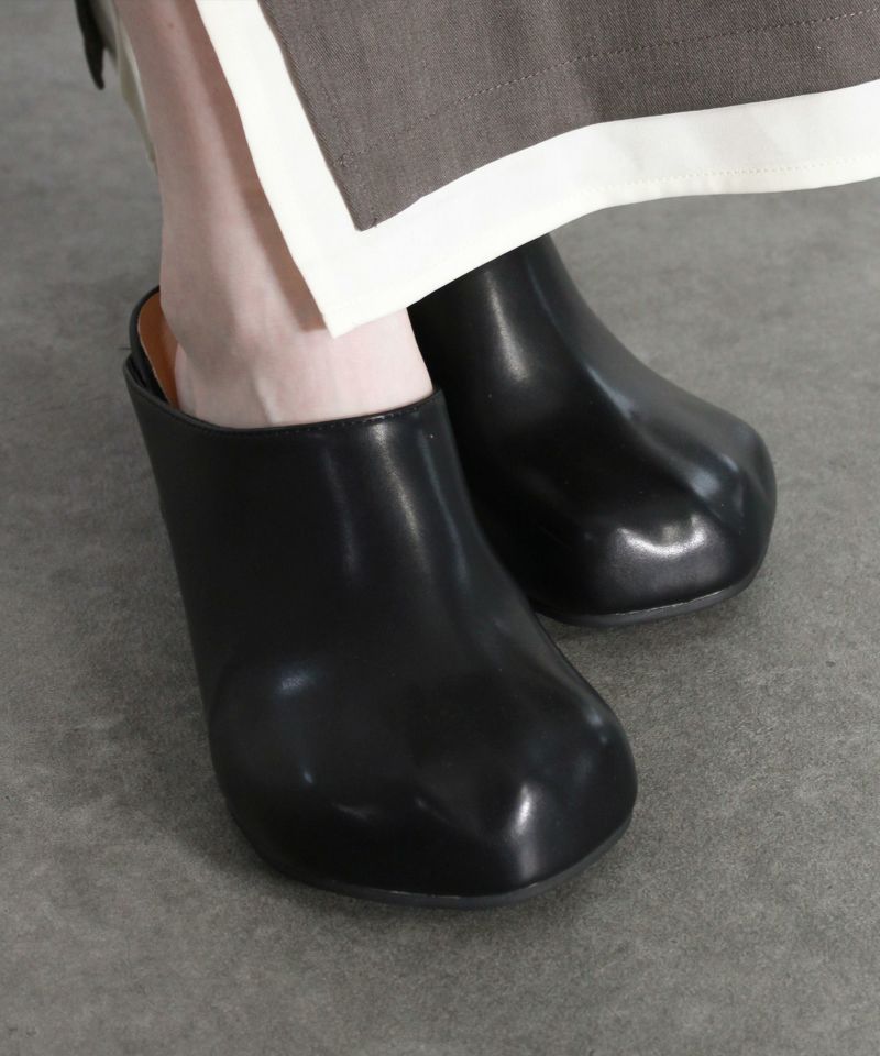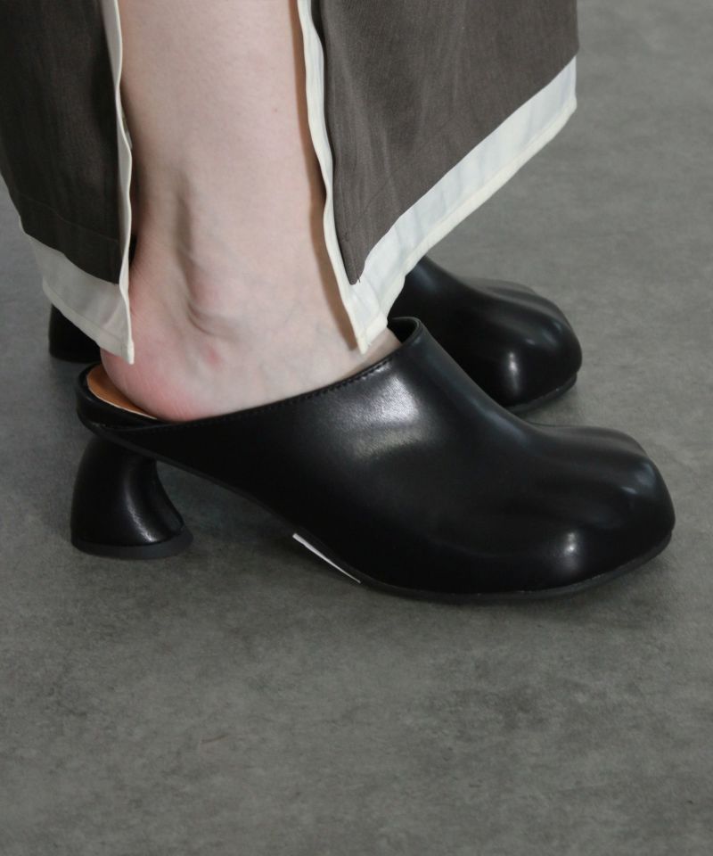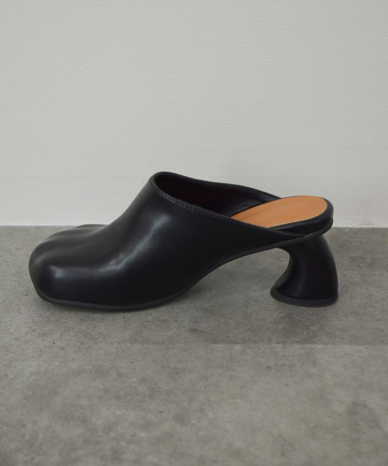 立体感のあるボリュームトゥがポイントのミュール。 存在感のあるアシンメトリーなつま先と変形ヒールがオシャレなアイテム。 全体的に丸いフォルムに仕上げており見た目はもちろん 窮屈感の無いラクな履き心地にもこだわったアイテム。