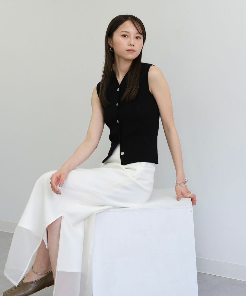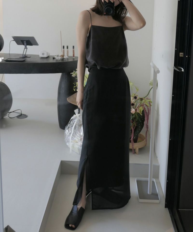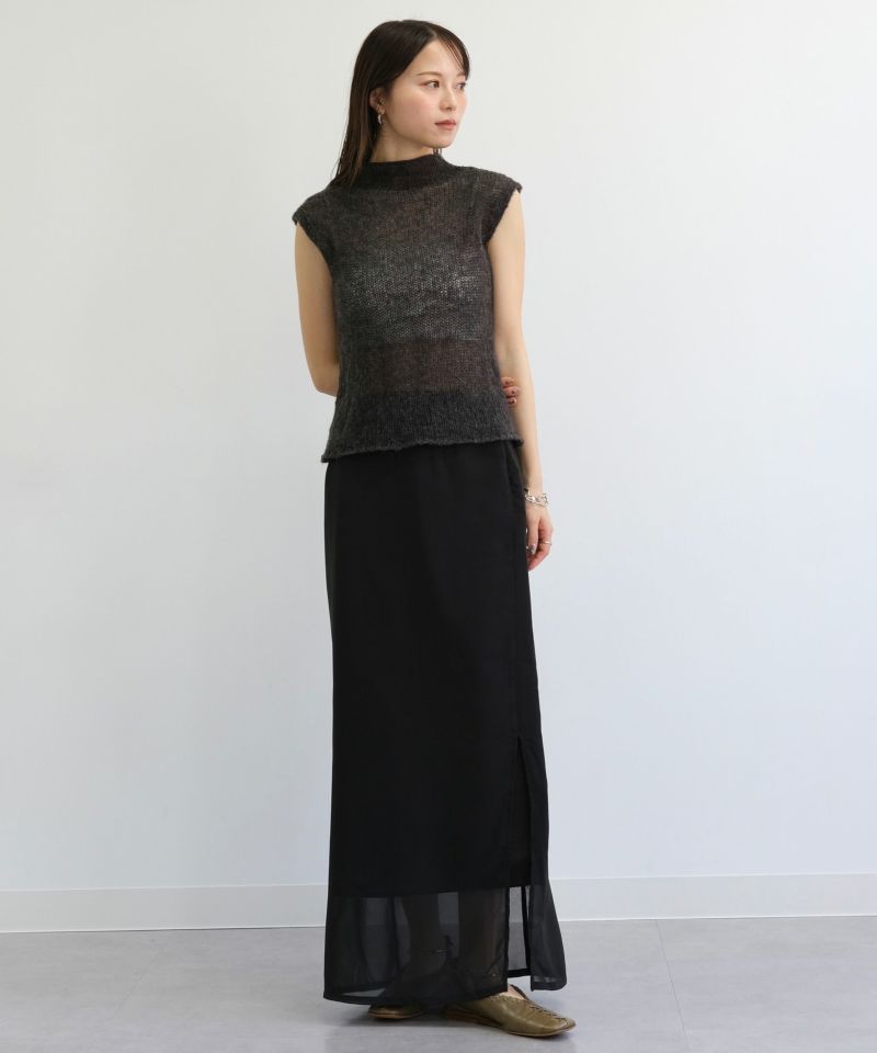 やわらかなシフォン素材とハリ感のある生地がレイヤードされたスカート。