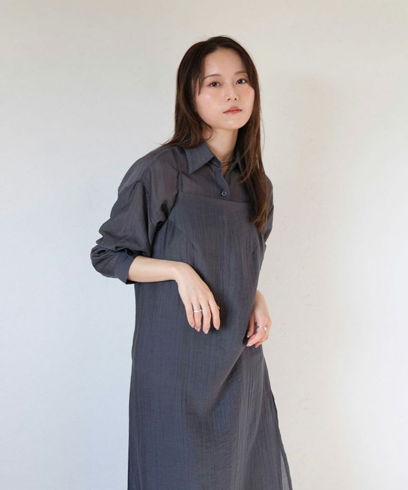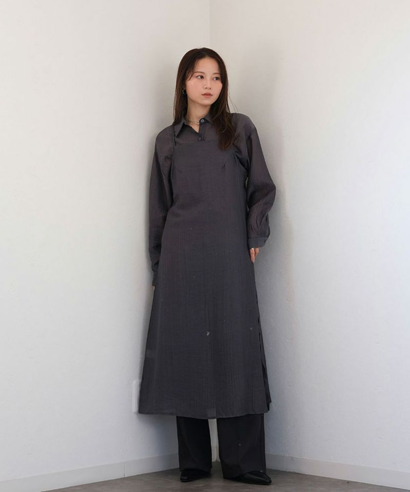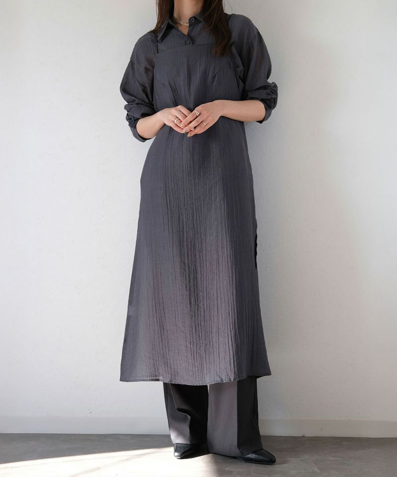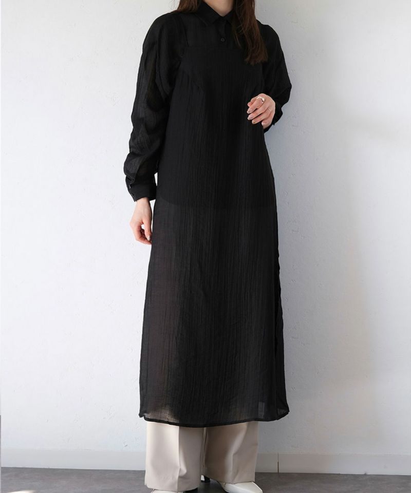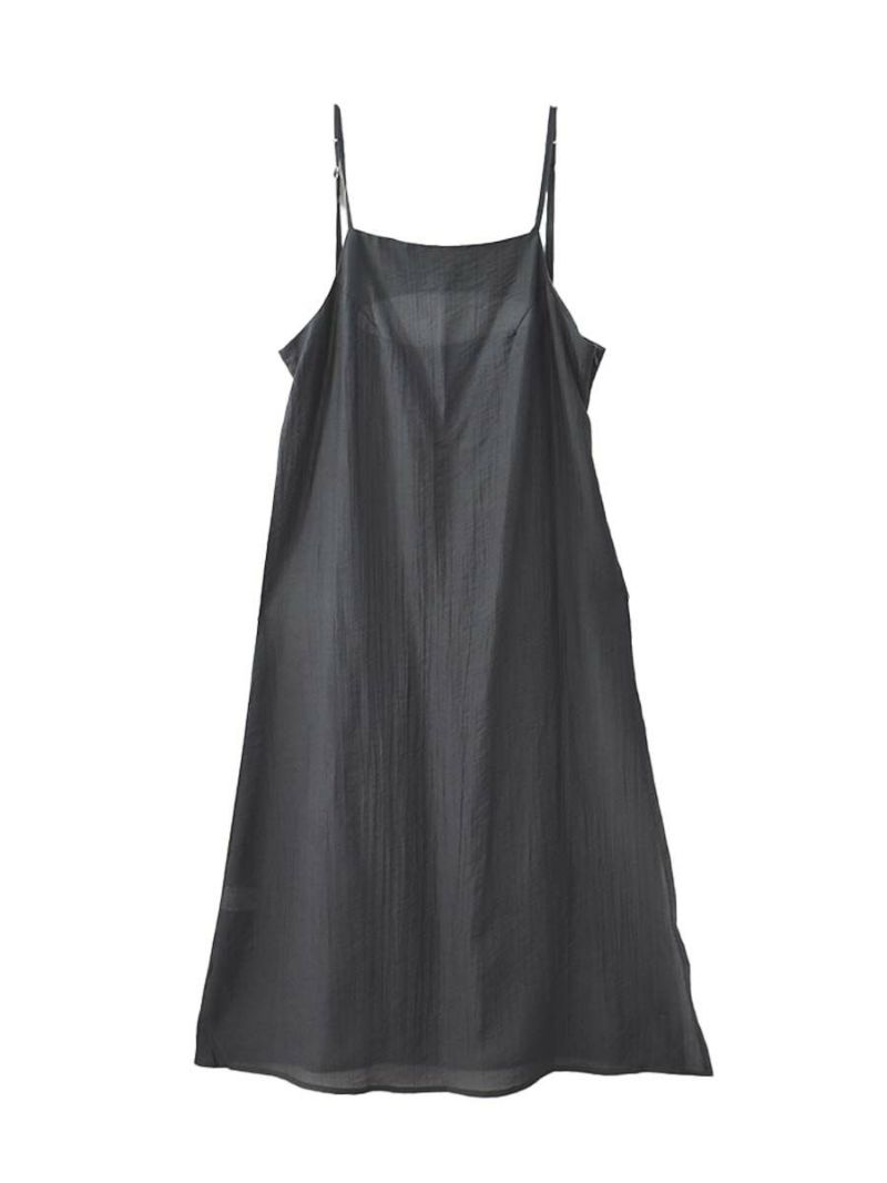 さらっとした着心地と程よい透け感が可愛い ロング丈のキャミワンピース。 サイドスリットが入っているので足さばきの良さはもちろん、 コーディネートに抜け感をプラスしてくれます。 同じ素材で作られた【wrinkle sheer shirt】と合わせて セットアップ風の着こなしも楽しめます。