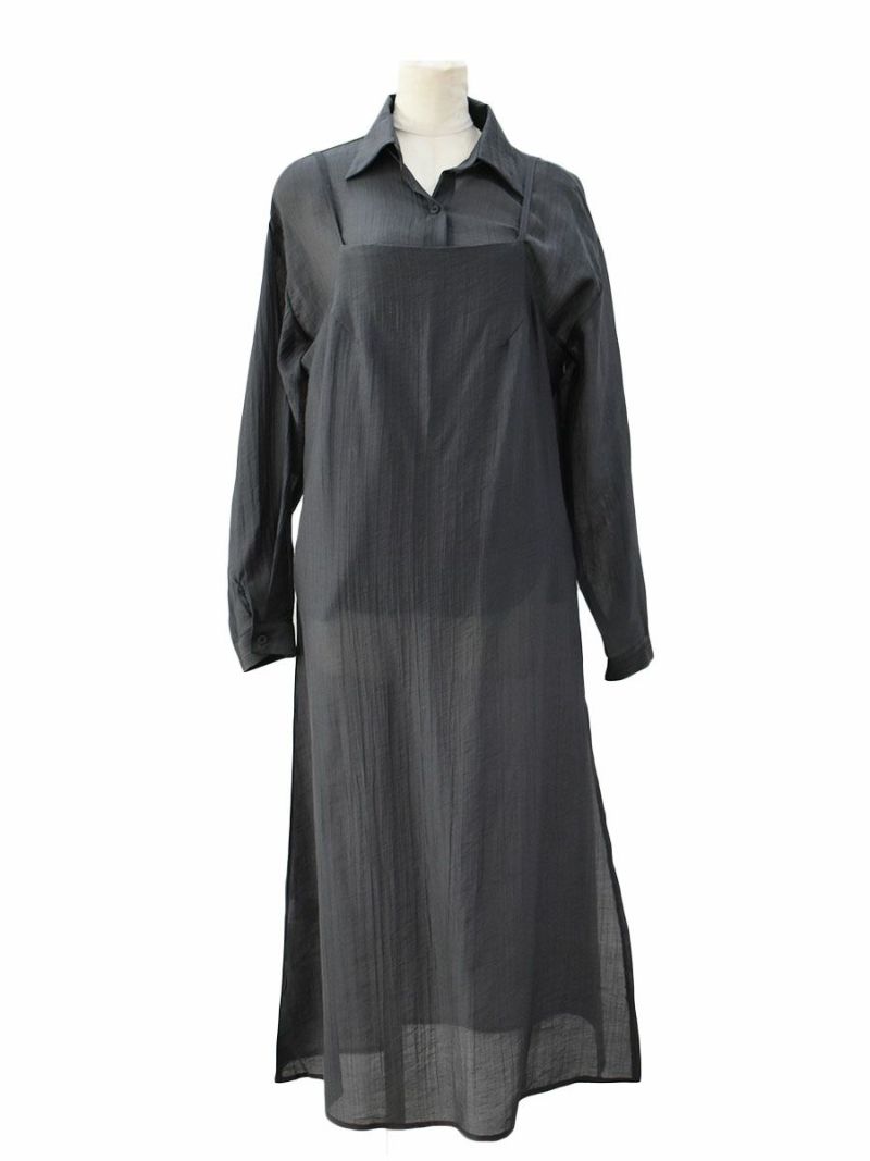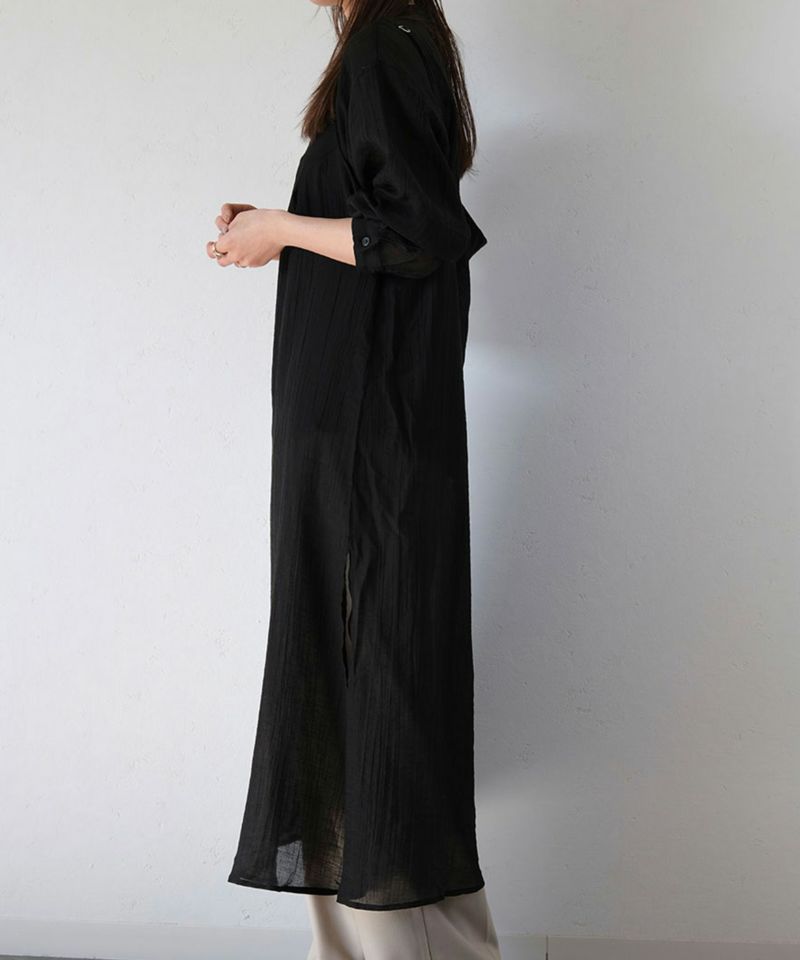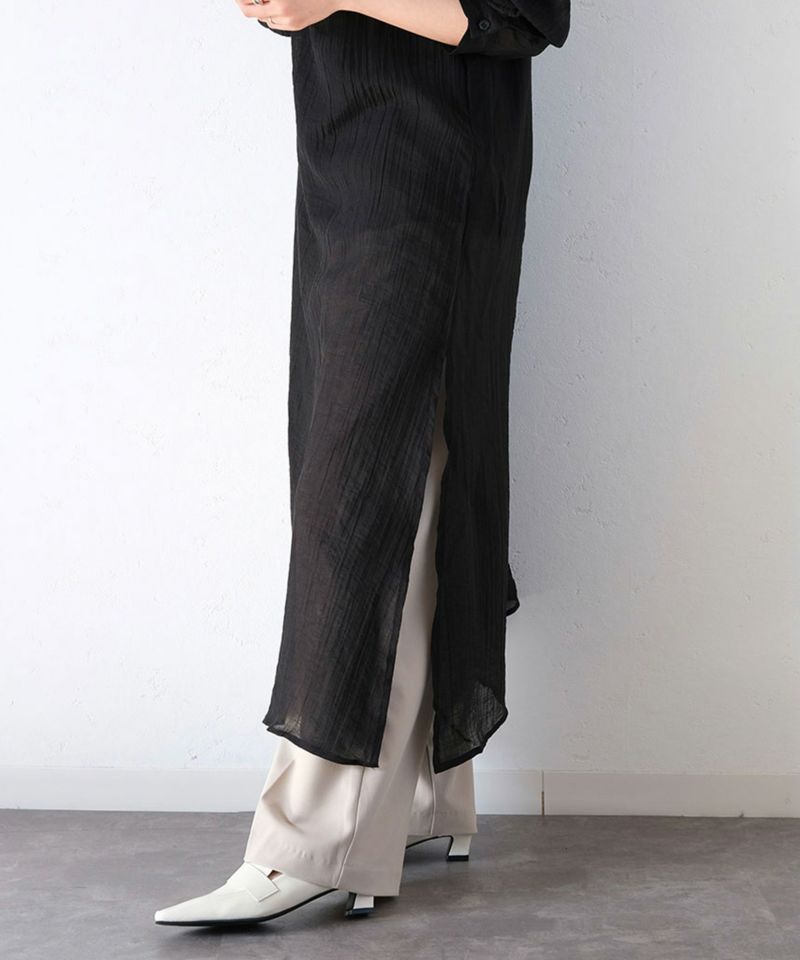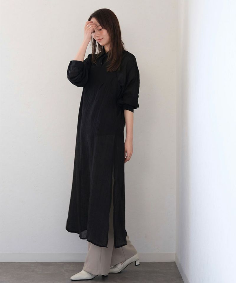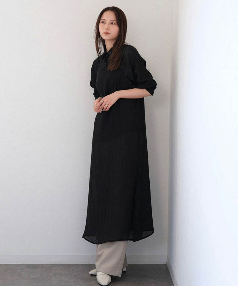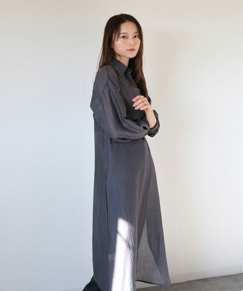 さらっとした着心地と程よい透け感が可愛い ロング丈のキャミワンピース。 サイドスリットが入っているので足さばきの良さはもちろん、 コーディネートに抜け感をプラスしてくれます。 同じ素材で作られた【wrinkle sheer shirt】と合わせて セットアップ風の着こなしも楽しめます。