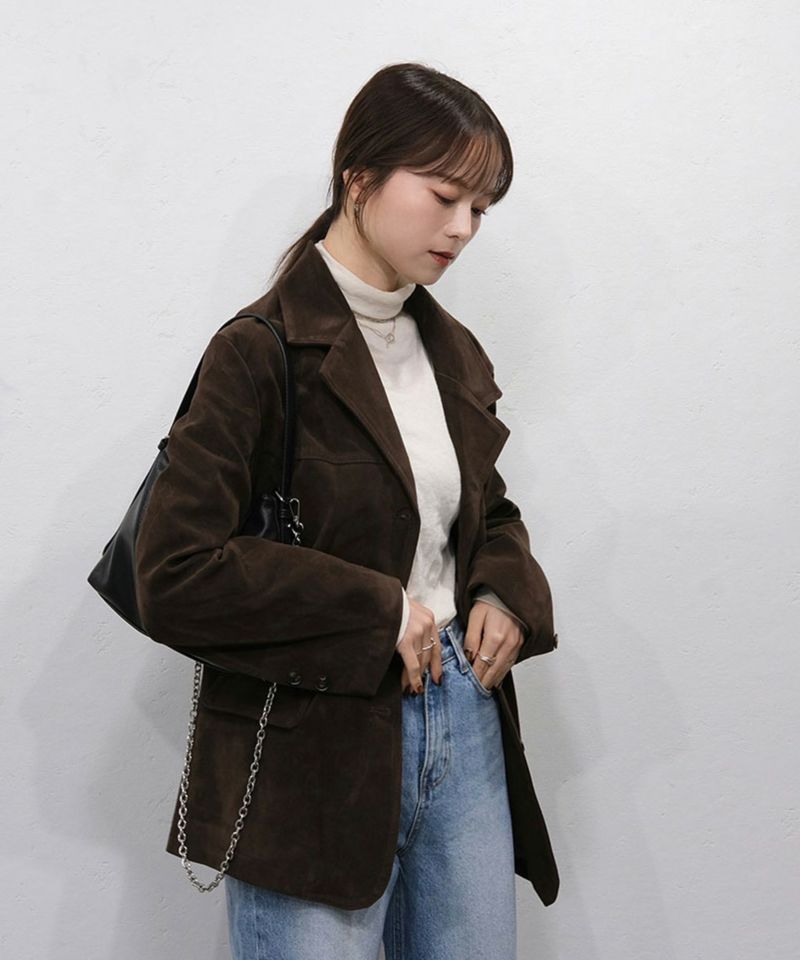 スウェード生地の高見えジャケット。 厚みとハリのある生地感で、 コーディネートに取り入れるだけで、モードカジュアルな印象に◎ 風を通しにくい素材なので、秋冬取り入れたいアイテム。