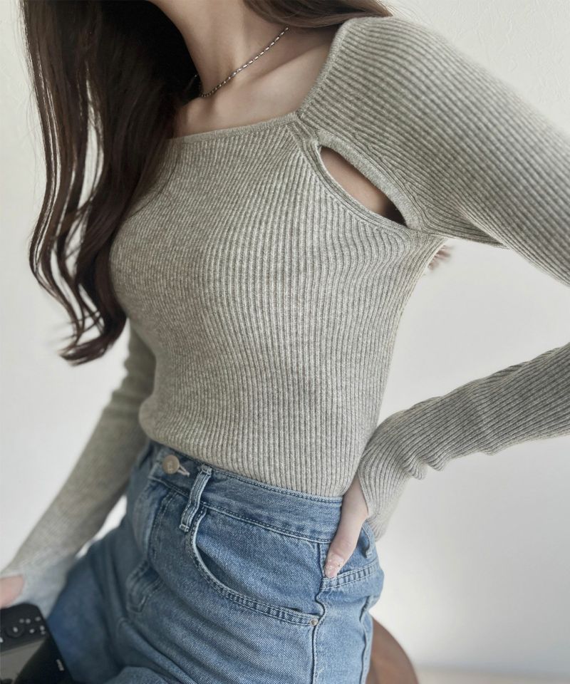 ちらっと肌がのぞくトレンドの カットオフデザインがアクセントのニット。 ヘルシーな肌見せがかないます♡