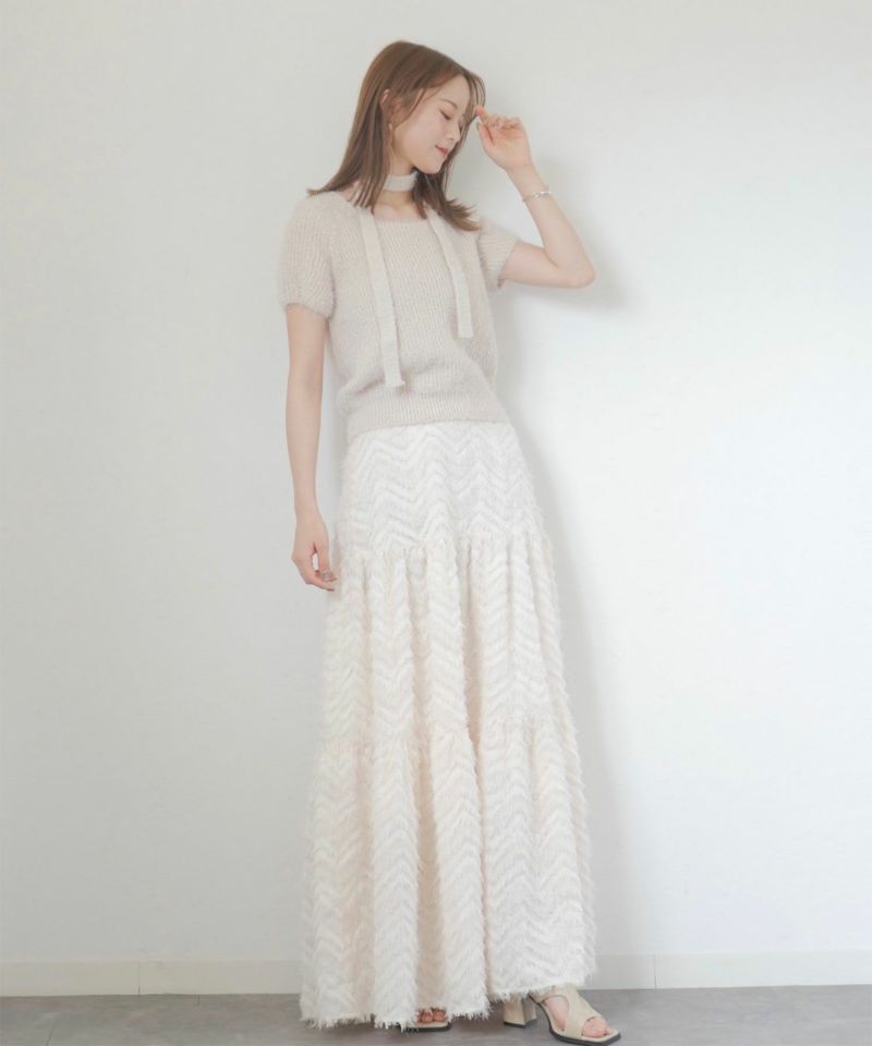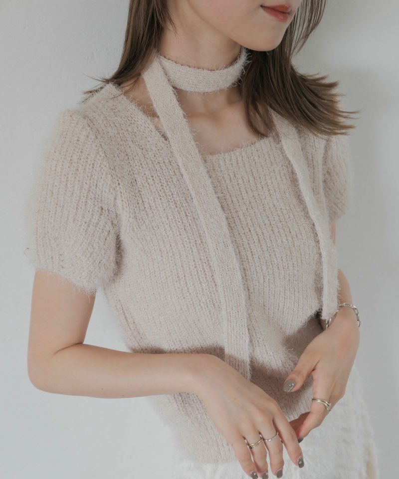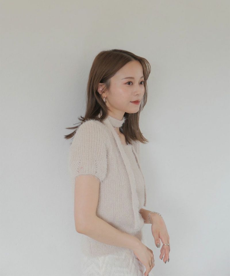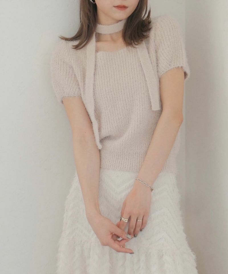 1枚で旬なスタイリングに仕上がるチョーカー付きトップス。 シャギー調の存在感のある生地の半袖ニットと 同生地のチョーカーがセットになったアイテム。 チョーカー部分は付属品なのでその日のコーディネートに合わせて 付けたり外したりのアレンジが可能◎ さらに長め仕様になっている為、結び方も様々なアレンジが楽しめます♪