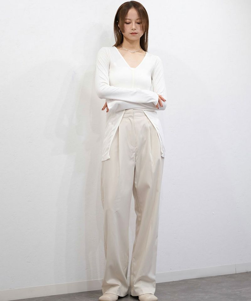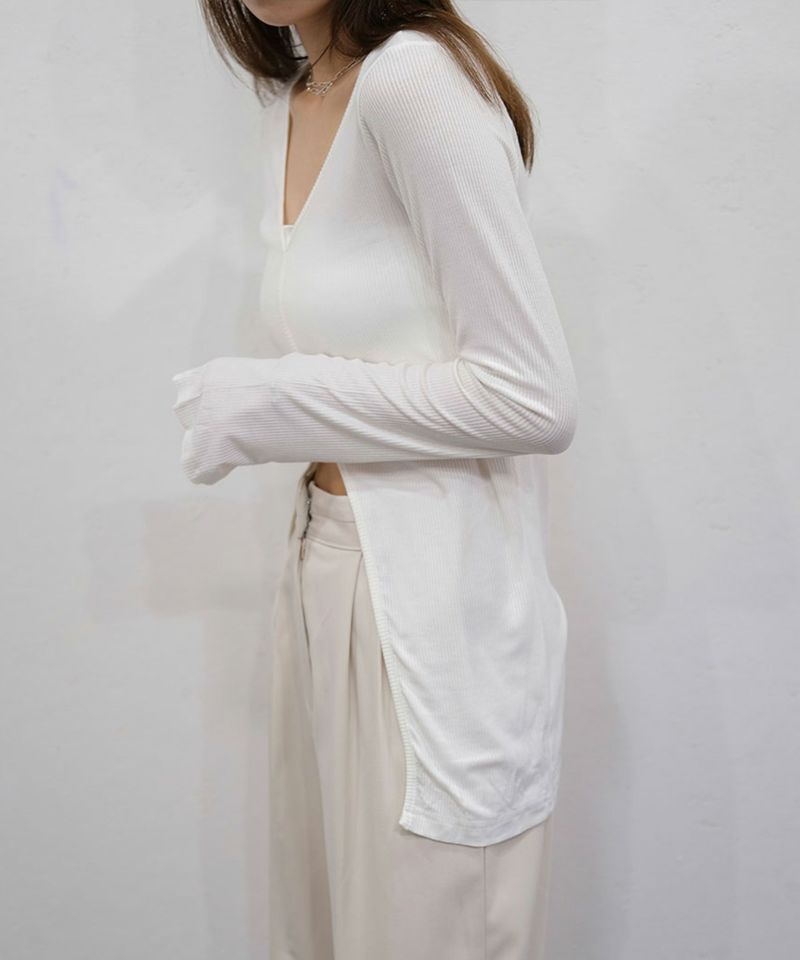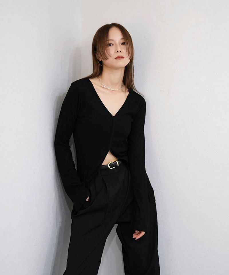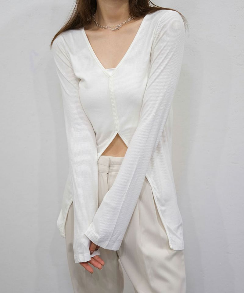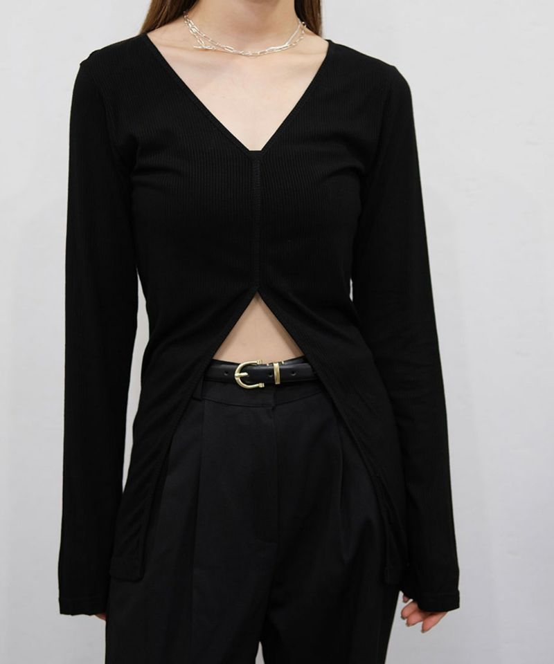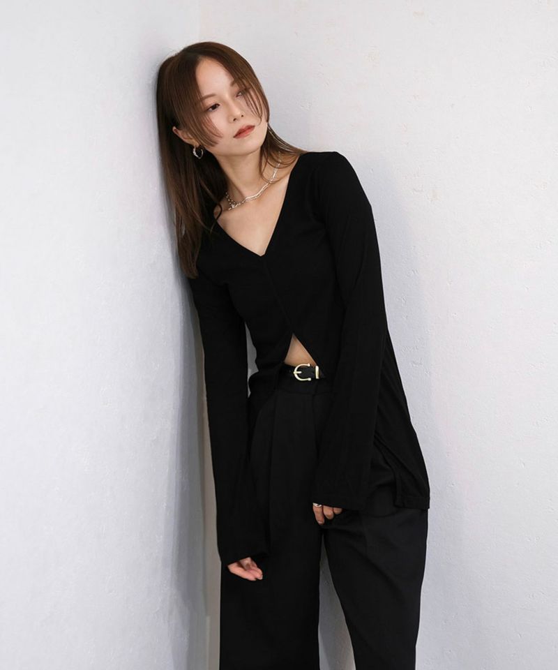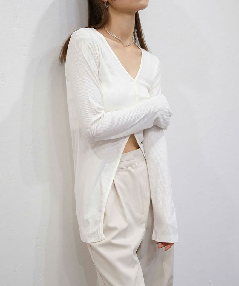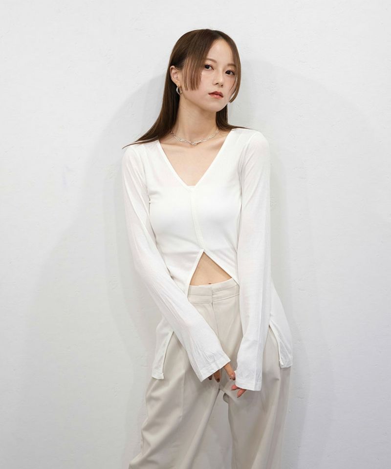 フロントに大きく入ったスリットでトレンド感のあるヘルシーな着こなしが叶うトップス。