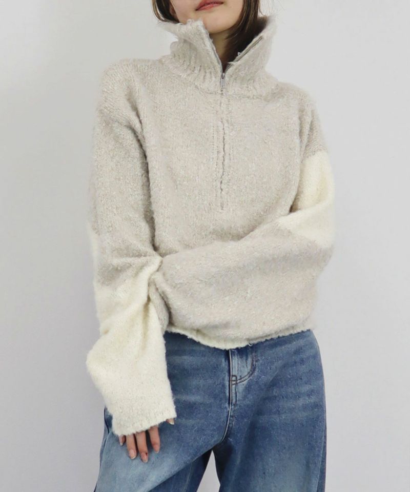 柔らかなブークレ素材を使用したハイネックプルオーバー。 ニュアンスパターン柄がシンプルながらも存在感のあるアイテム。 1枚でコーディネートの主役になってくれます◎ 首元はハーフジップになっているので、 合わせるアイテムやシーンに合わせて 違った着こなしを楽しめるのも魅力のひとつ。