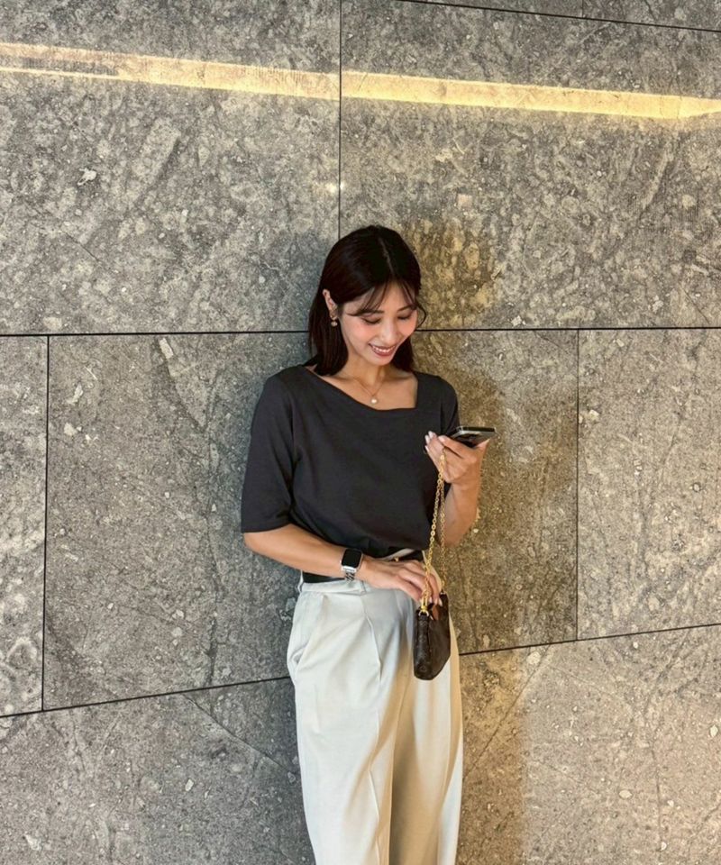 着るだけで大人見えしてくれるアイテム。ゆとりのあるサイズなので、細見えします。