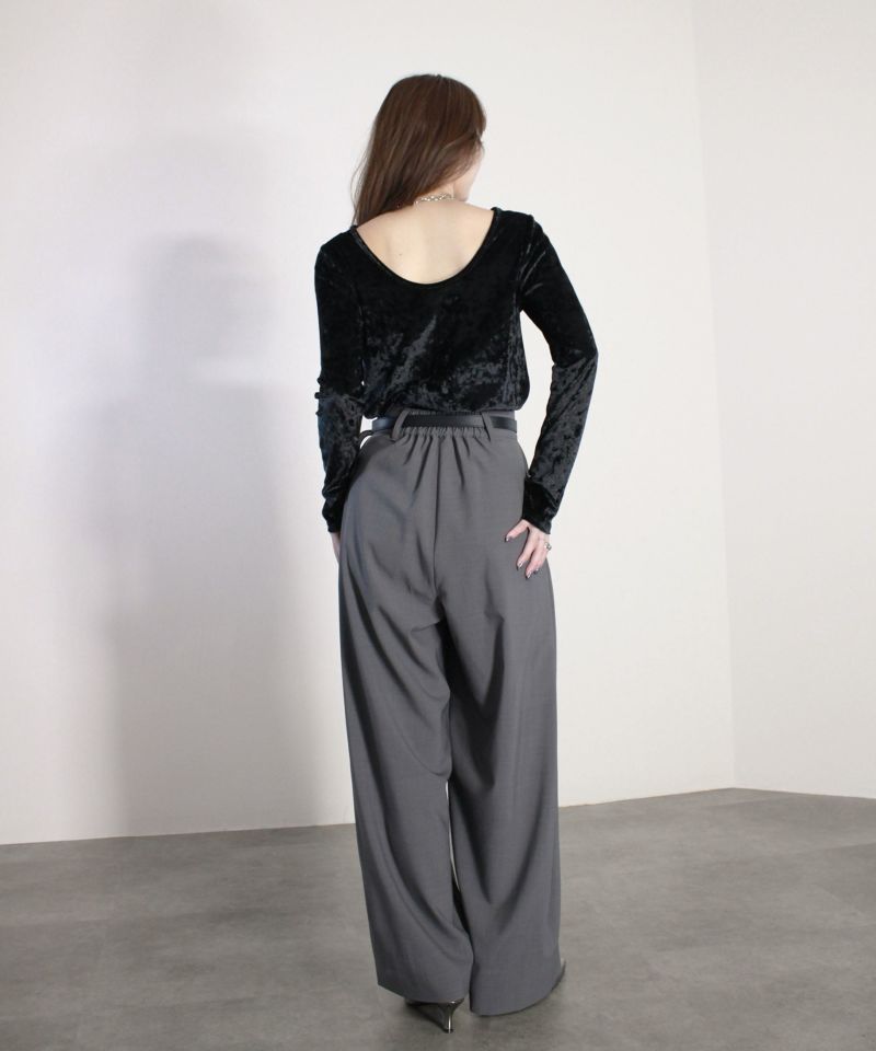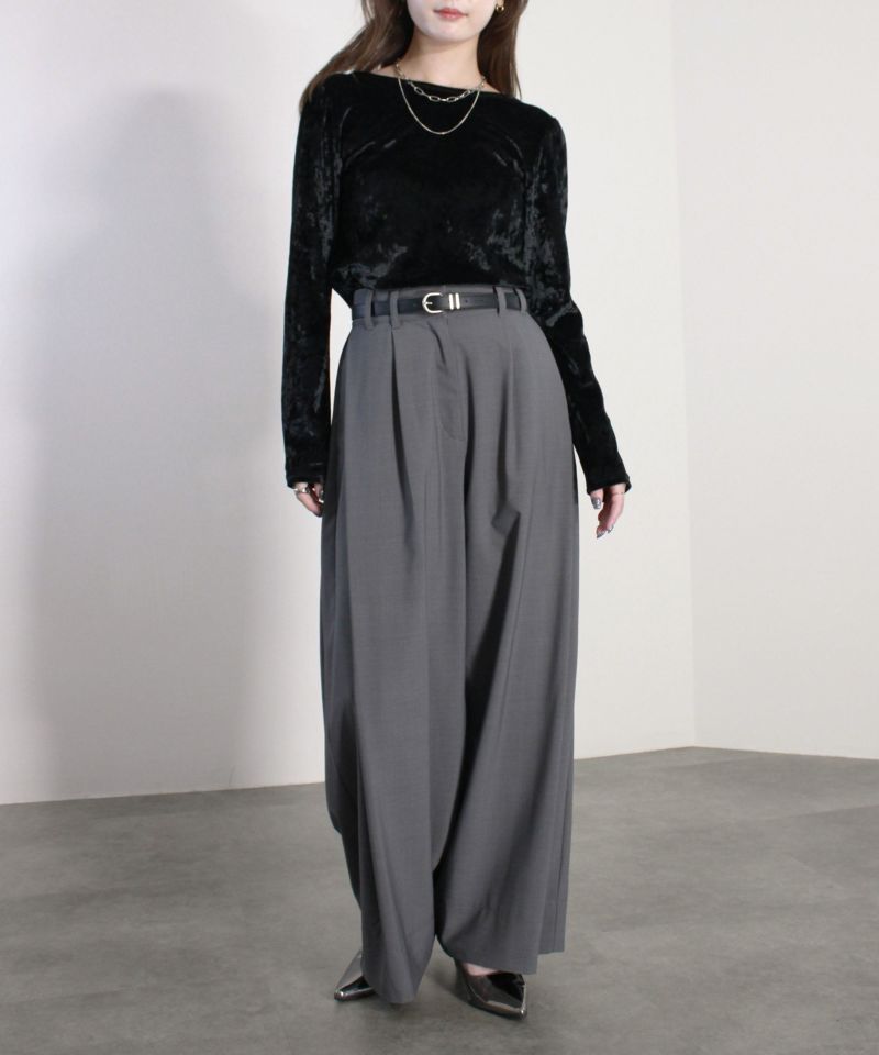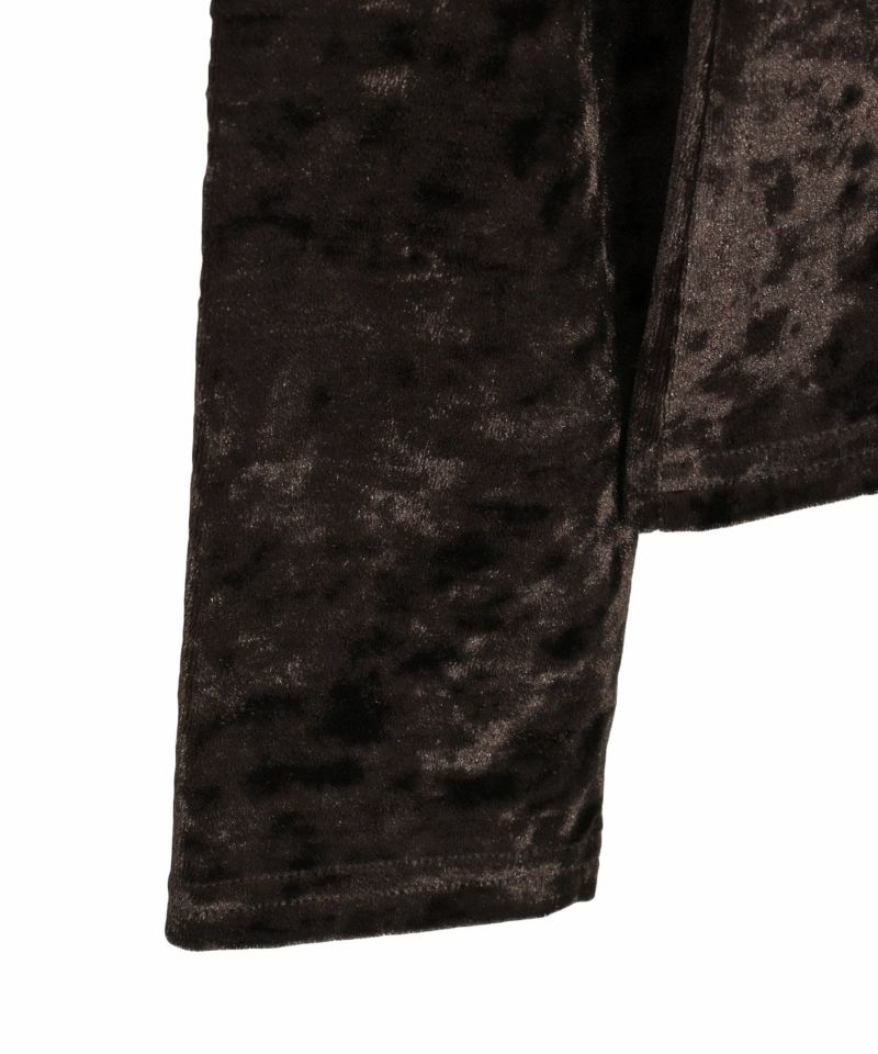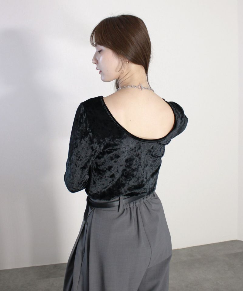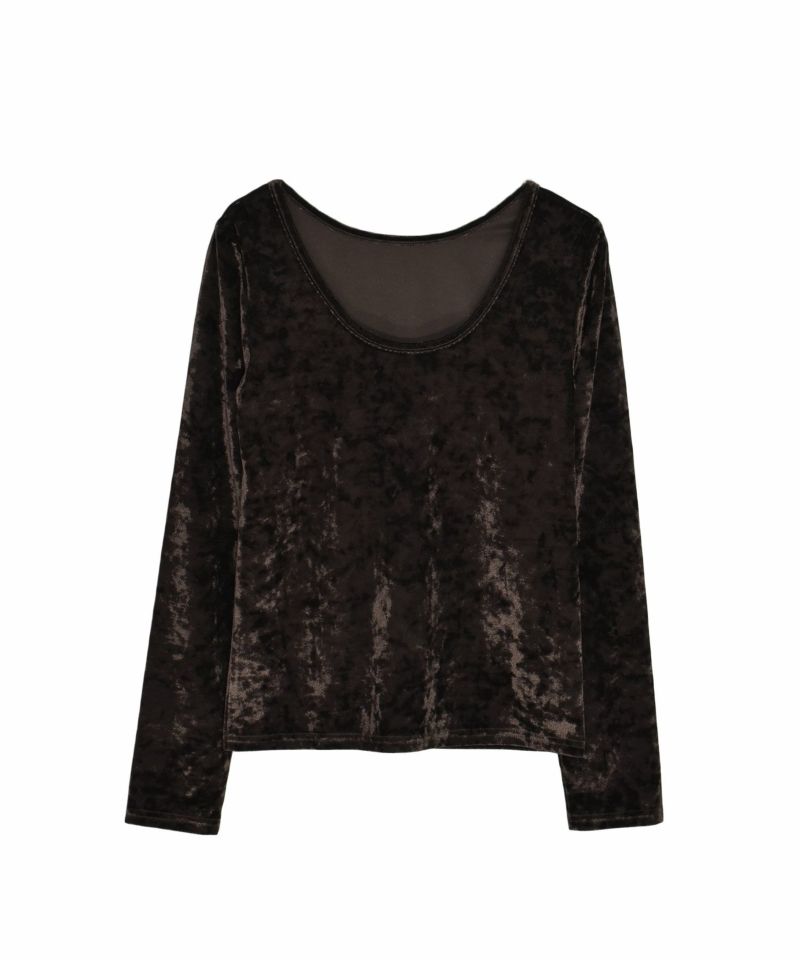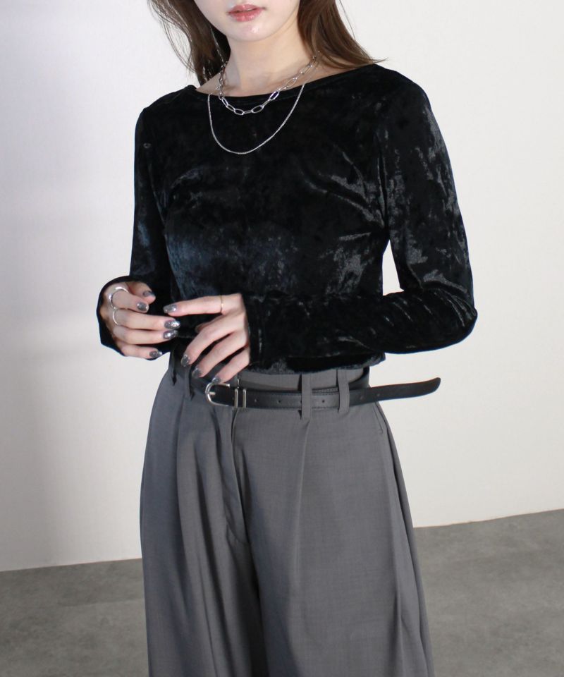 シンプルなシルエットながら、光沢感のあるベロア生地が存在感を放つ長袖トップス。