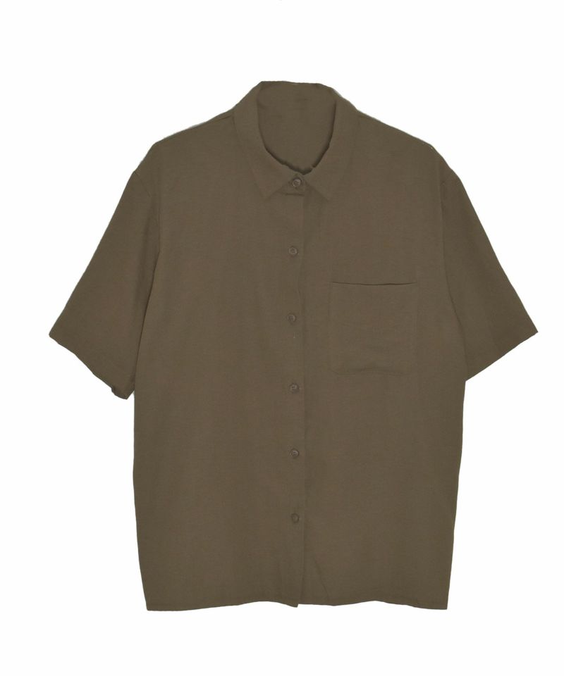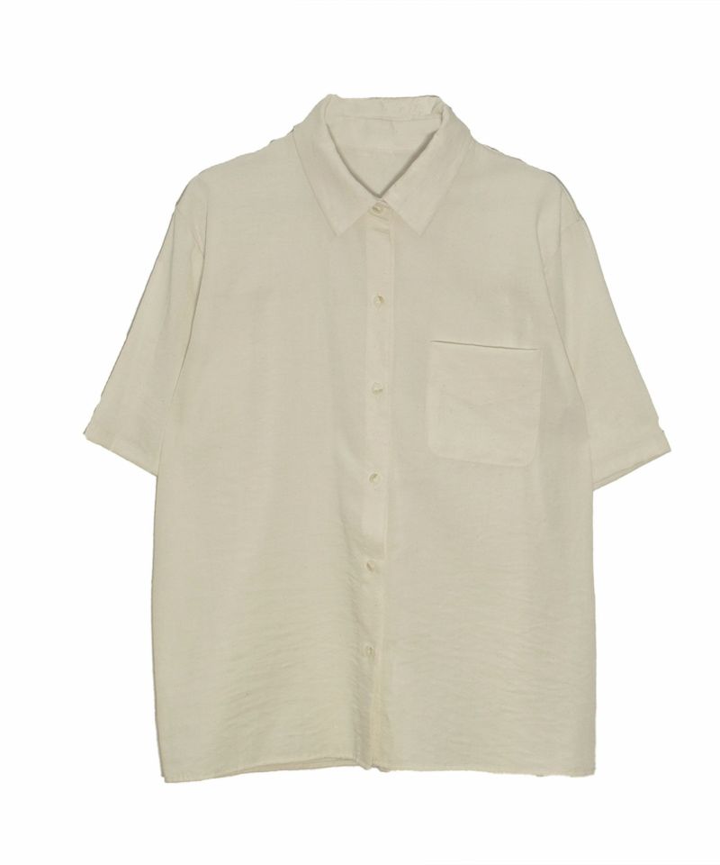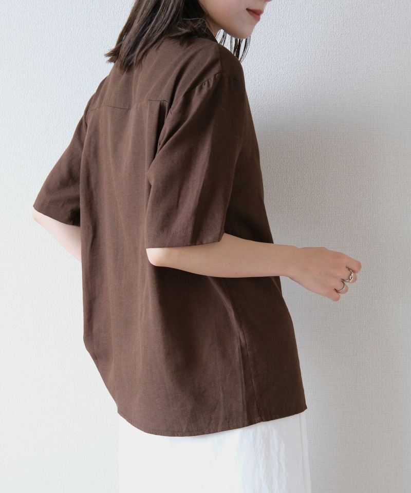 シンプルで上品な印象を与える、半袖のオープンカラーシャツ。