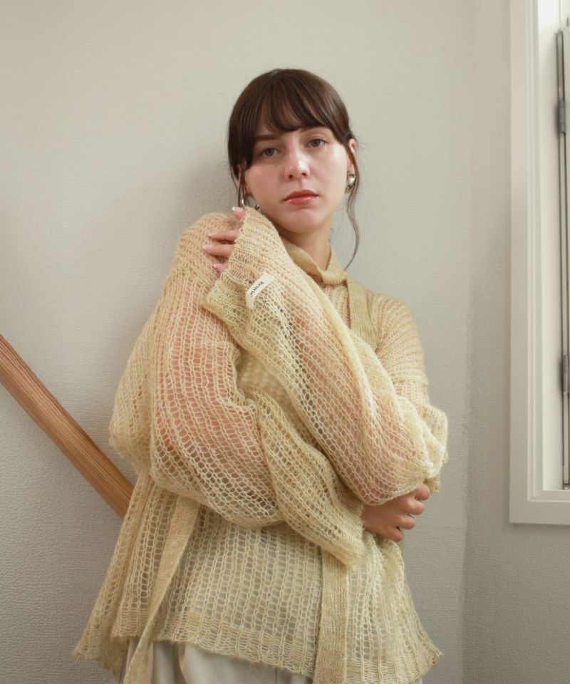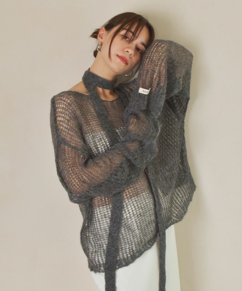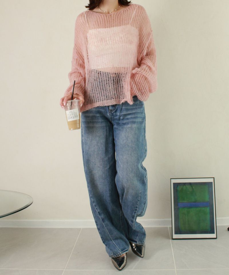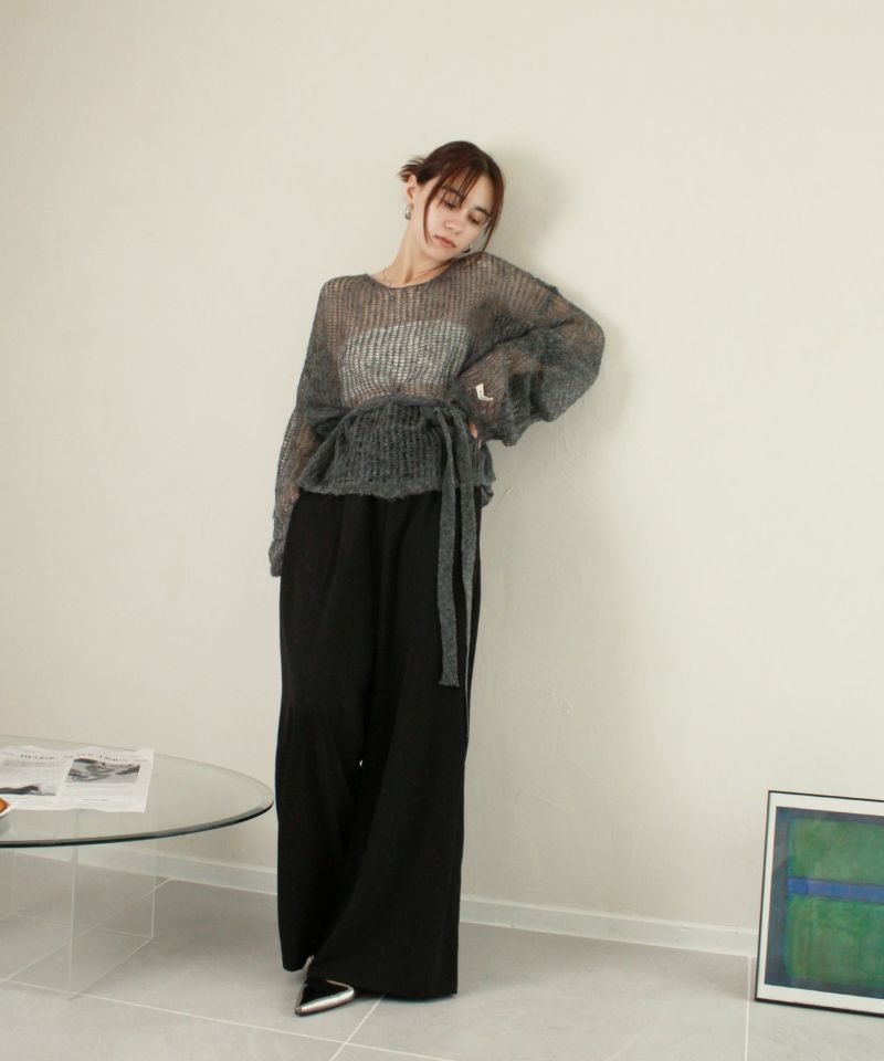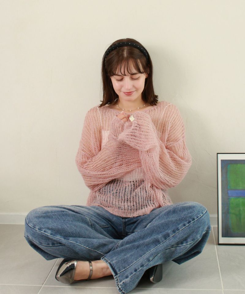 ローゲージのざっくりとした編み地が、抜け感を演出するシアーニットトップス。