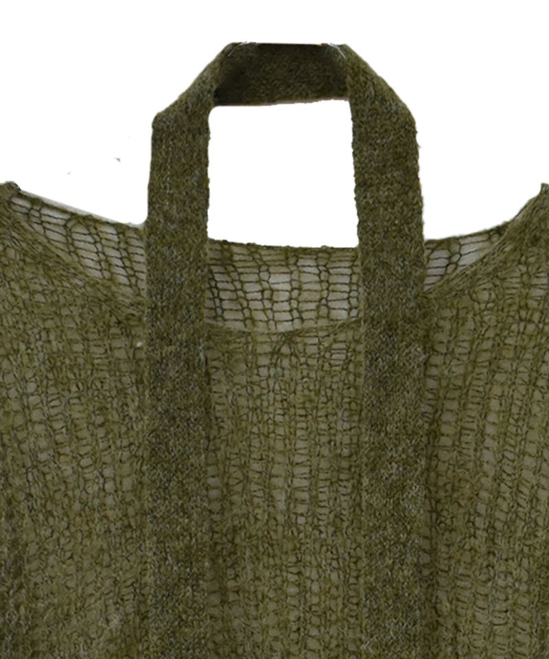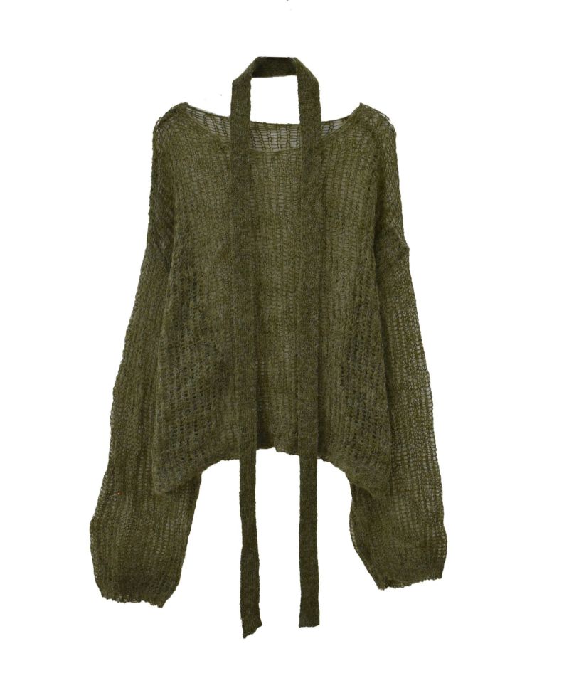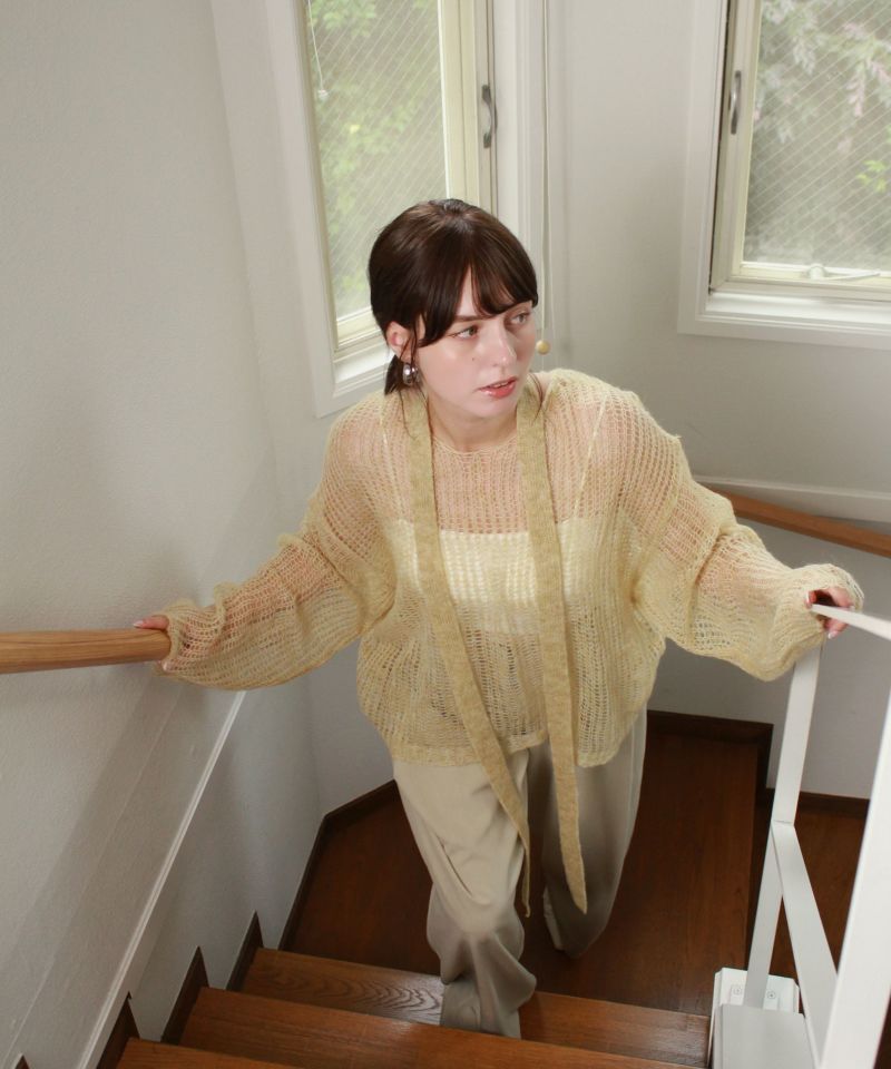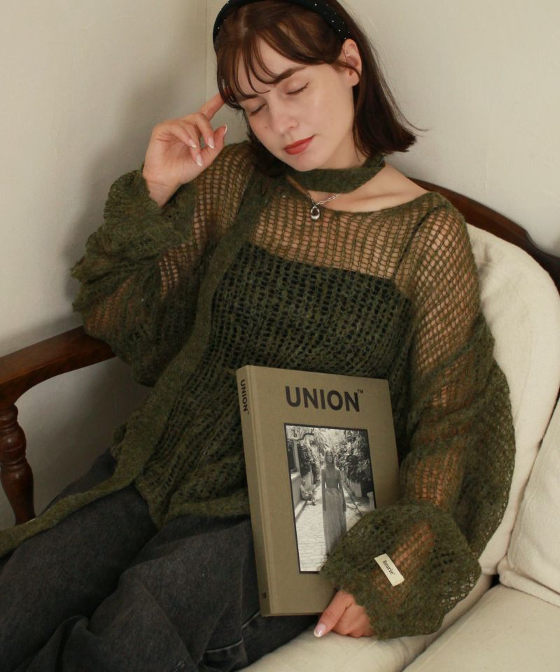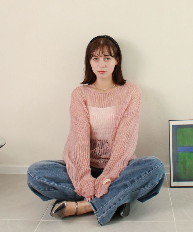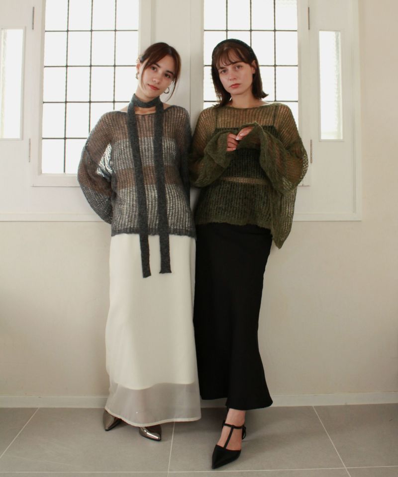 ローゲージのざっくりとした編み地が、抜け感を演出するシアーニットトップス。