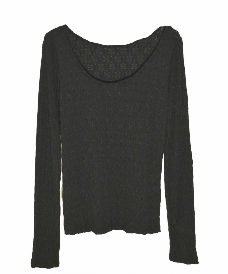 深めに開いたラウンドネックがデコルテを美しく見せ、程よい抜け感を演出します。