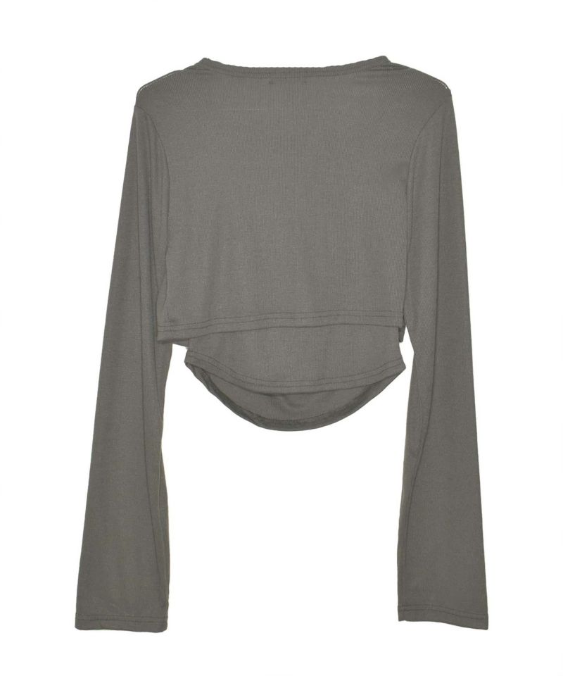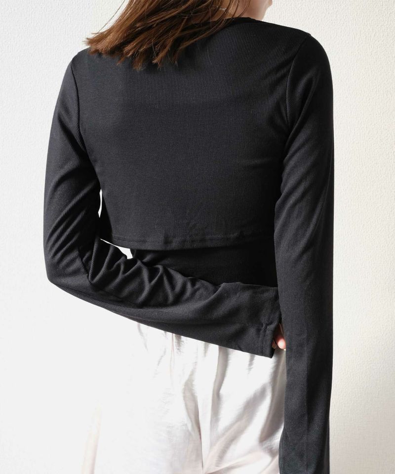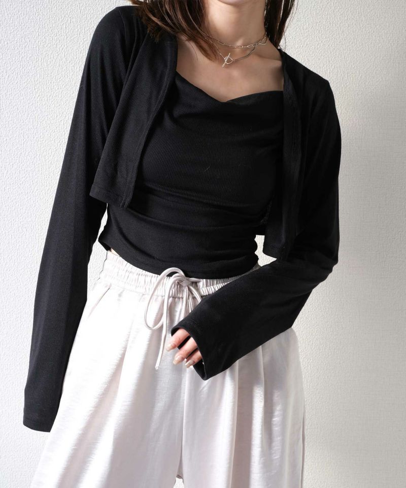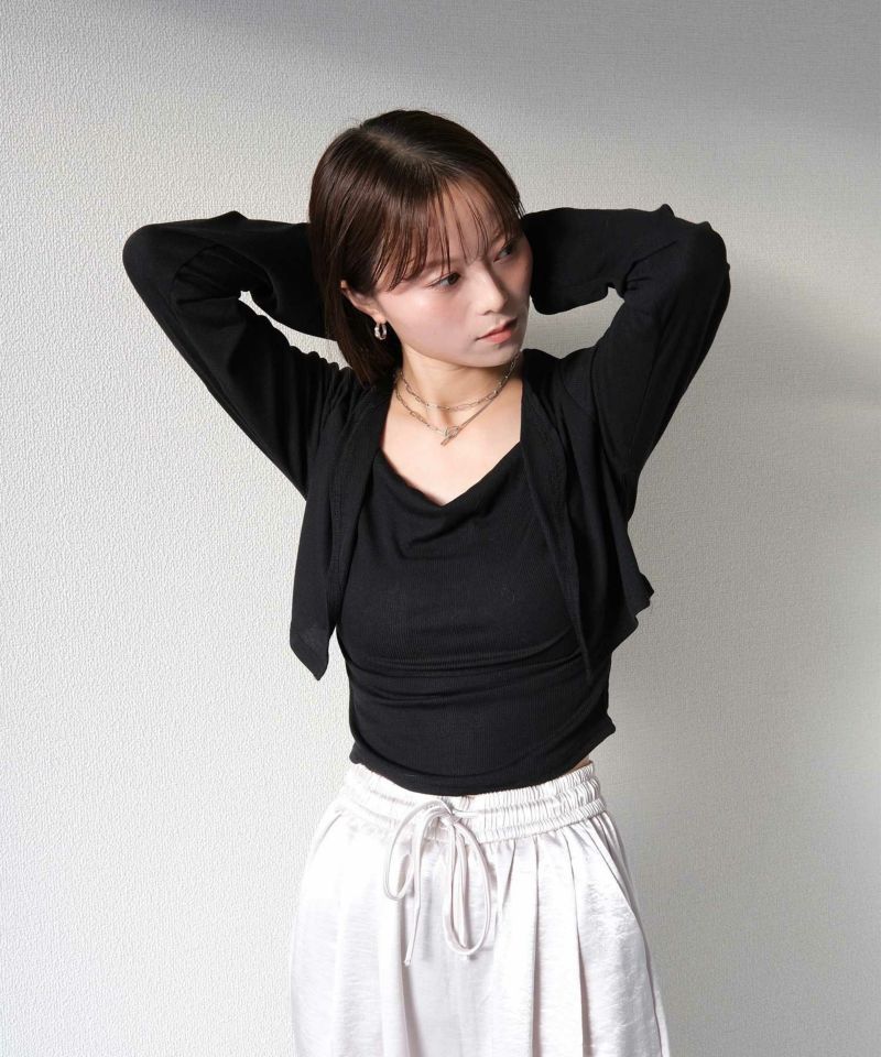 ショート丈の羽織りとインナーのフロントに施されたドレープディテールが立体感を演出。