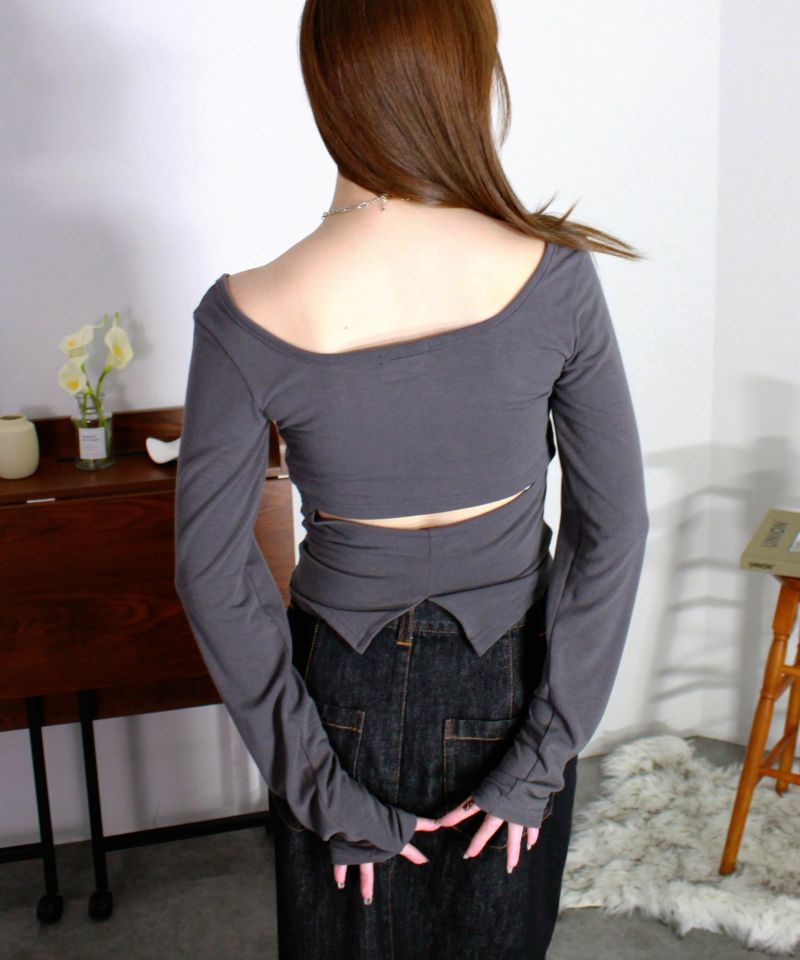 フロントはシンプルかつ洗練されたスクエアネックで、デコルテラインを美しく見せる長袖トップス。 バックスタイルは大胆なカッティングが特徴で、腰元にかけて曲線を描くように開いたデザインが印象的。 前後で表情がガラリと変わるため、一枚で主役級の存在感を放ちます。